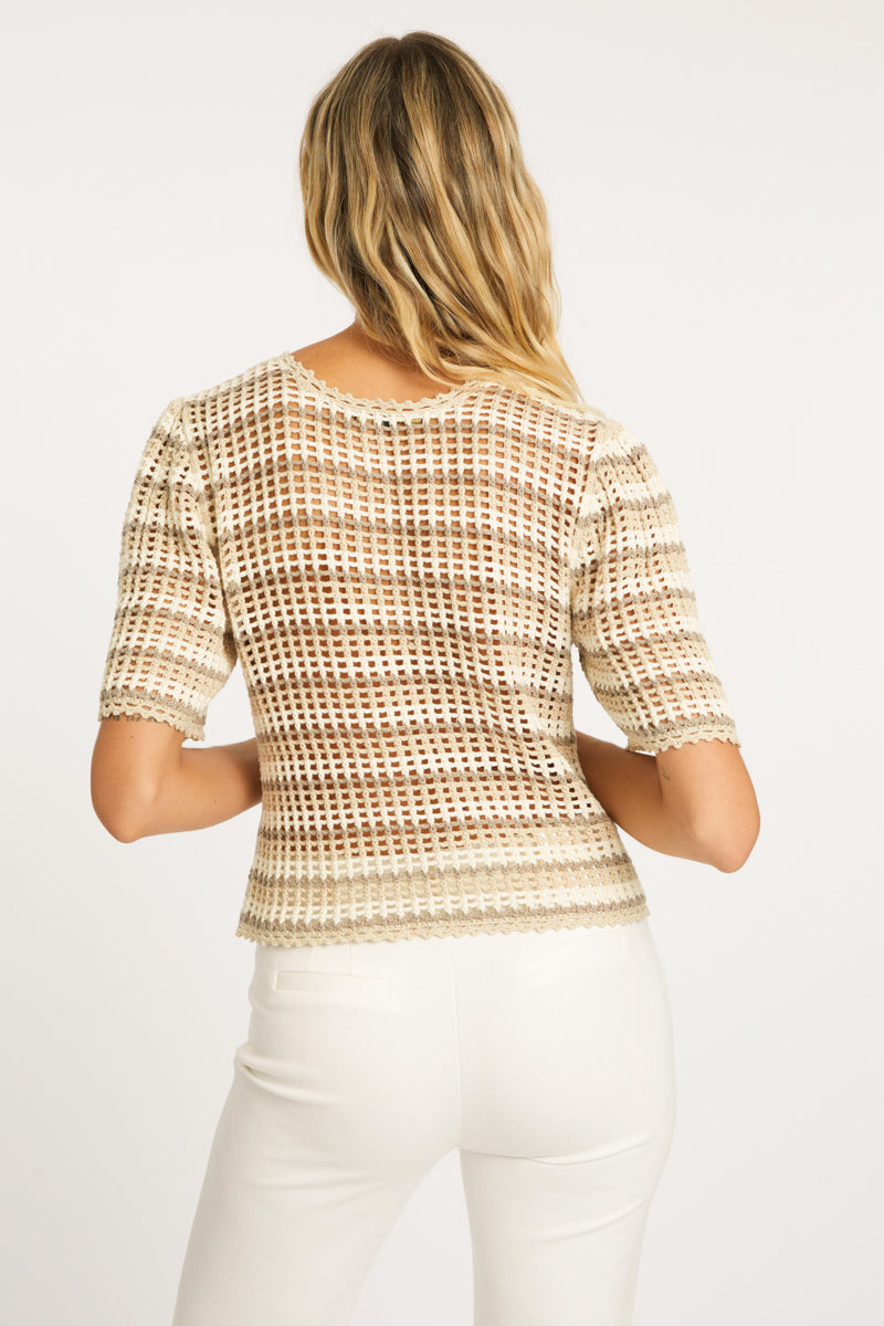Step into spring with the effortless charm of the Agata sweater, a lightweight crocheted top that blends comfort and style. Designed with a timeless tricolor striped neutral pattern, this piece is perfect for adding a touch of elegance to your everyday wardrobe. The breezy design makes it ideal for sunny days and mild evenings.