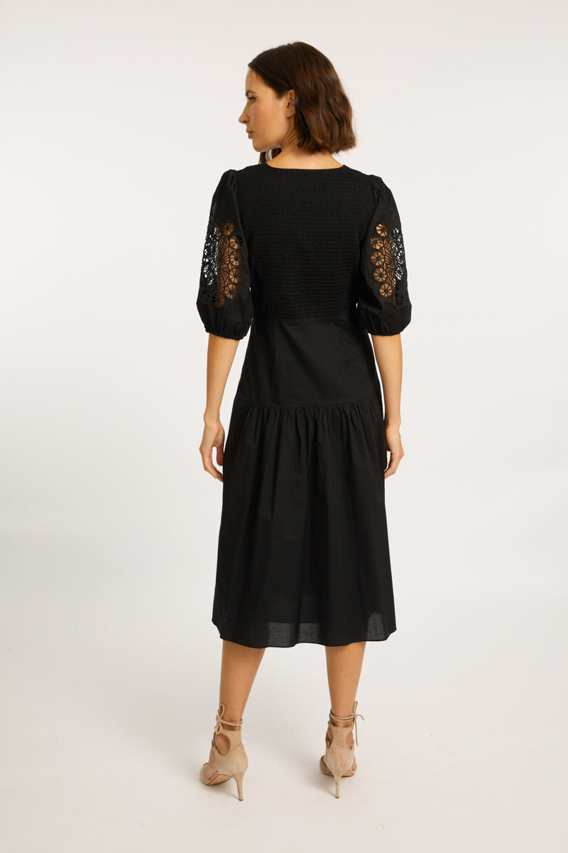 The Aletta Dress in solid black is a sophisticated and versatile piece, crafted from 100% cotton for comfort and breathability. The sleeves are adorned with black lace embroidery, adding a delicate touch of texture and femininity. The back features smocking for a flattering, stretchy fit, while a front bow at the waist adds a playful yet refined detail.