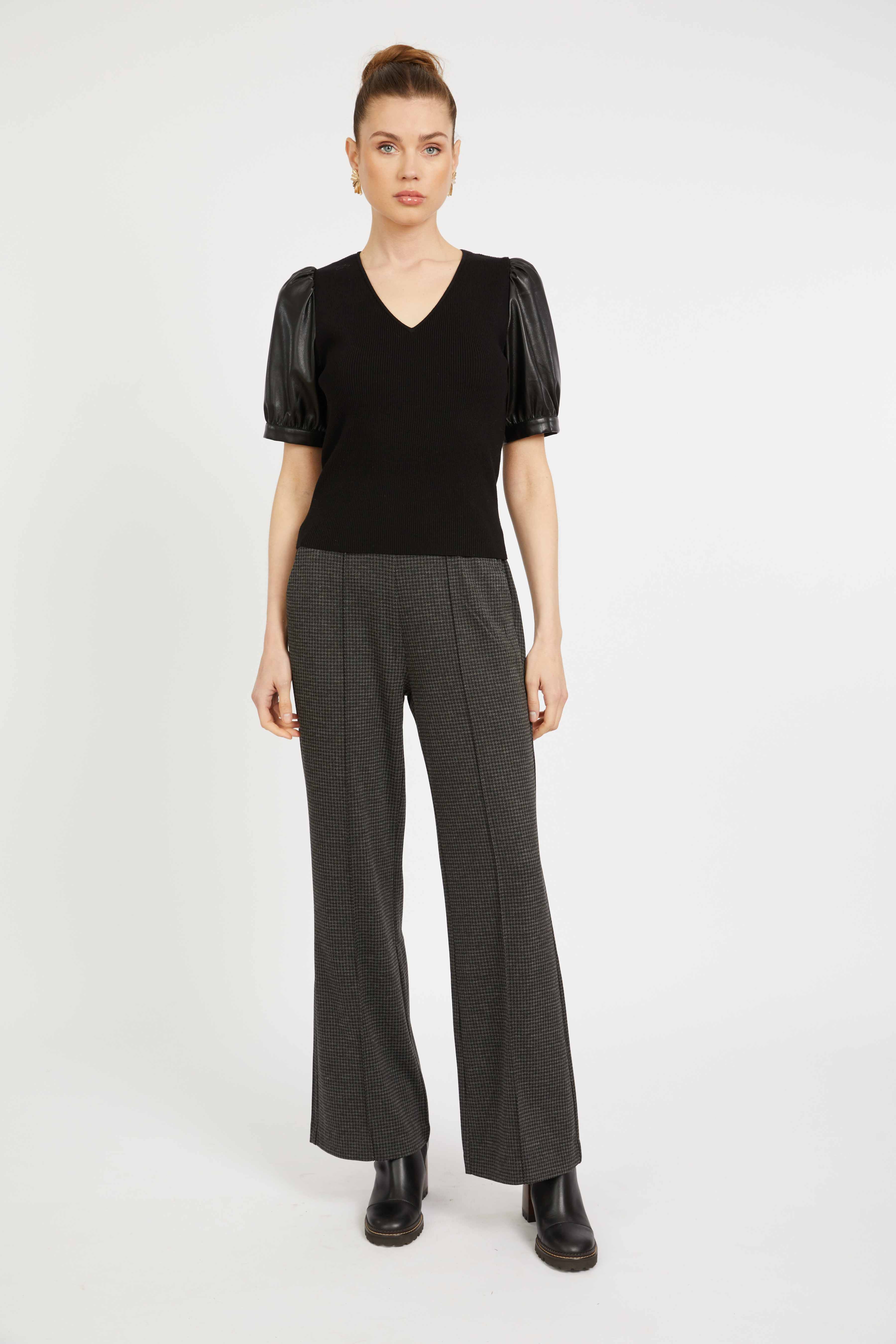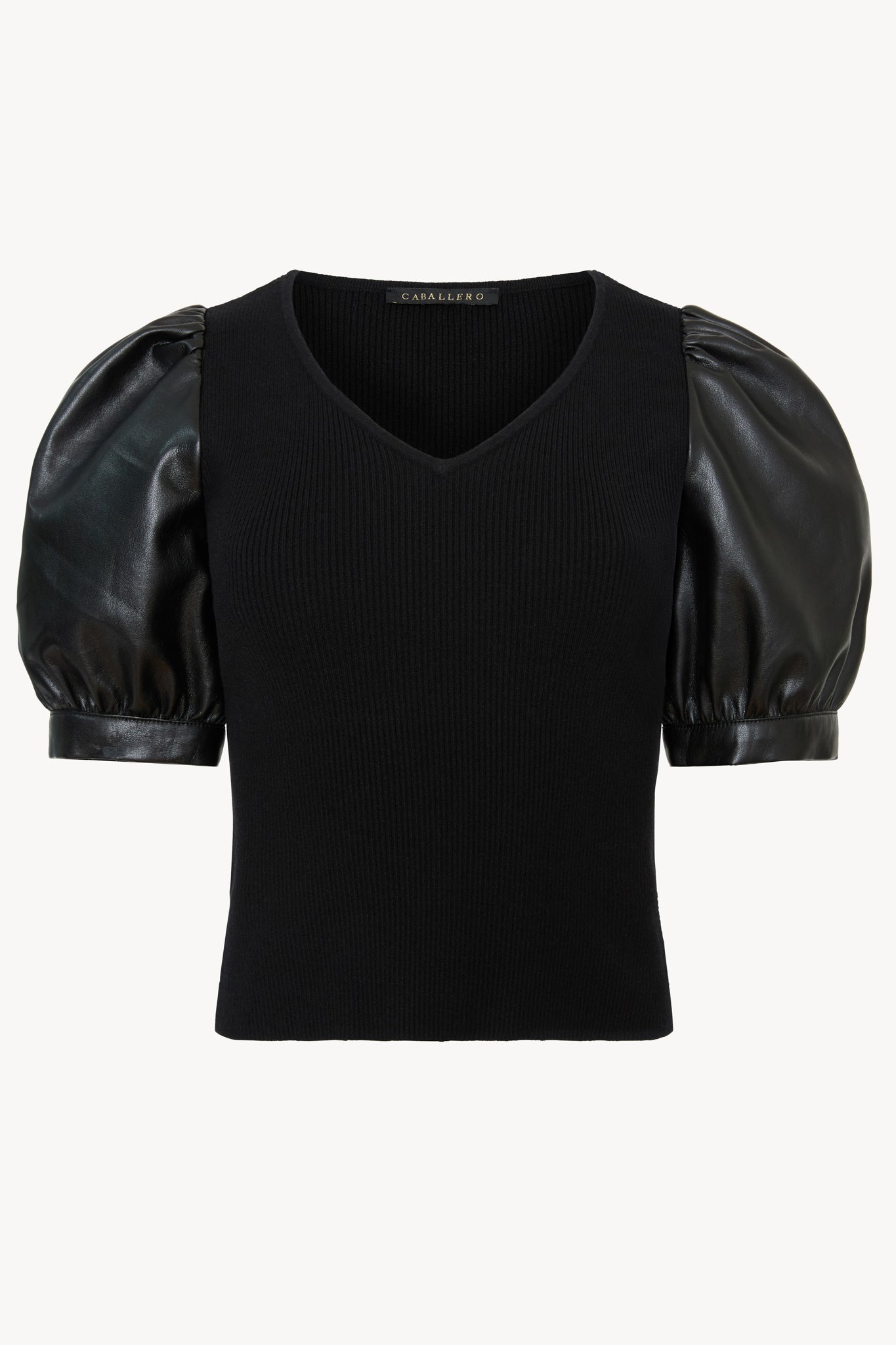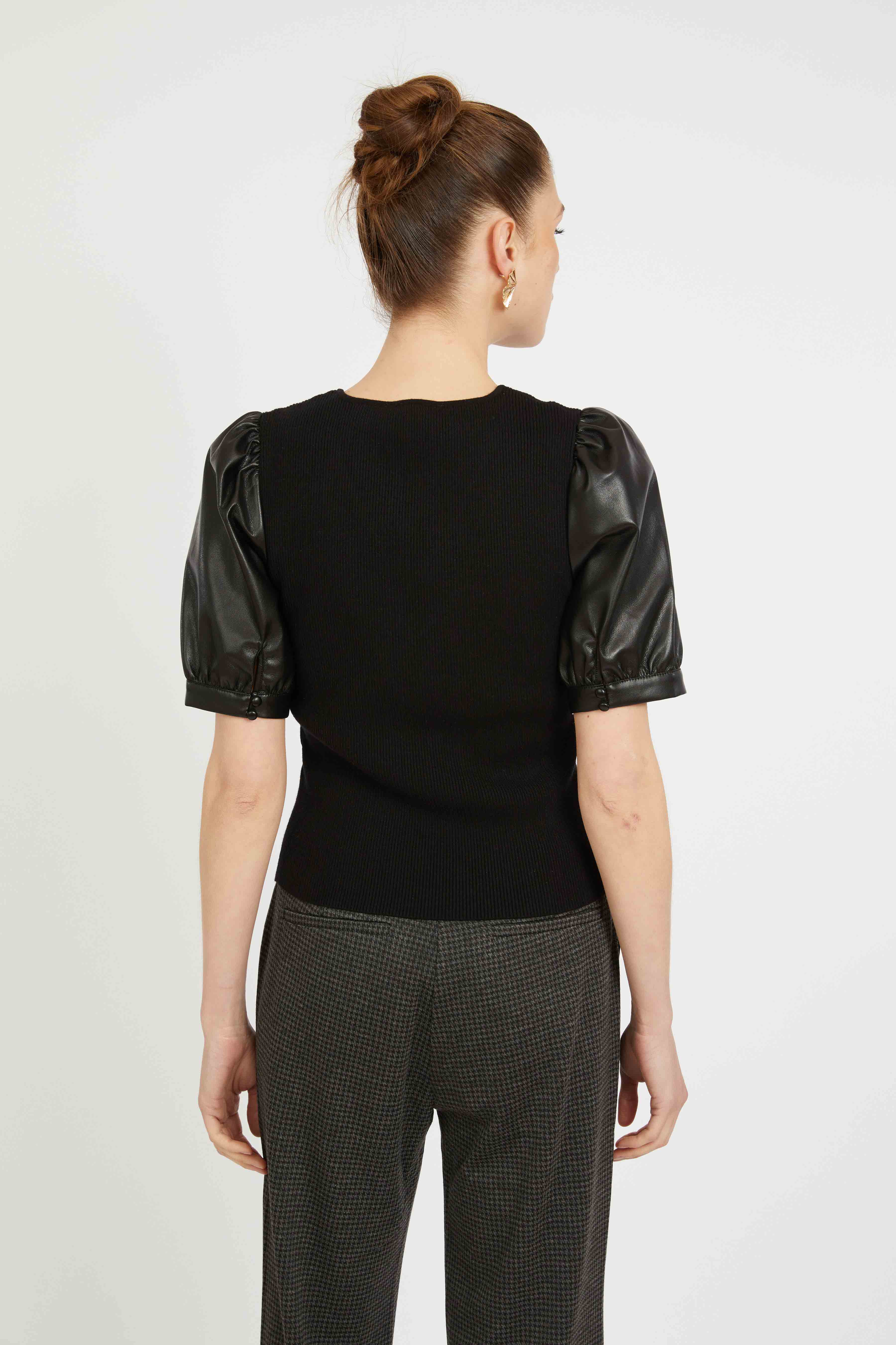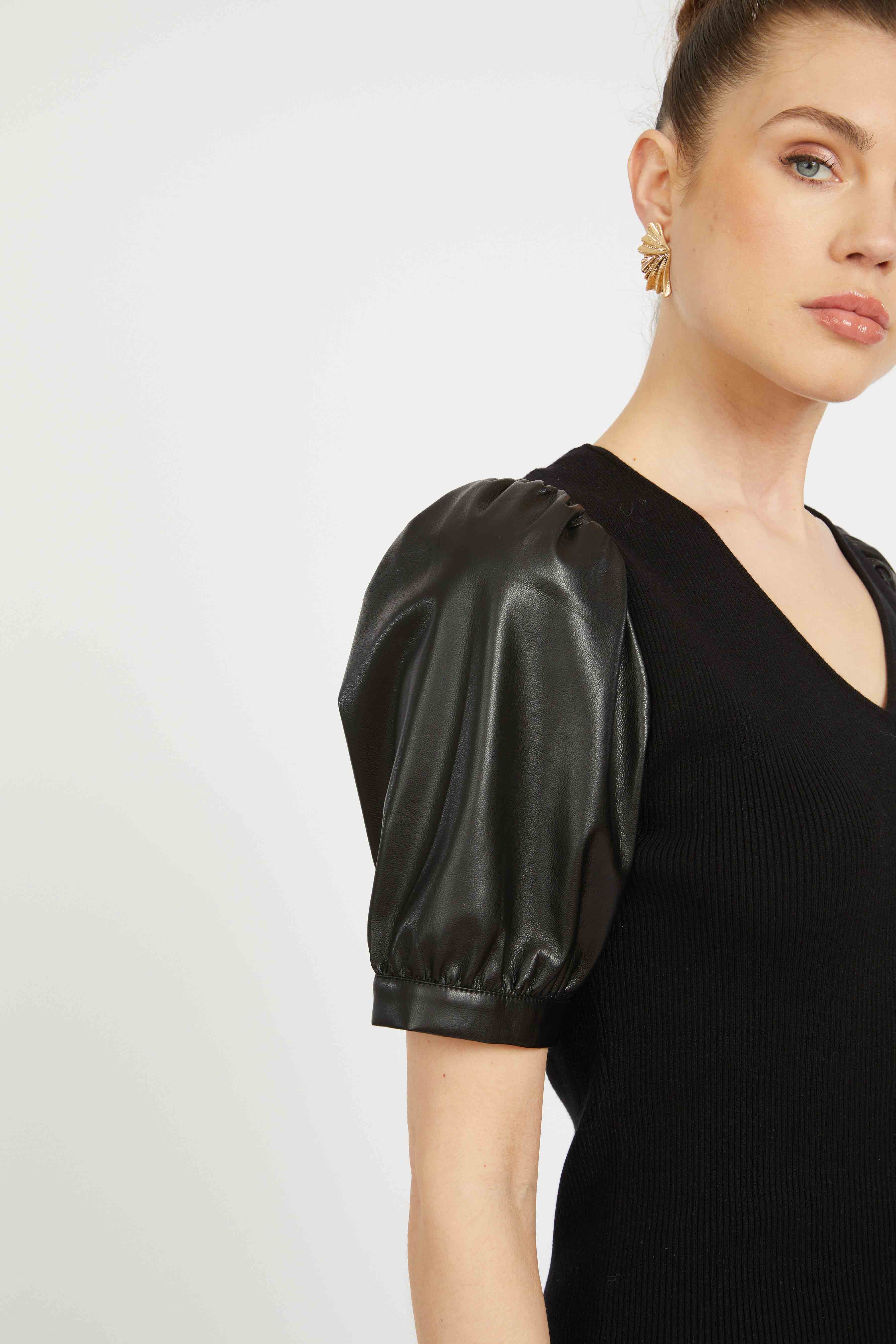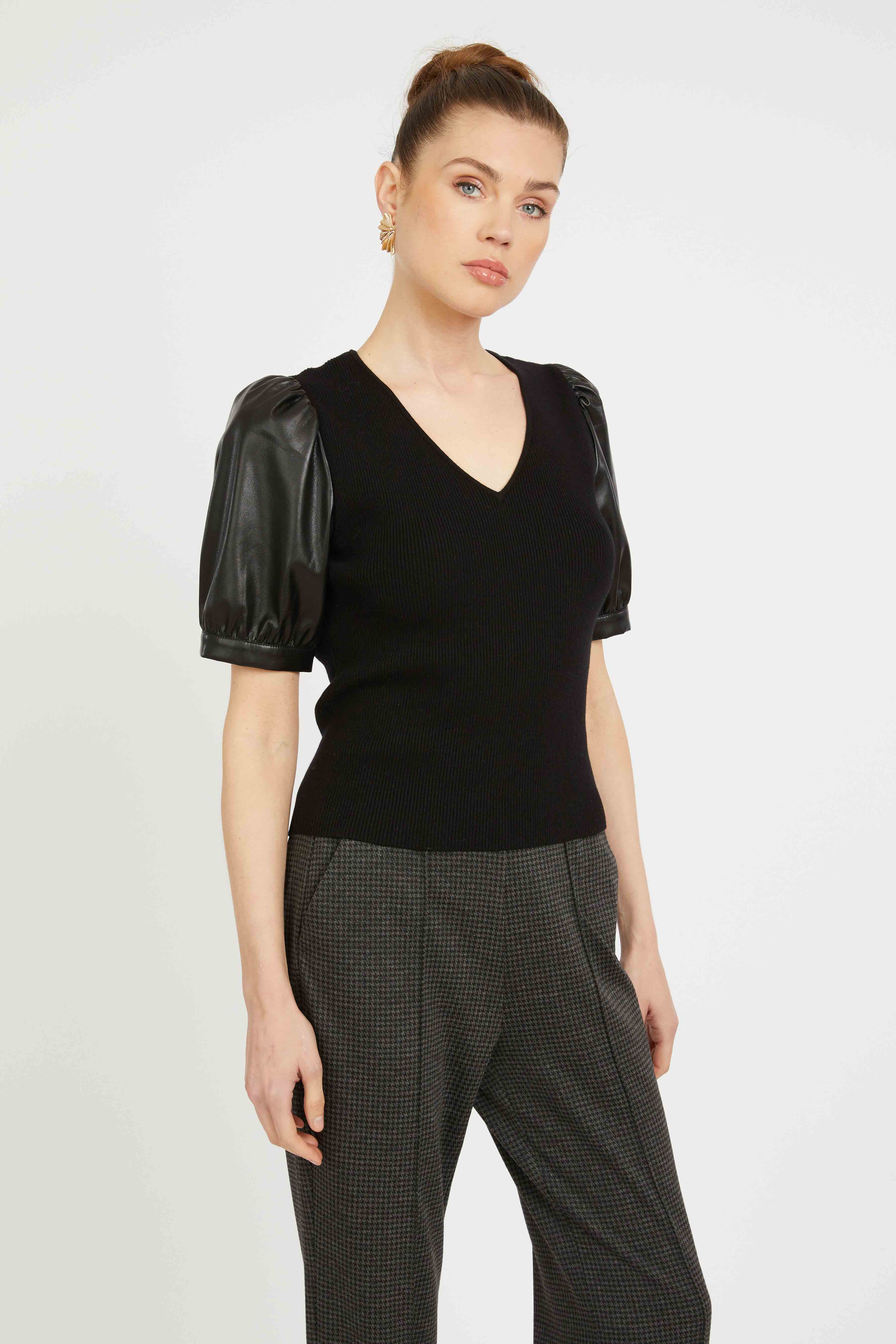 Our Andrea Top is back with a fresh update—now designed with edgy vegan leather sleeves and a flattering V-neckline. This short sleeve style is perfect for fall, blending sleek detail with everyday ease.