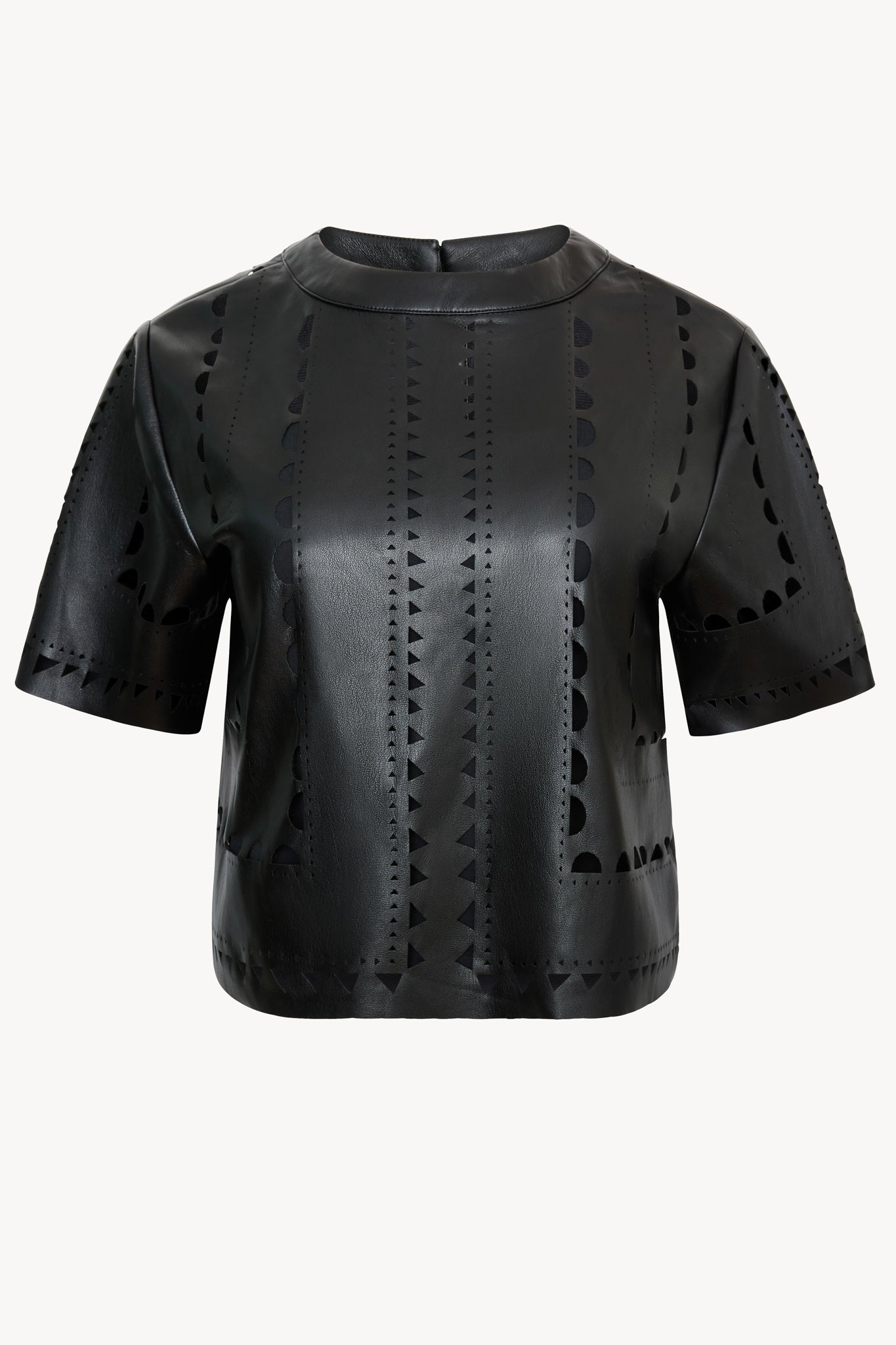 The Anisa Top in black vegan leather is a standout piece that merges bold texture with modern detailing. Featuring a structured short sleeve silhouette, this top is designed with laser-cut geometric patterns that add depth and dimension to the sleek, matte finish.
