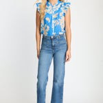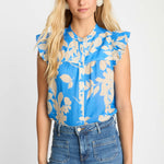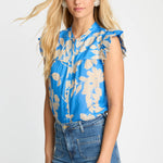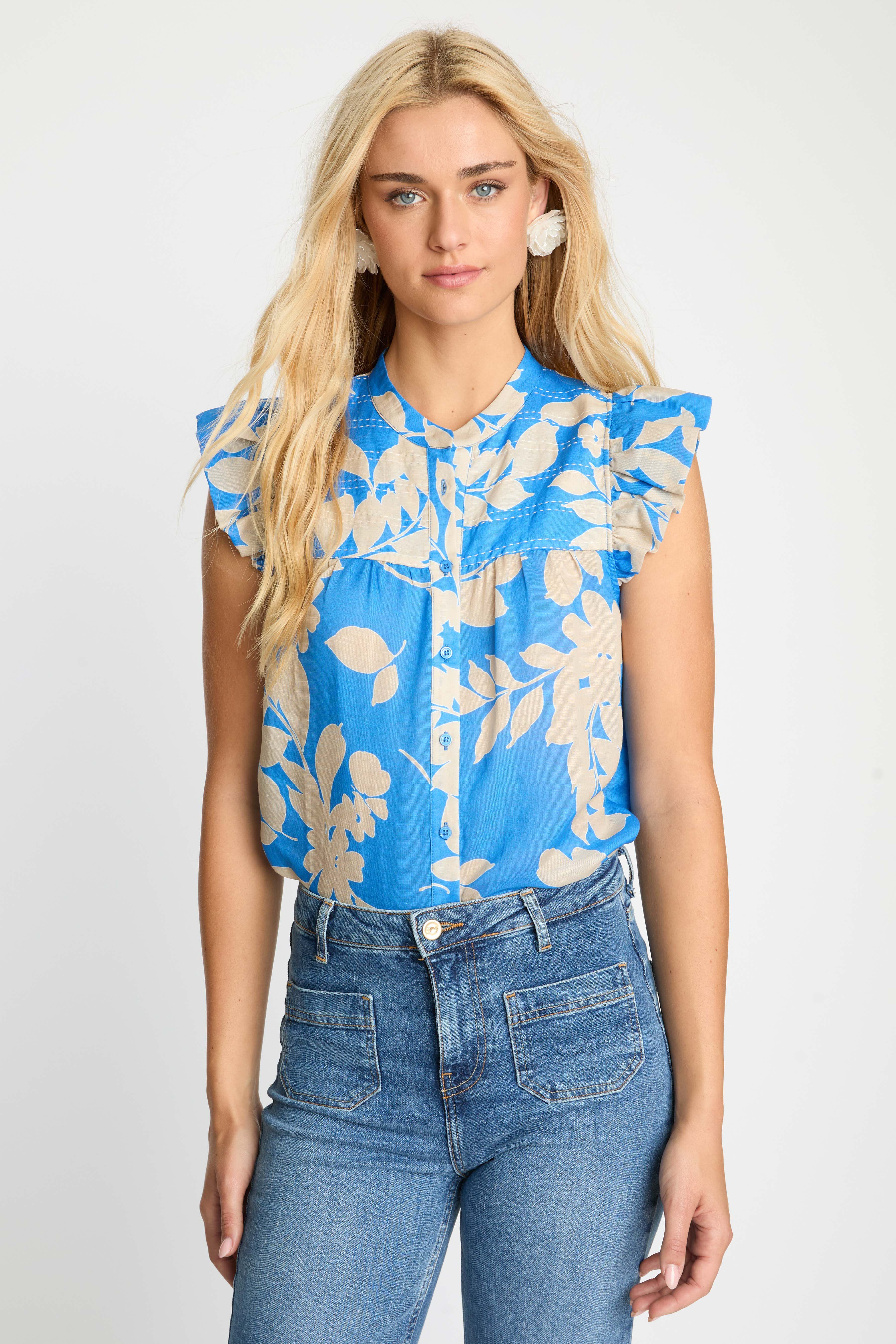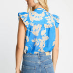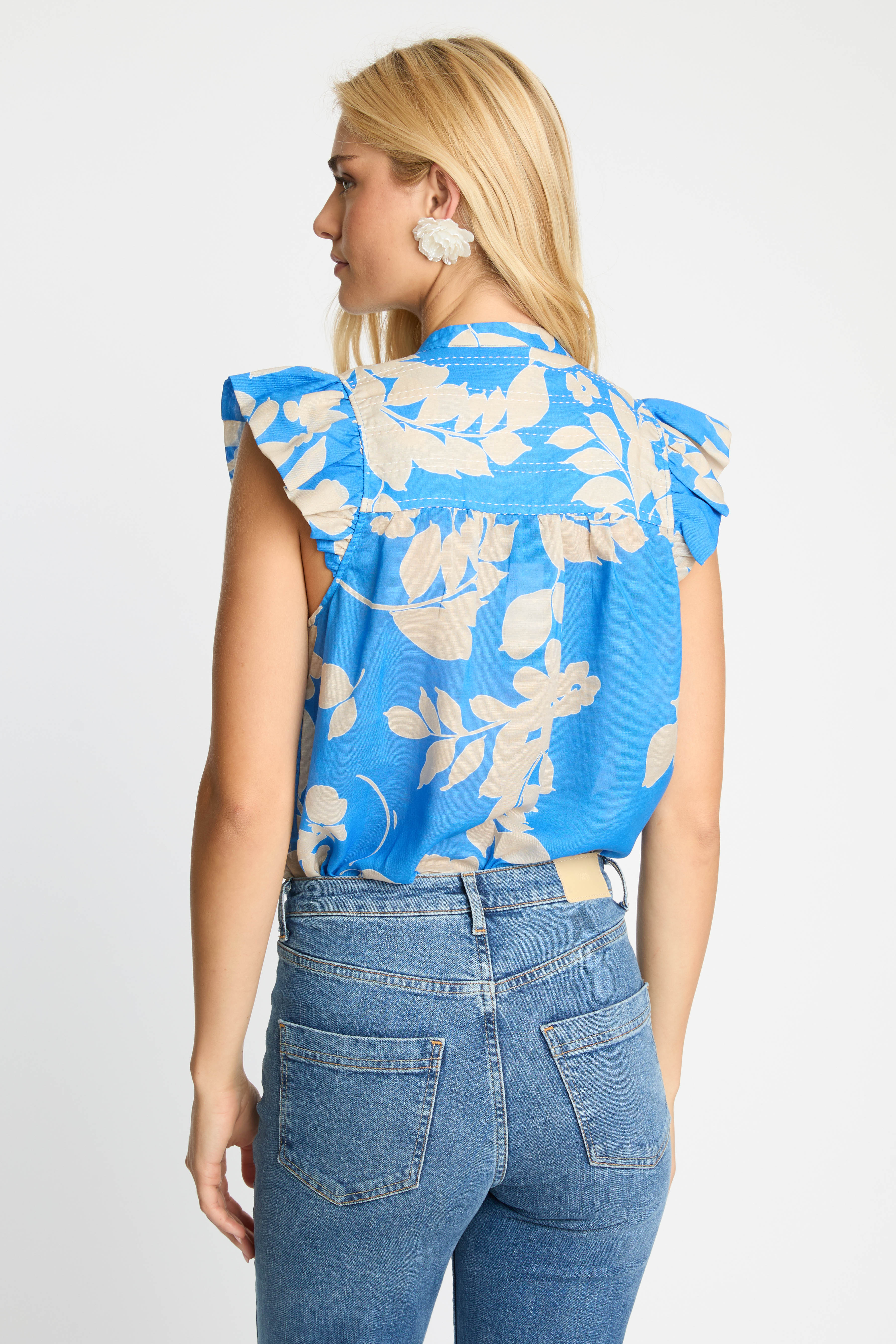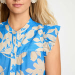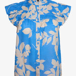 The Anthea Top in Sapphire Shadow is a striking blend of modern refinement and timeless elegance. Featuring a bold botanical print, soft, silhouetted florals and leafy branches appear in warm neutral tones against a rich sapphire-blue ground, creating a crisp, graphic effect. The flowing composition and delicate outlines lend a graceful sense of movement, resulting in a look that feels both polished and effortlessly sophisticated.
