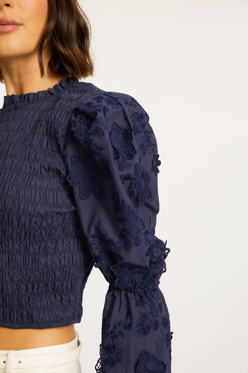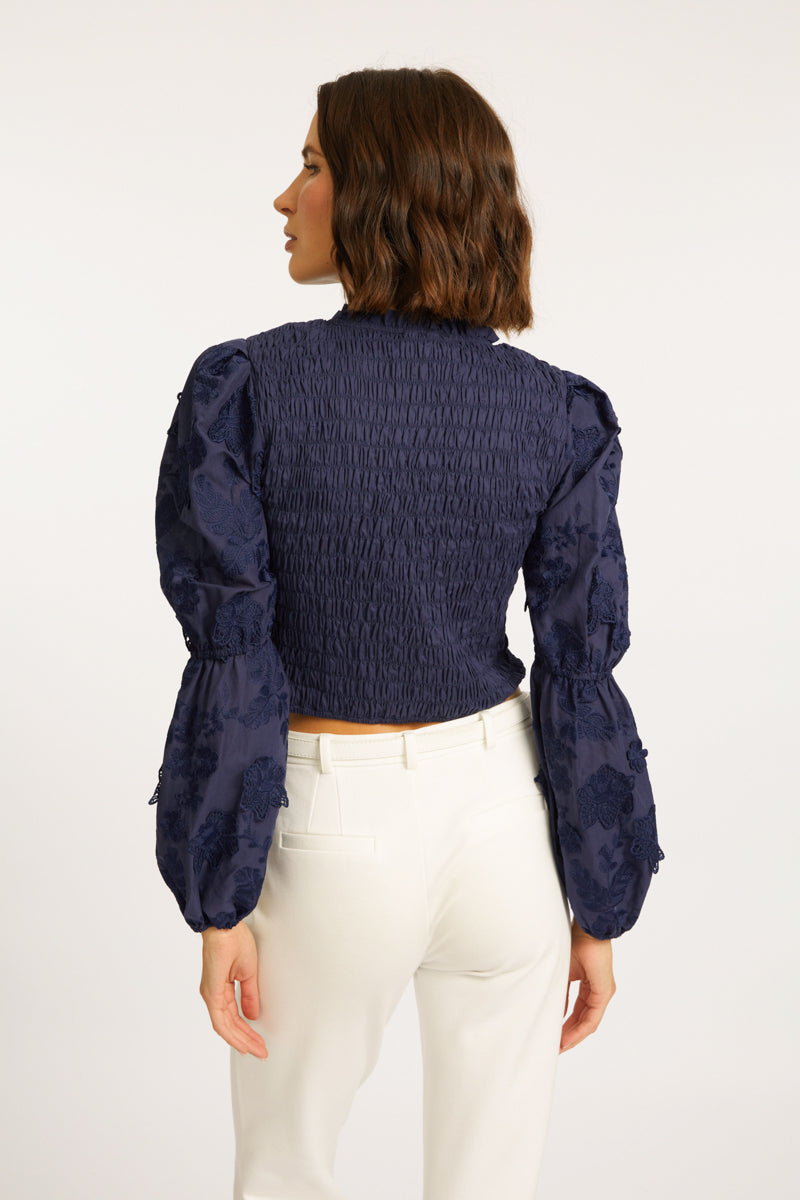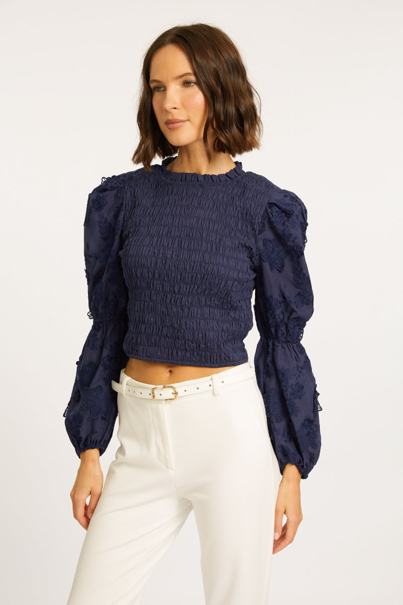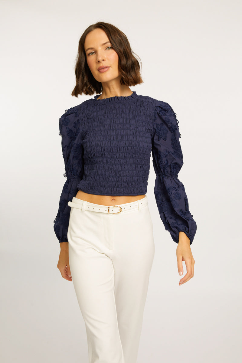 The Arabella Top offers a sophisticated and flattering design in a timeless peacoat navy color. Its cropped fit and smocked bodice create a tailored silhouette that contours the body beautifully. The long sleeves feature lace detailing in the same shade, achieving a seamless, monochromatic look. Elastic at the elbows and cuffs adds volume, transforming the sleeves into a full, elegant shape.