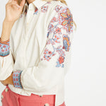 What truly sets the Audrey top apart is the Woodblock Bloom print featured on the sleeves and cuffs. Inspired by traditional woodblock art, the pattern showcases bold, stylized florals with an artisanal feel. Set against a rich ivory base, the periwinkle hue flowers are brought to life with vibrant red, warm orange, deep blue accents.