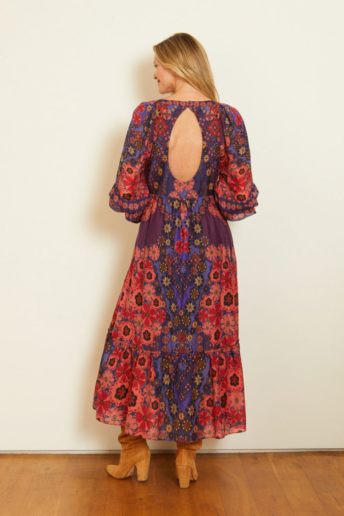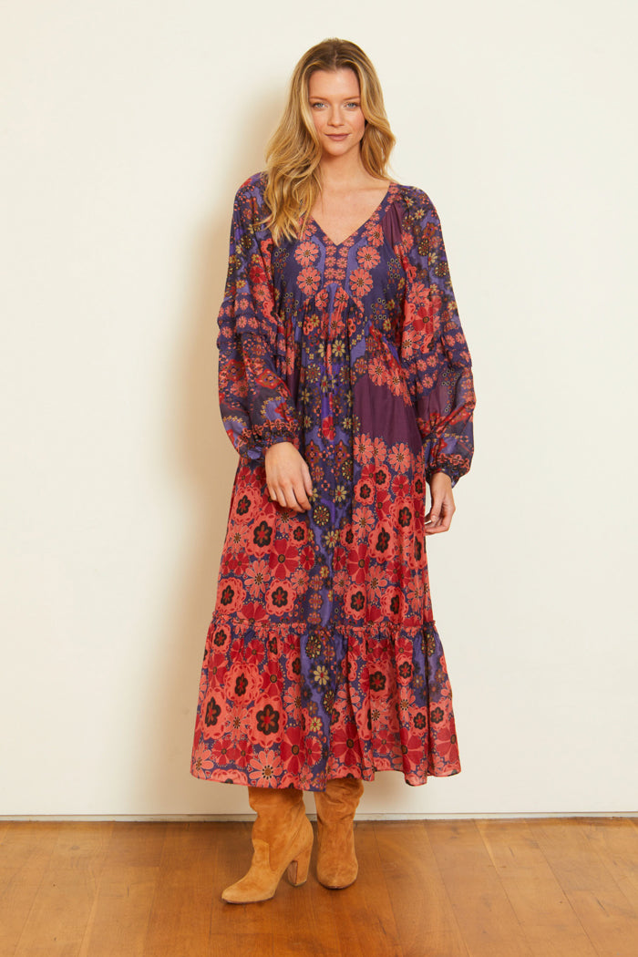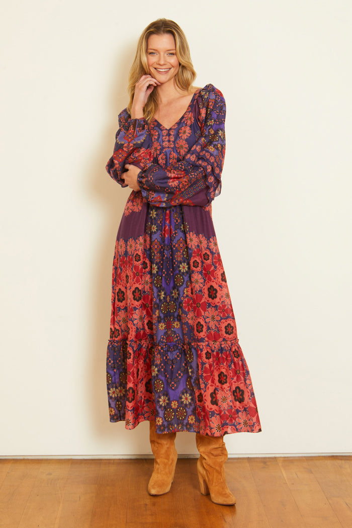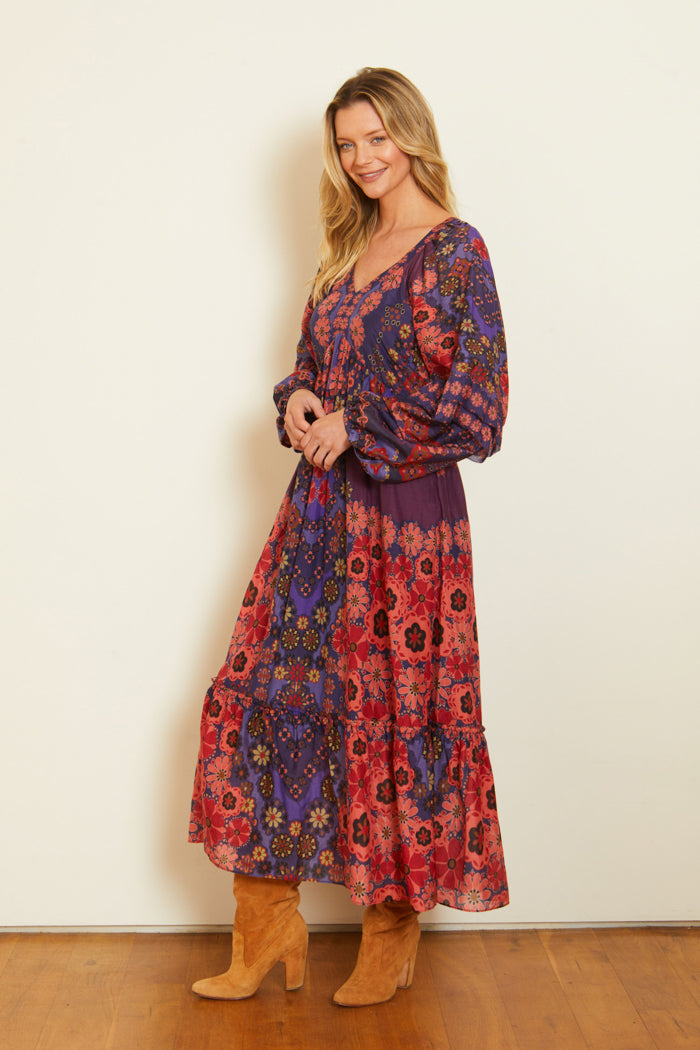 The Patchwork Pansy print, a captivating blend of purples and pinks, adds a touch of playful boho flair, transforming this sophisticated garment into a must-have for the season. Fall in love with the effortless sensuality and luxurious comfort of the Bijou Dress.