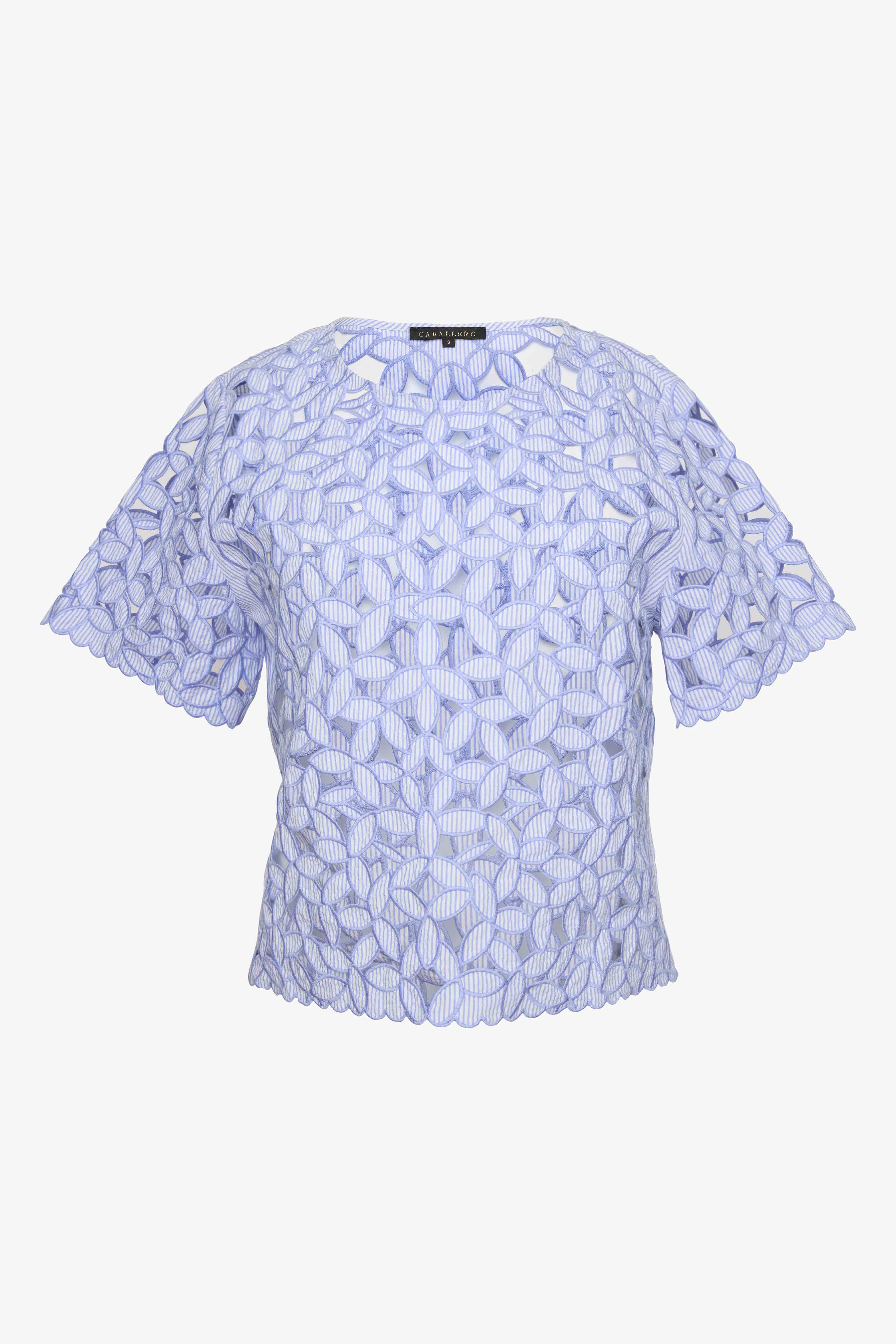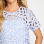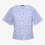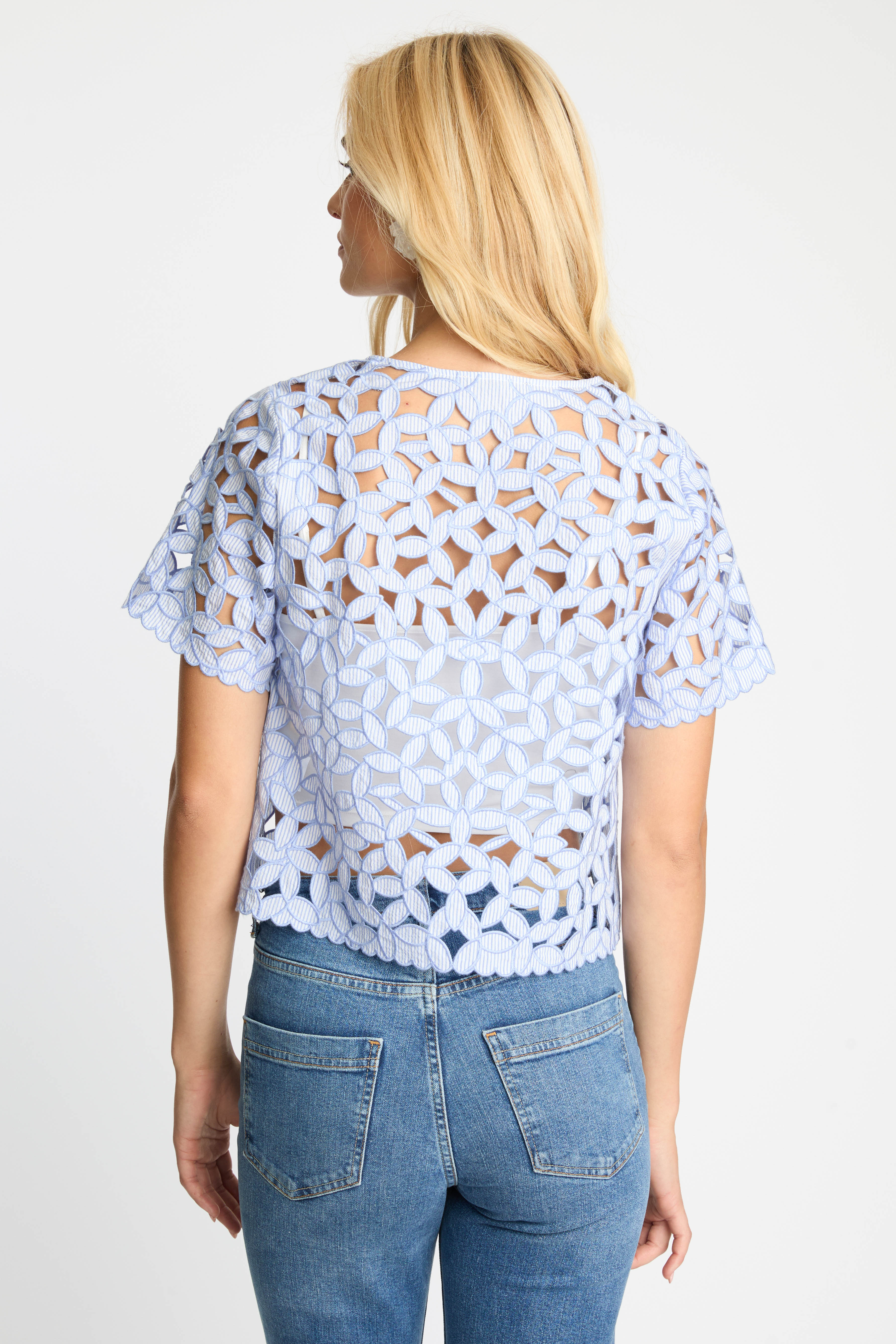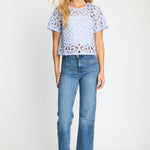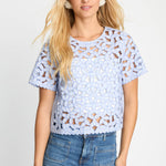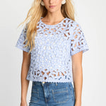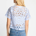The design features intricate floral embroidery with subtle cutout detailing throughout, creating a beautiful openwork effect that adds dimension and airy charm. Short, flared sleeves enhance the relaxed silhouette, while the cropped length gives the top a modern feel that pairs perfectly with high-waisted styles. A classic round neckline provides a clean, flattering finish that balances the intricate embroidery.