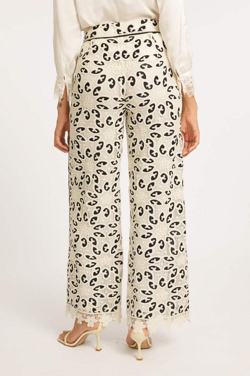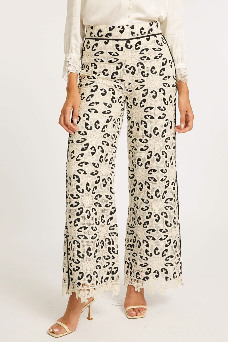 The Celina Pant is a stylish wide-leg pant crafted in a stunning ivory and black lace crochet pattern. Featuring black piping along the waist and sides of the pants, these trousers add a touch of refinement to the boho-chic design. The relaxed, flowing fit offers comfort while maintaining a fashionable edge, making them perfect for both casual and dressier occasions.