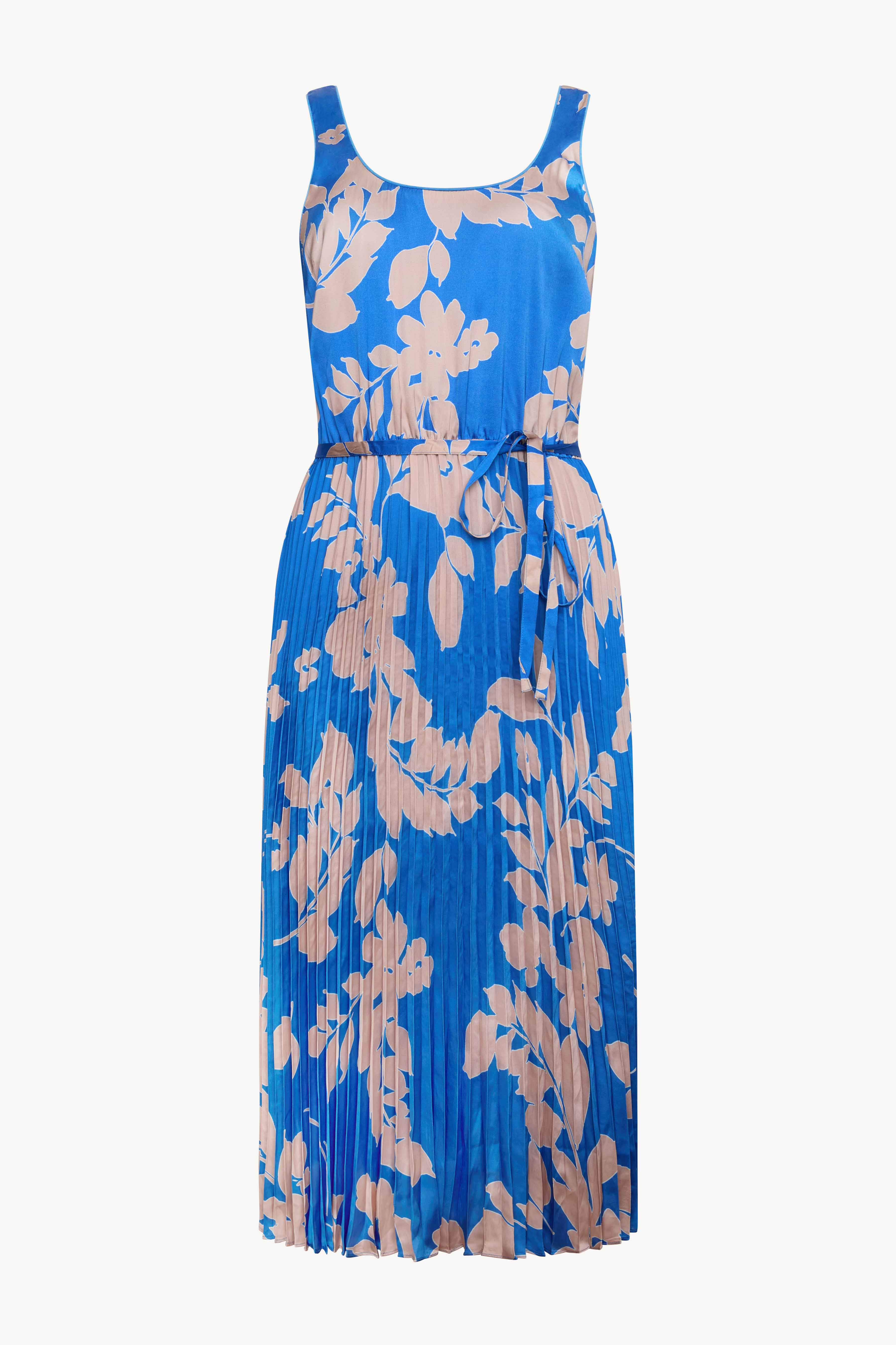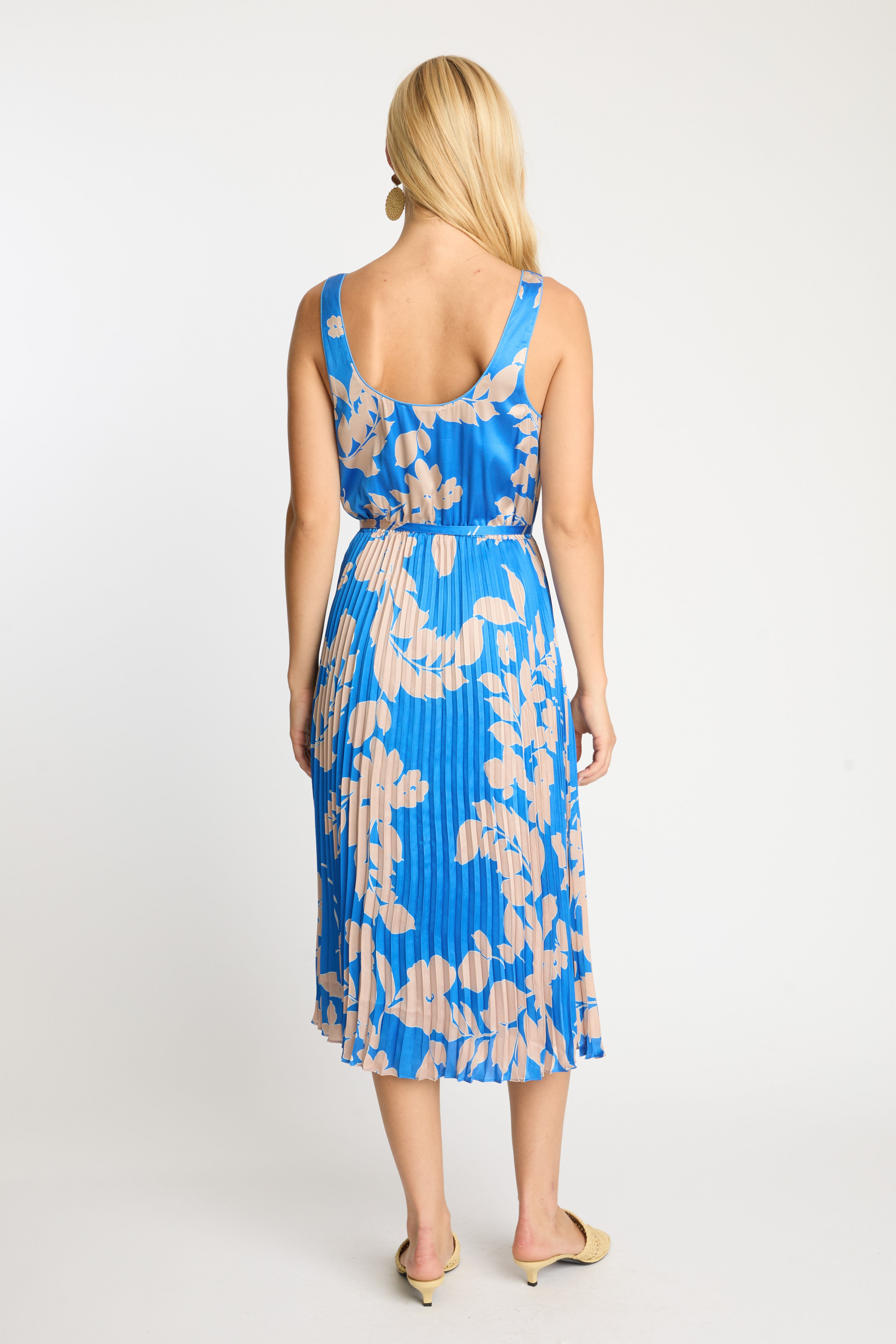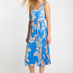 The Daphne Dress in Sapphire Shadow is a stunning sleeveless midi designed to effortlessly blend style and comfort. Featuring a rich sapphire-blue ground with a bold botanical print, soft, silhouetted florals and leafy branches appear in warm neutral tones, creating a crisp, graphic look that feels both fresh and refined—perfect for warm-weather dressing.