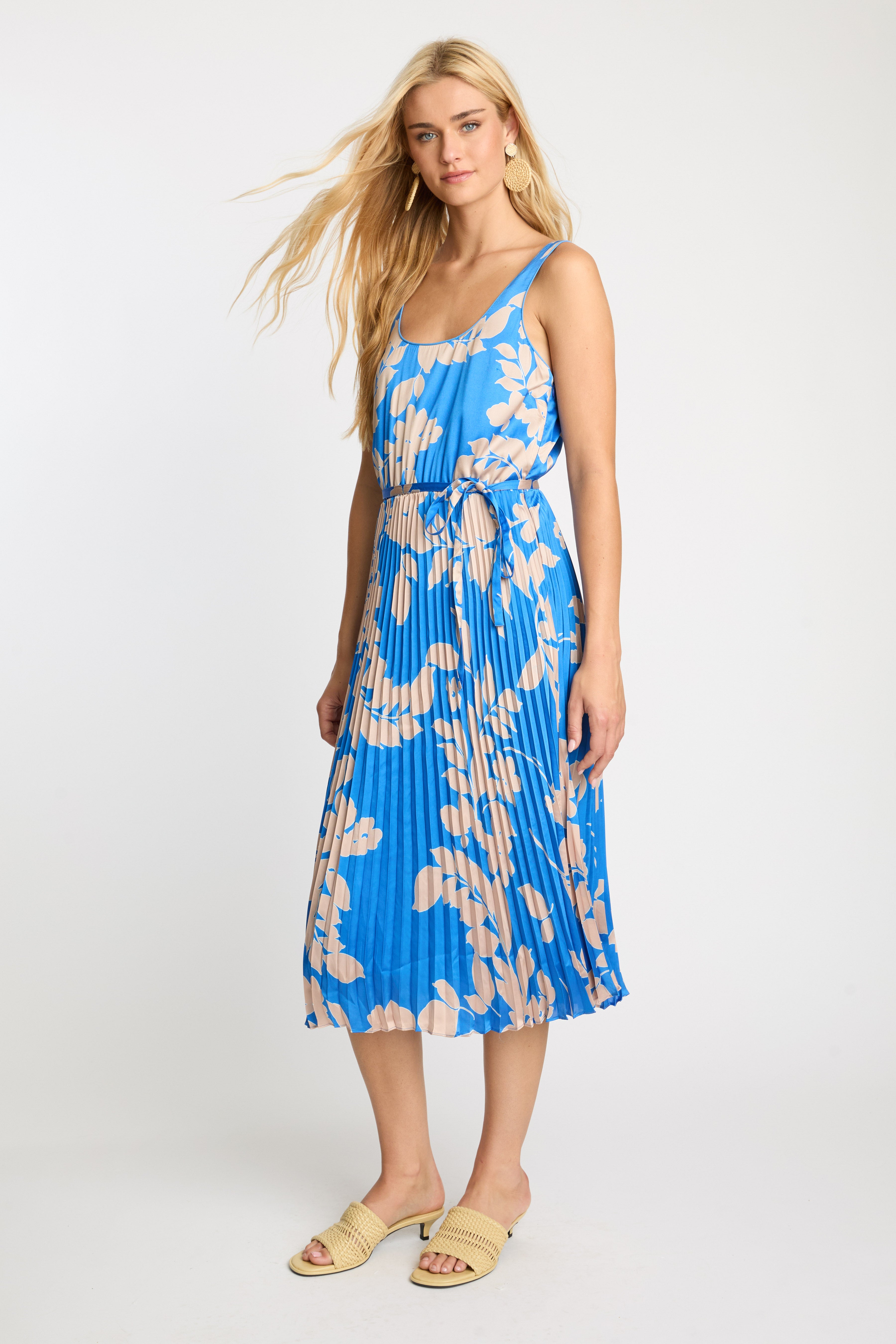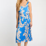 Designed with a flattering fitted bodice and rounded neckline, the silhouette enhances your shape while maintaining an easy, feminine feel. A self-tie belt cinches the waist for an adjustable, hourglass fit, while the pleated midi skirt adds graceful movement and soft texture as it falls below the knee. Lightweight and polished, the Daphne Dress transitions seamlessly from beach days to brunches and spring occasions with effortless sophistication.