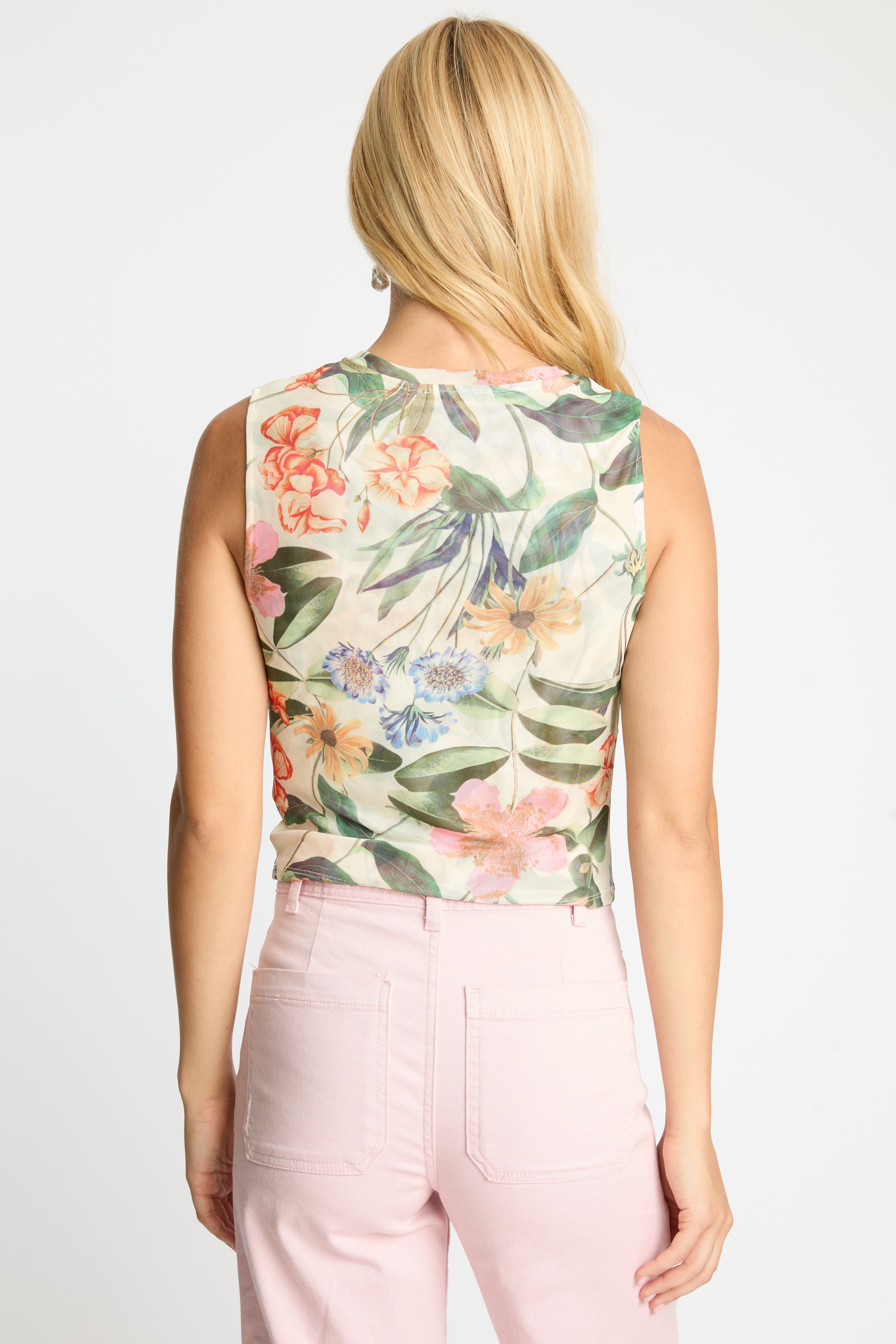Designed with a high crew neckline and a sleeveless silhouette, the Devi Top offers a clean, modern shape. The lightweight, semi-sheer fabric softly skims the body, while subtle side ruching and a soft asymmetrical drape create gentle movement and a beautifully flattering contour. The angled drape adds visual interest and an elevated feel, making it easy to style from polished daytime looks to special occasions.