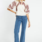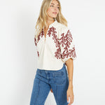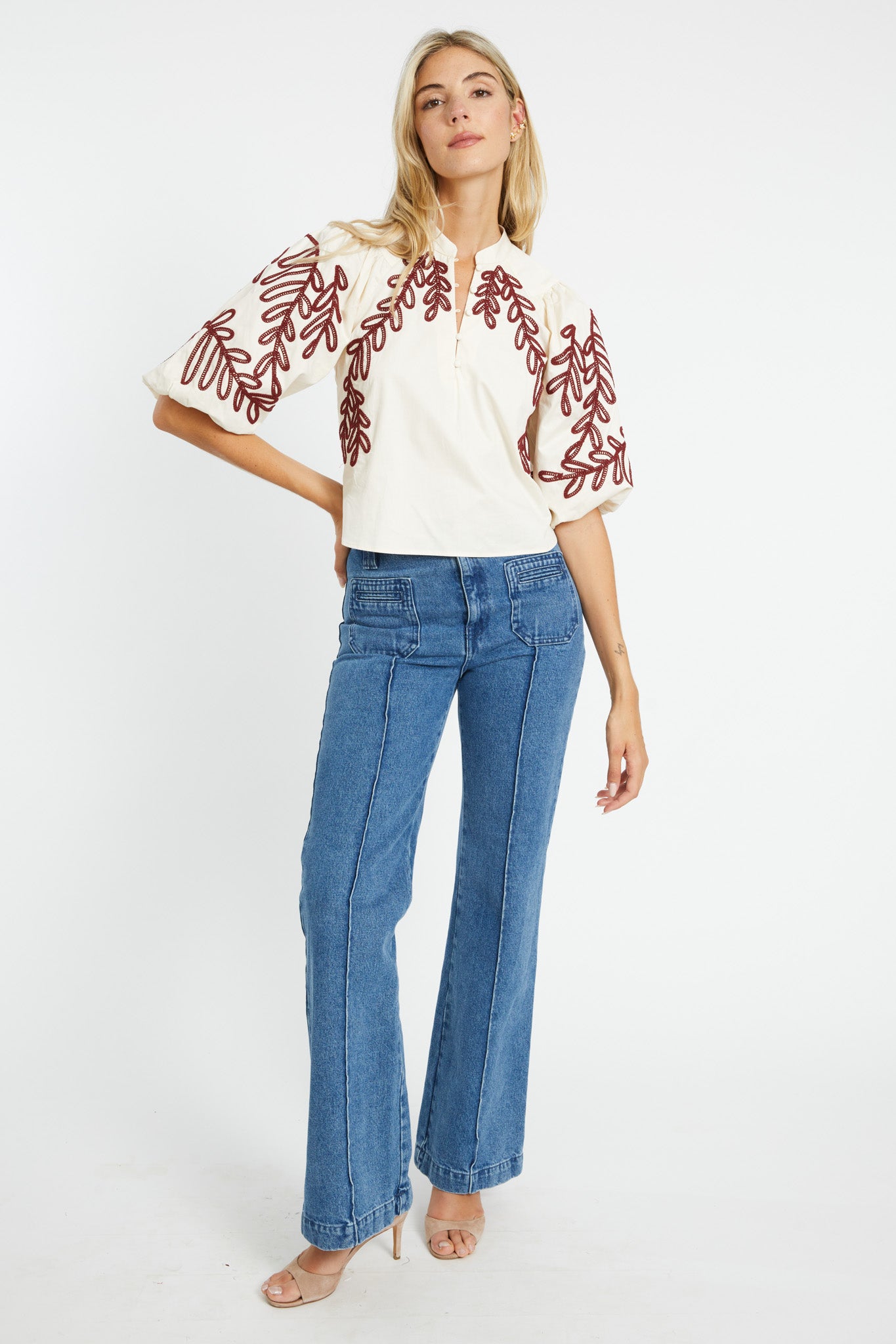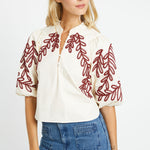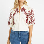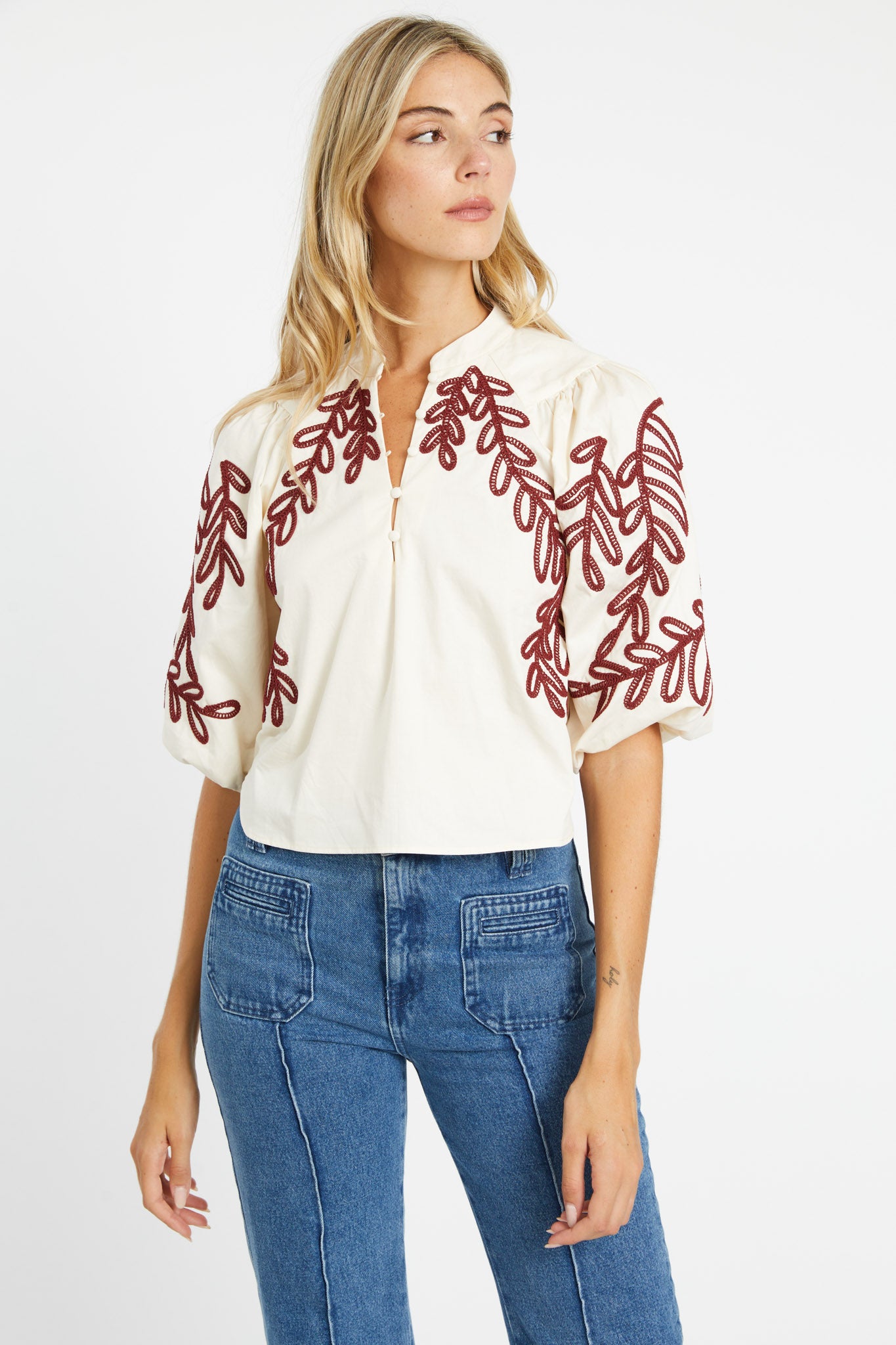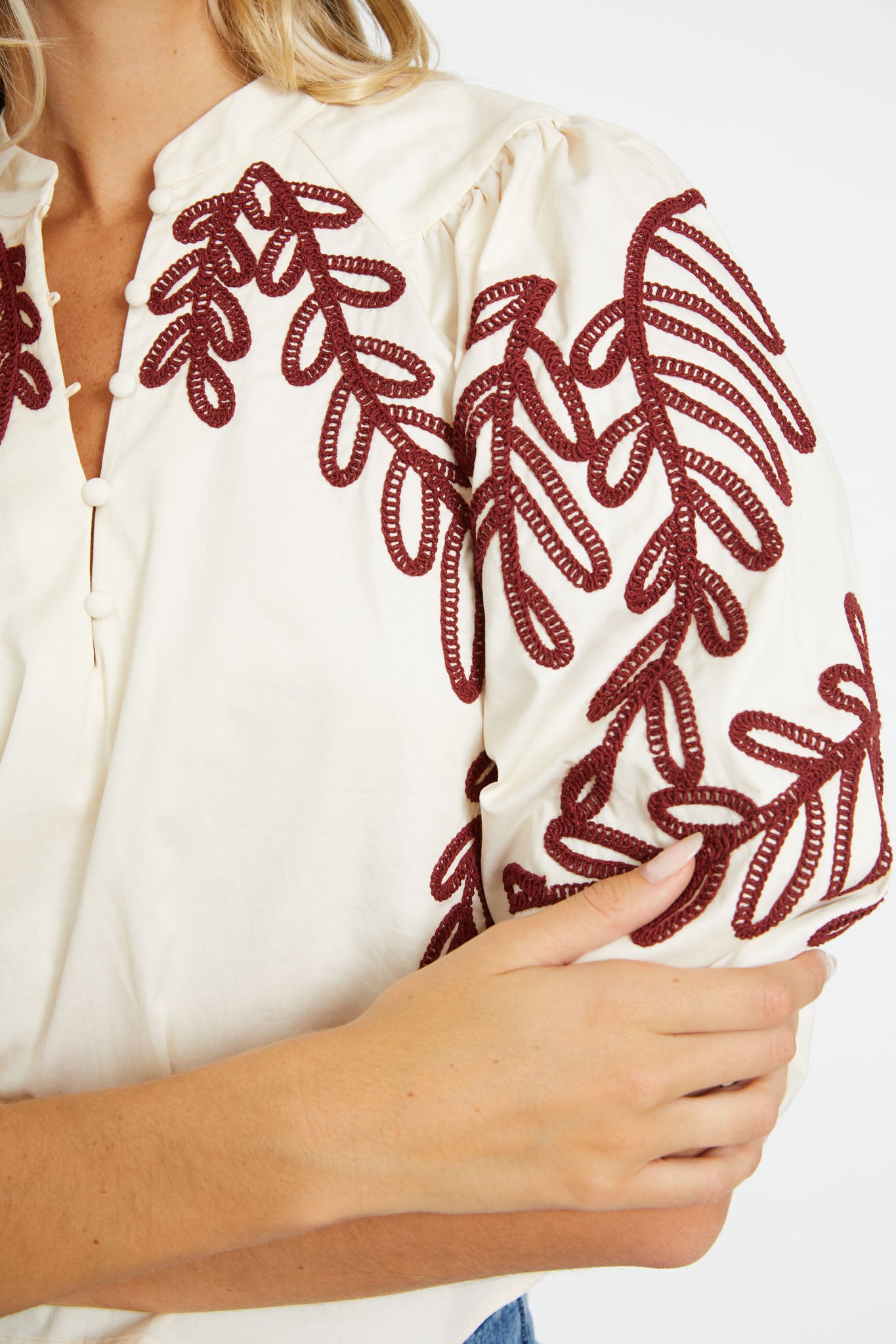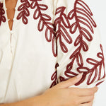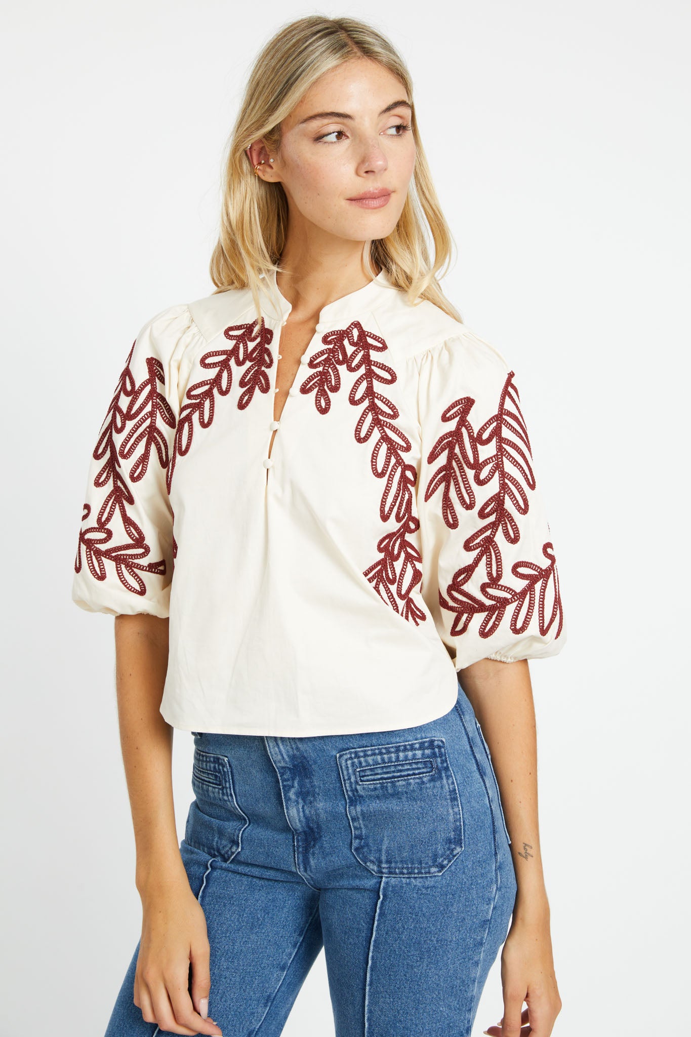 The Elodie Top in Ivory cotton twill showcases intricate chocolate-hued leafy embroidery, creating a striking and organic design. Thoughtfully placed along the body, as well as across the voluminous puff sleeves, the embroidery adds texture and artisanal detail. A subtle stand collar with a front slit and loop closure complements the relaxed, slightly boxy silhouette for an easy yet elevated fit.