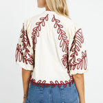 Blending craftsmanship with a modern shape, the Elodie Top offers visual warmth and depth through its rich contrast of chocolate thread on soft ivory. It’s a standout piece that feels both grounded and refined—equally at home styled with denim for daytime or dressed up with tailored separates for a more polished look.