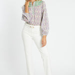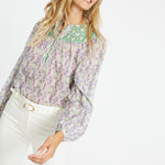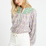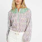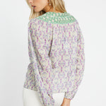 The Emery Top is a vibrant summer standout, crafted from a lightweight cotton-silk blend in our playful Tribal Ink Blot print. This breezy long-sleeve silhouette features a striking green tile yoke at the shoulders, adding a bold, graphic contrast to the soft, abstract print beneath.