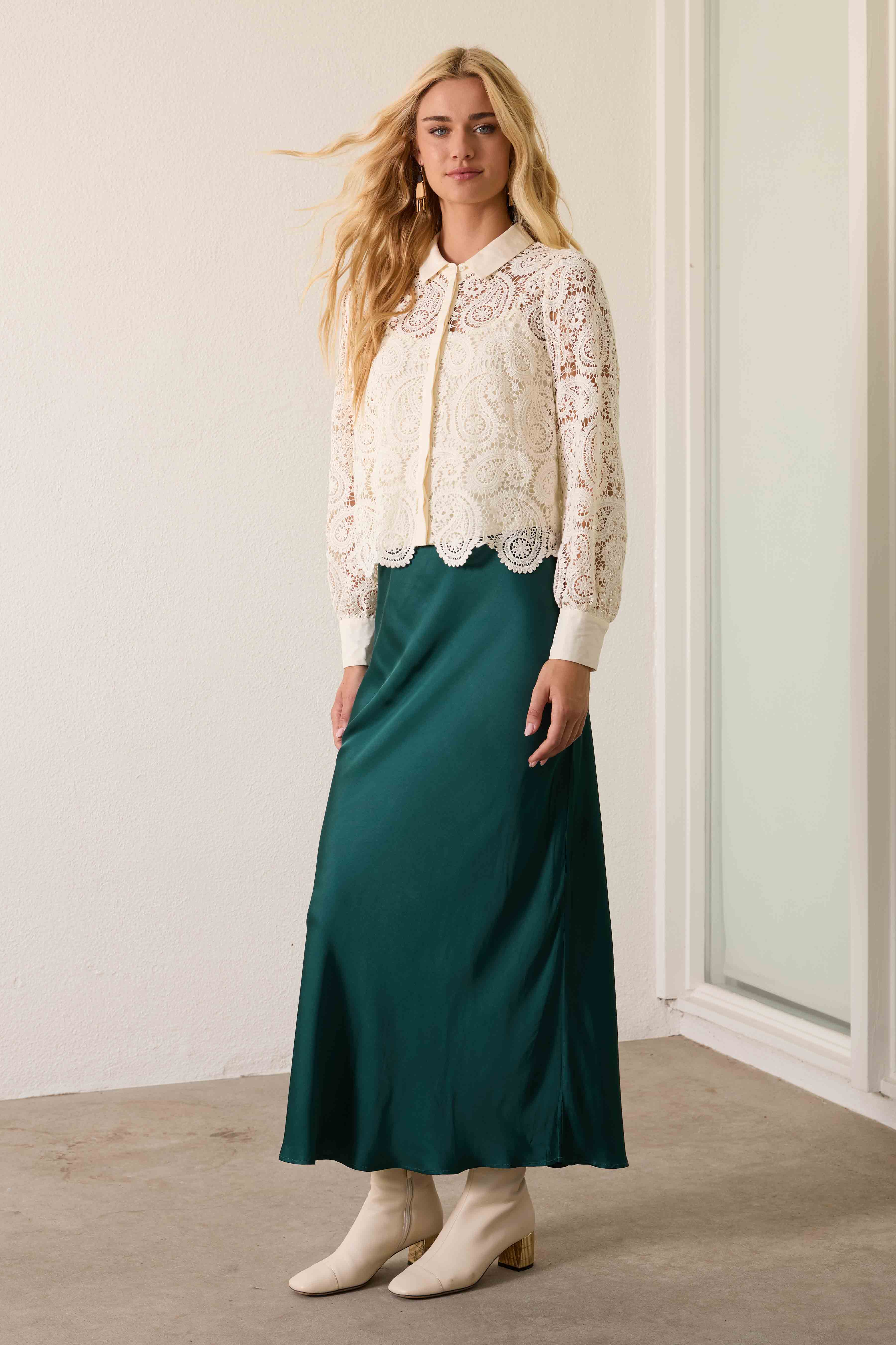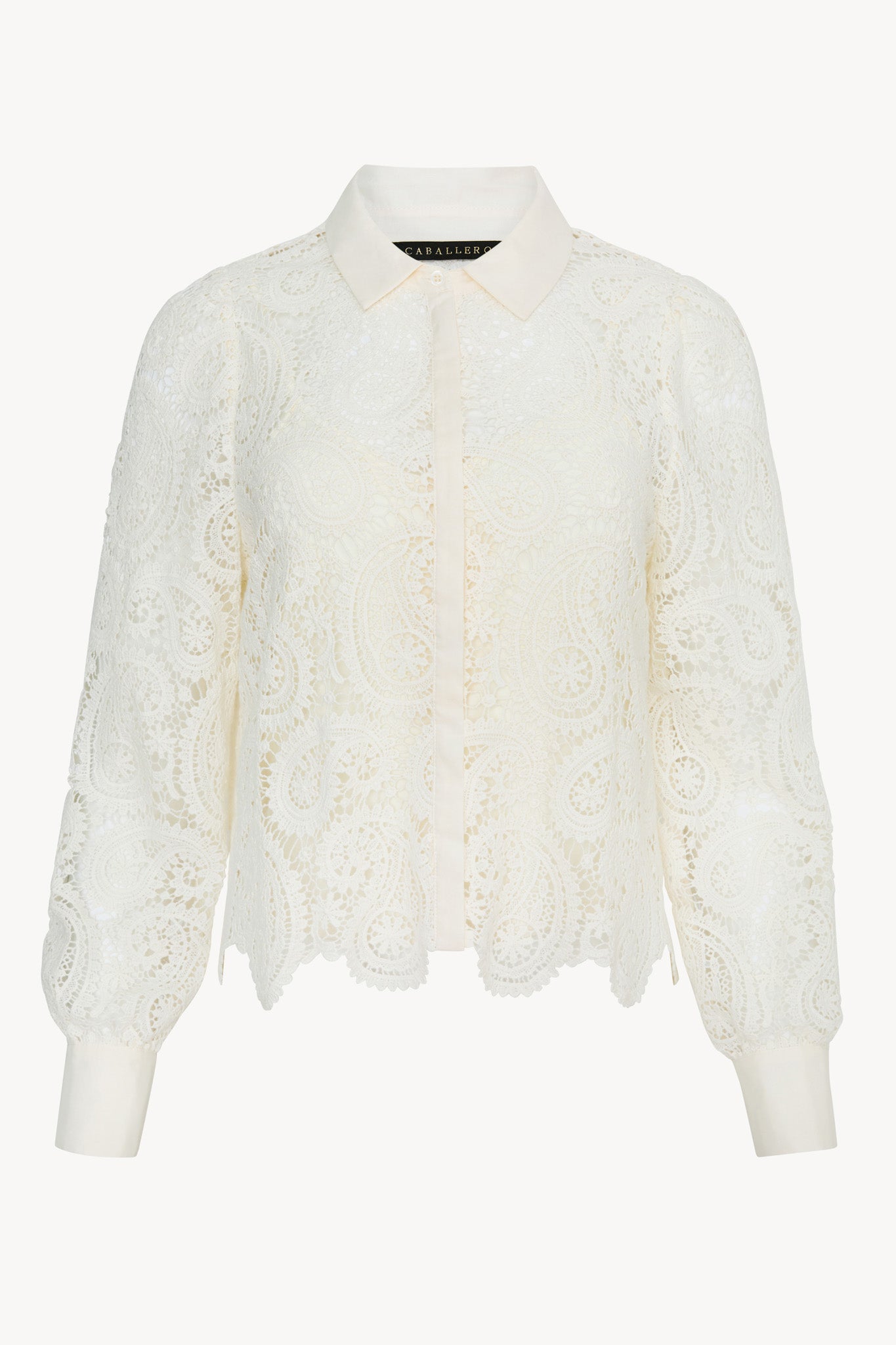 The Emmie Top is crafted in antique white with delicate paisley-inspired lace, offering a timeless and feminine look. Featuring a button-down front, collar, full-length sleeves, and a scalloped hem, it combines classic elegance with subtle texture.