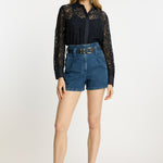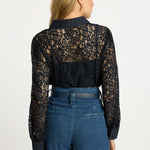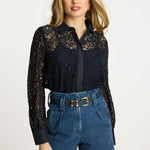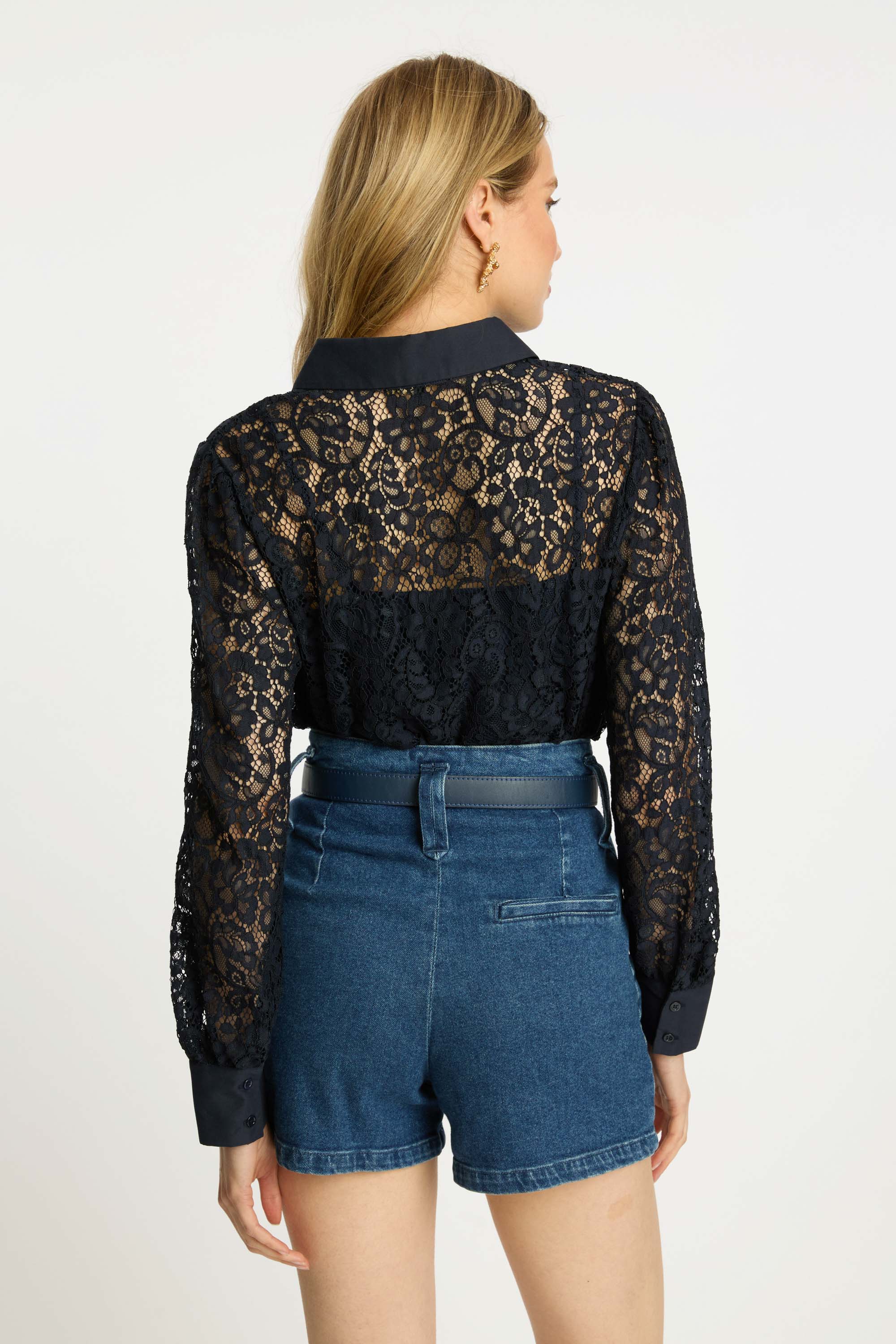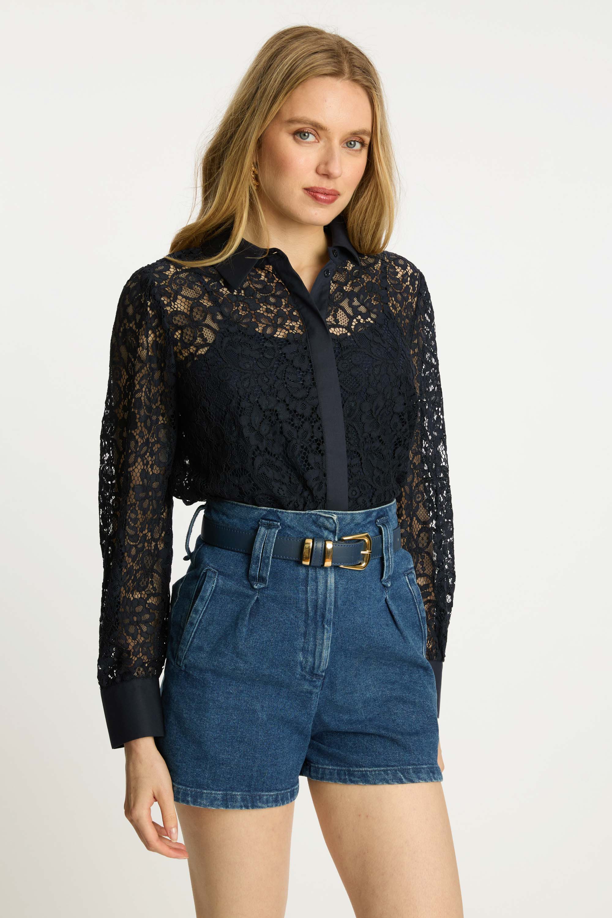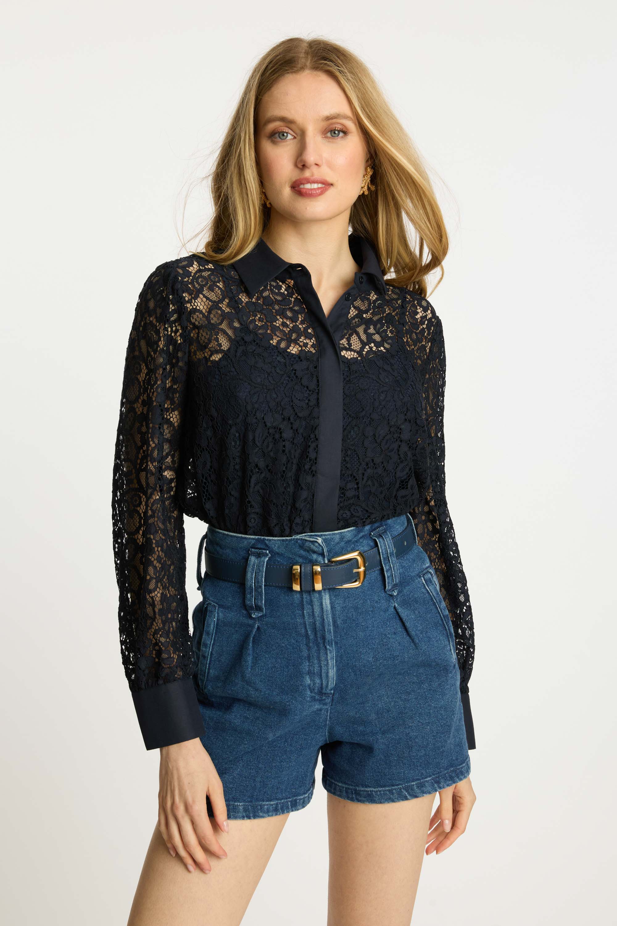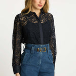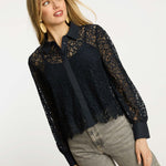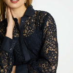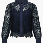 The Emmie Top in Dark Navy Lace exudes sophistication and romance with its intricate lace design and deep, rich hue. Featuring a classic shirt collar and button-down front, it blends timeless elegance with a touch of modern refinement. Sheer lace sleeves and a scalloped hem add delicate detailing, creating a look that’s effortlessly elevated.