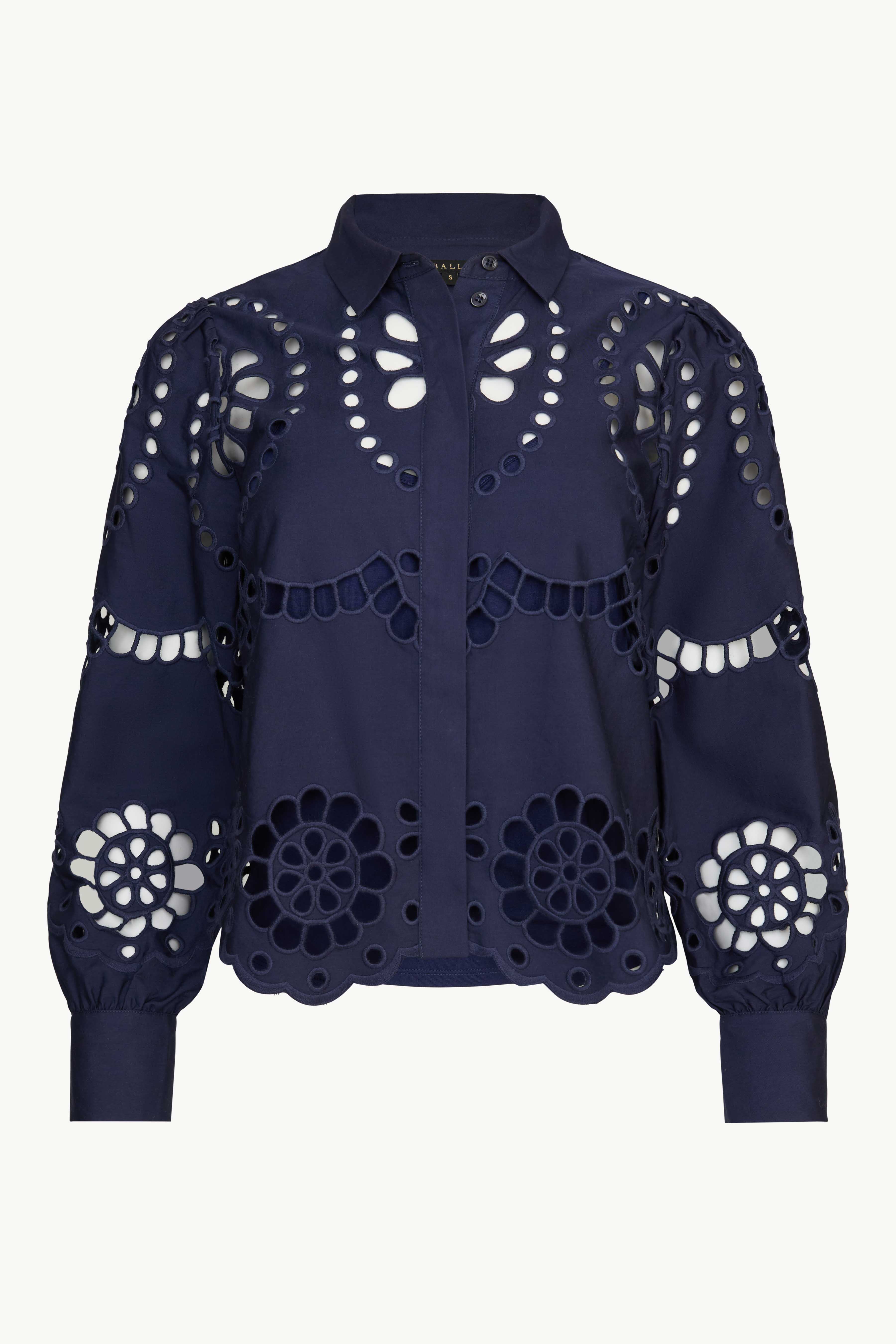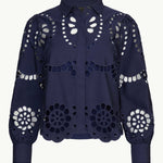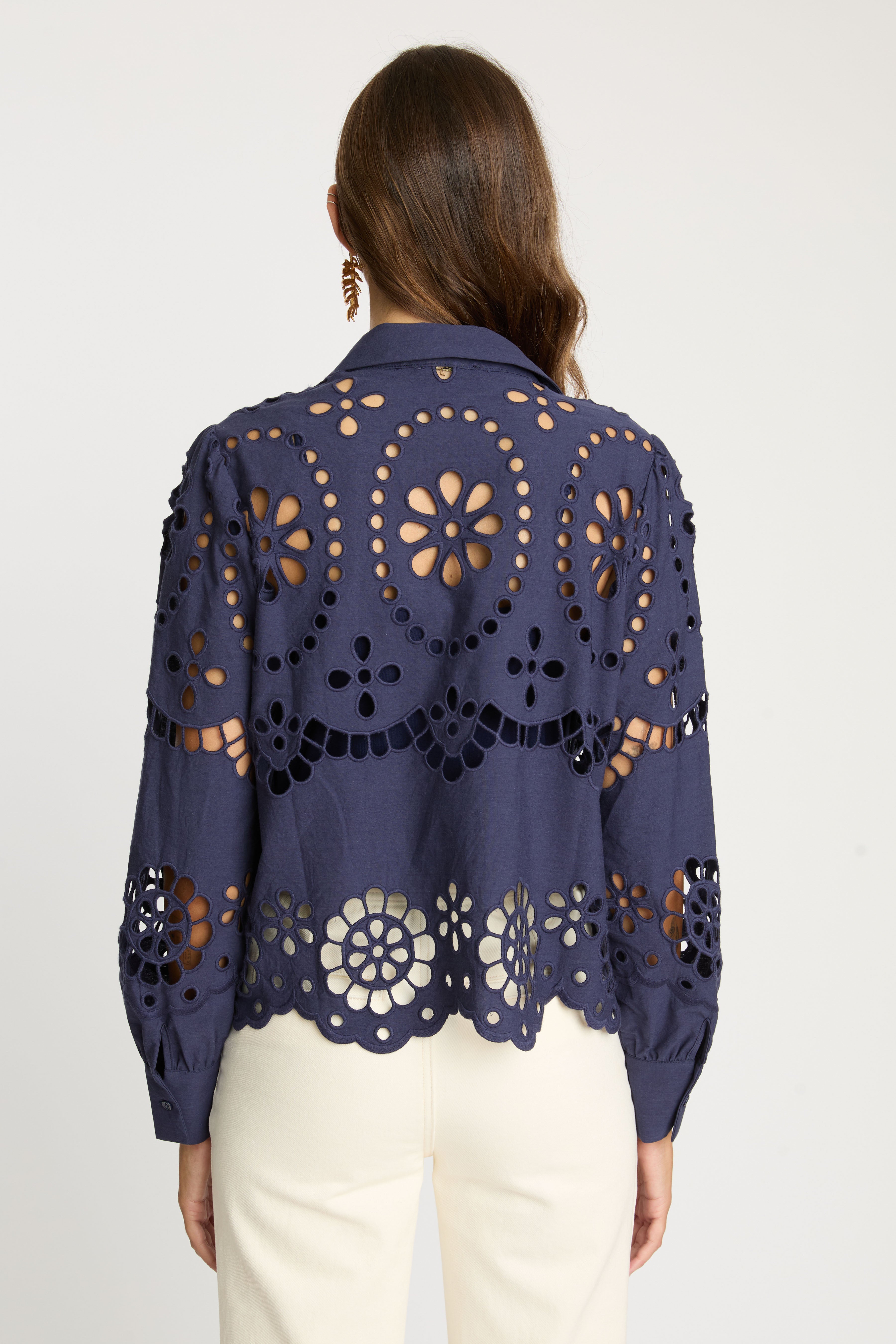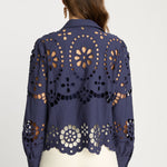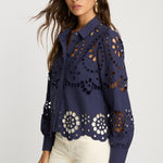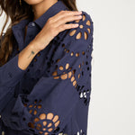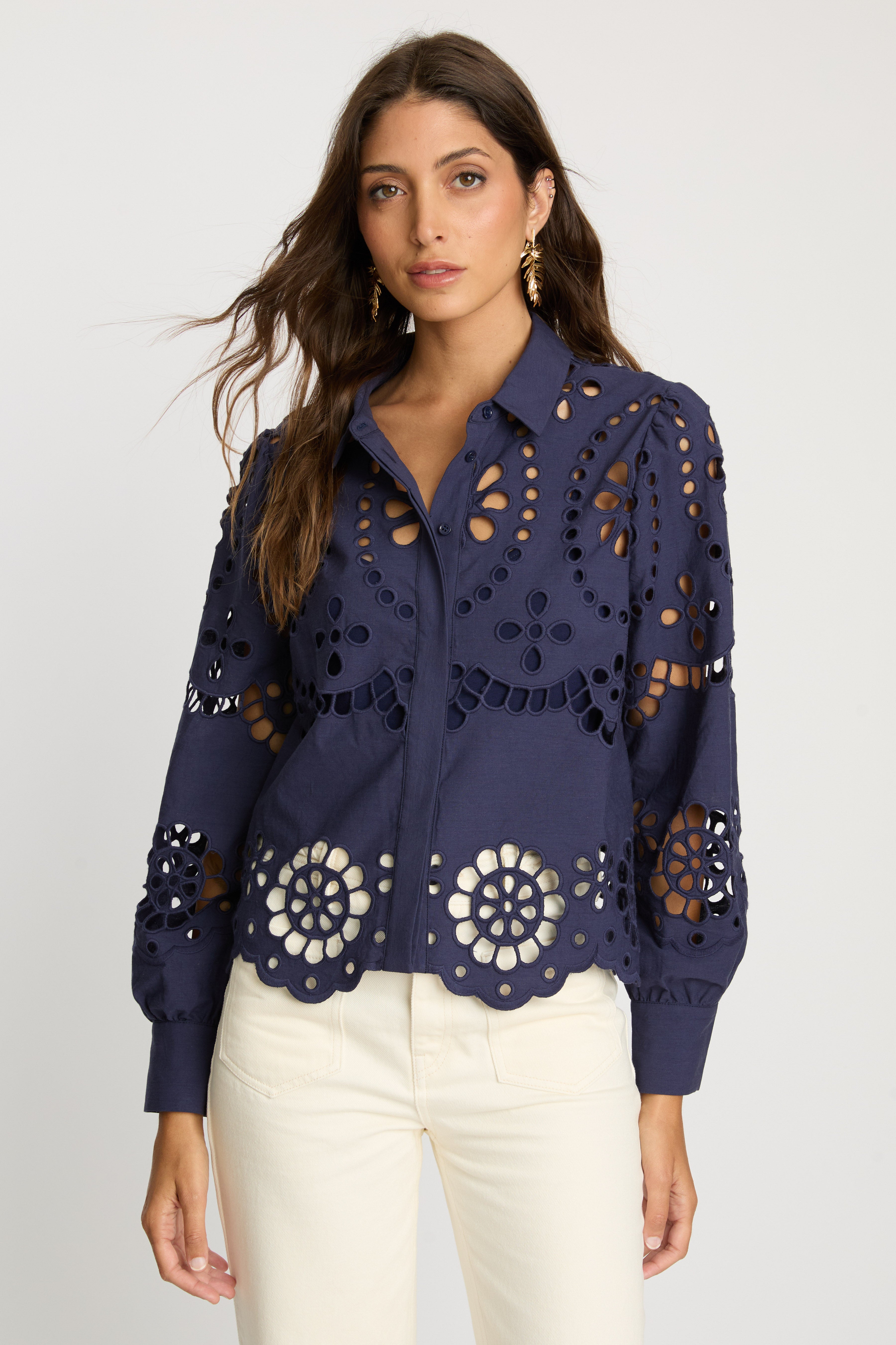 Make a statement in our Emmie Top in Navy Eyelet Lace. Made from cotton, this top offers a delicate, floral-inspired design with a subtle peek of skin and a touch of bohemian charm. The classic button-down silhouette is updated with long sleeves and a scalloped hem, striking the perfect balance of refined sophistication and playful detail.