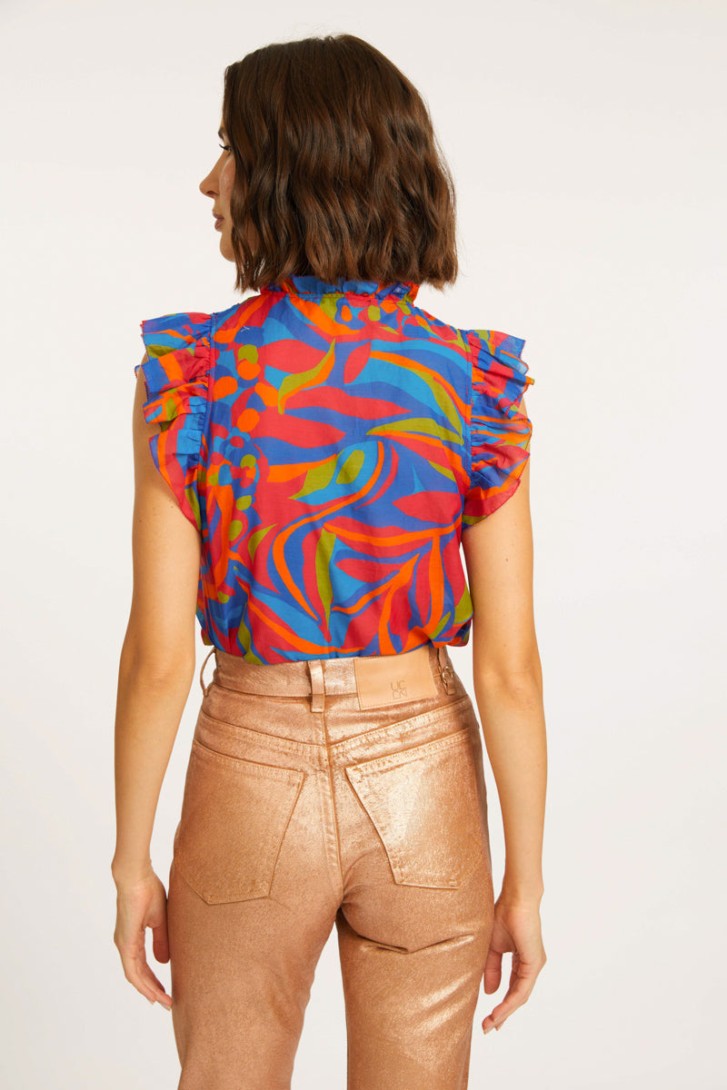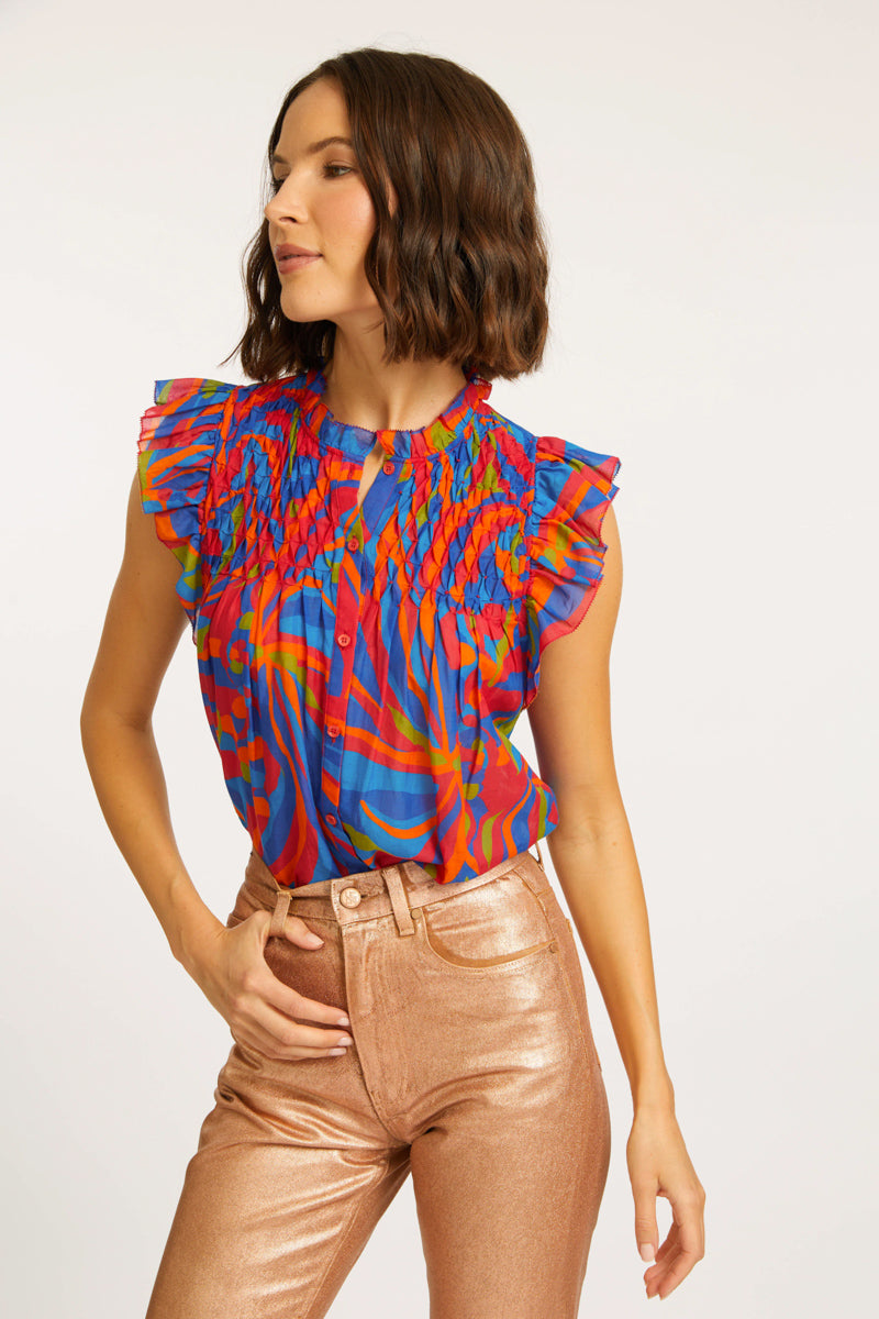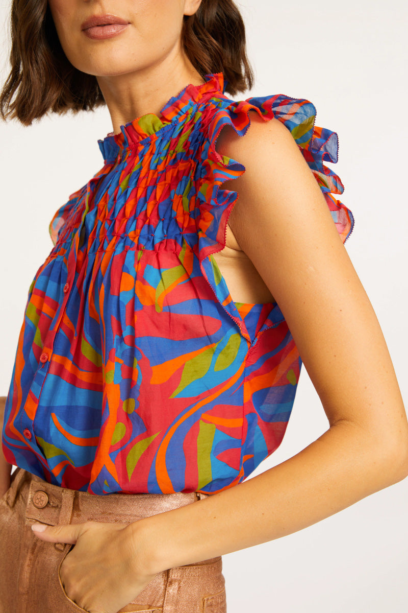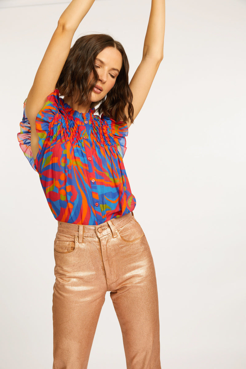 The Evelyn Top in our Passion Palm print brings a flirty, tropical essence to your wardrobe. Featuring bold orange, blue, red, and green tones, this leafy tropical print exudes a carefree, tropical vibe. The relaxed button-up fit offers a comfortable and effortless look, while the smocking technique at the yoke area adds subtle texture and dimension to the top.