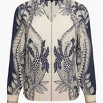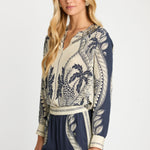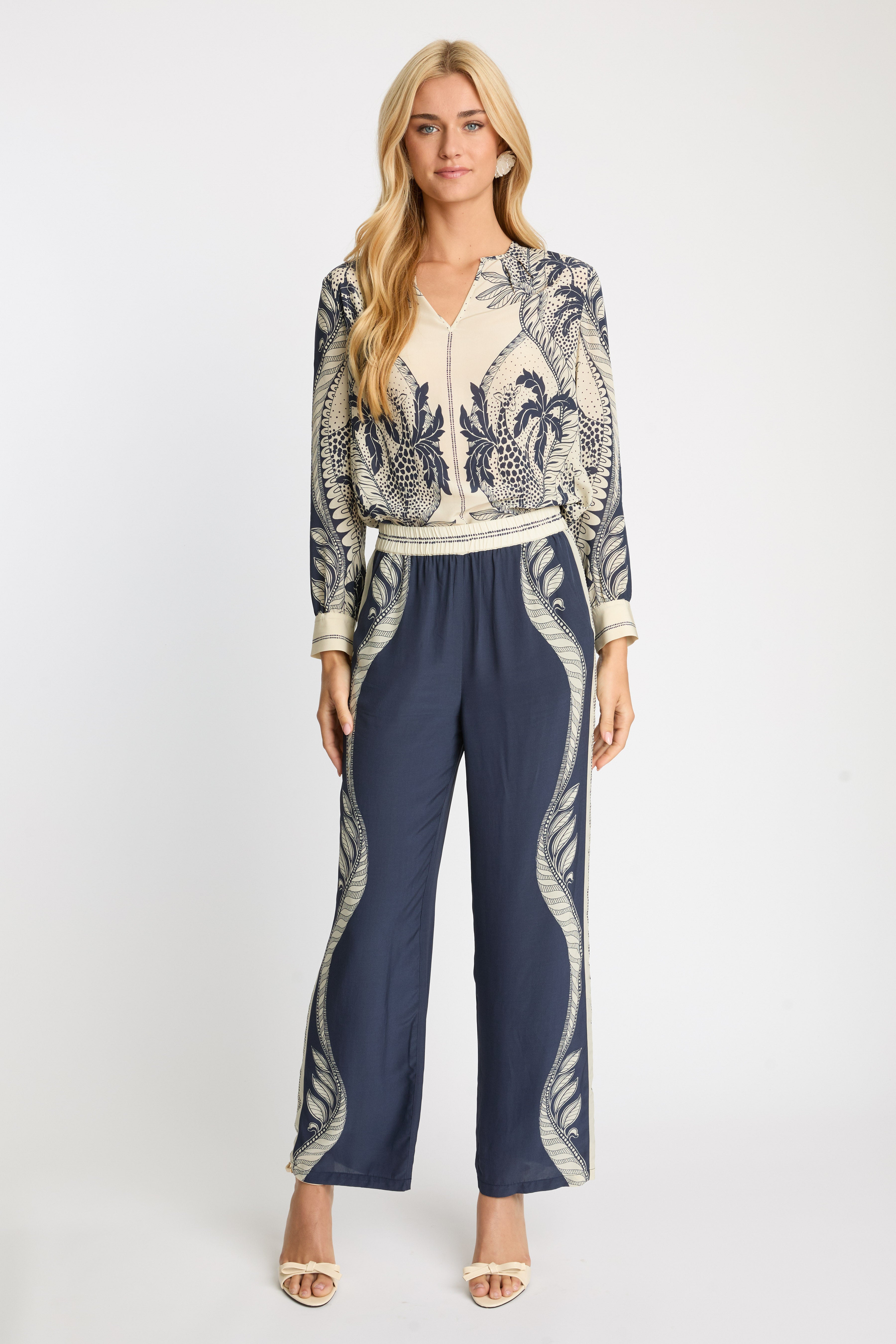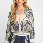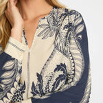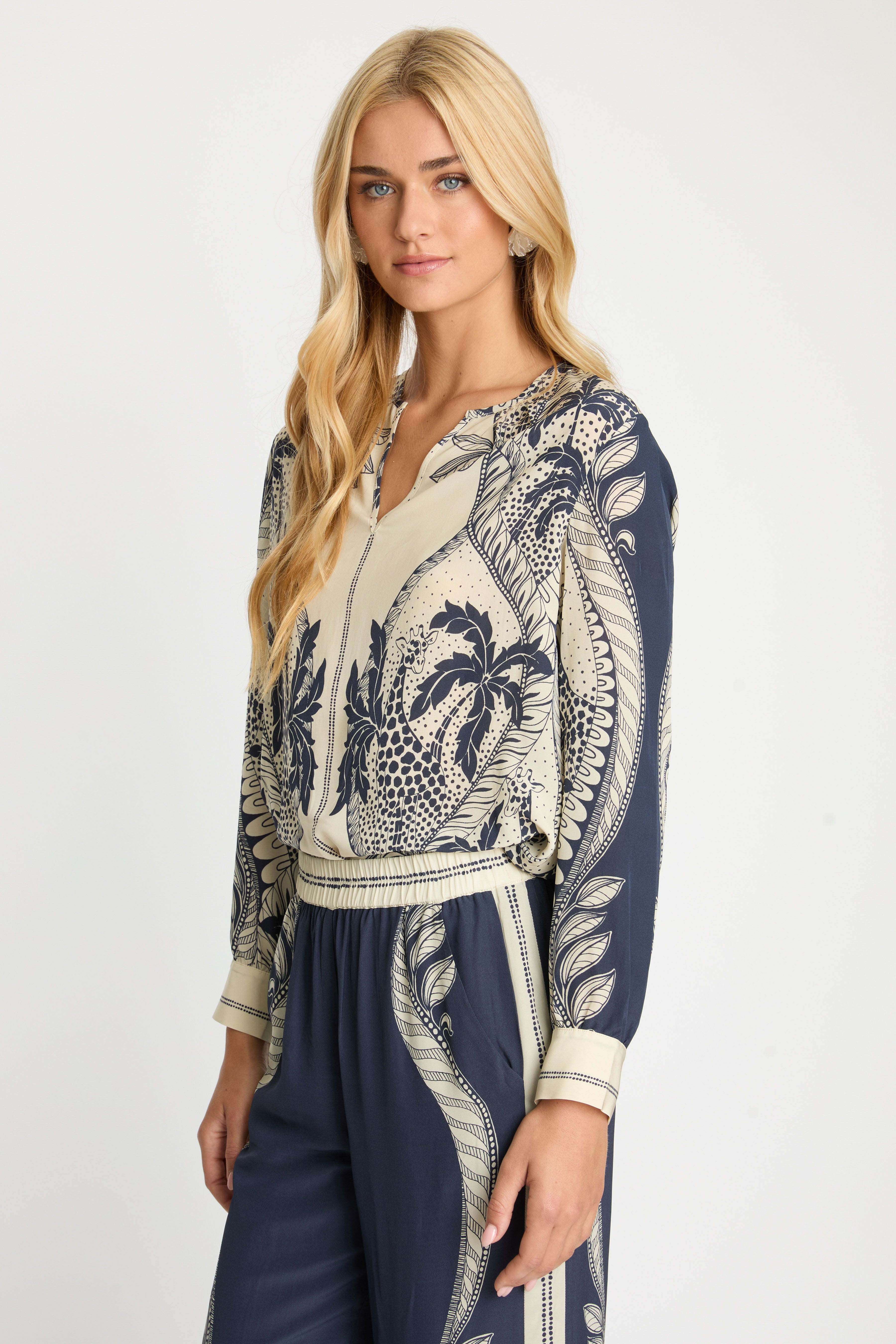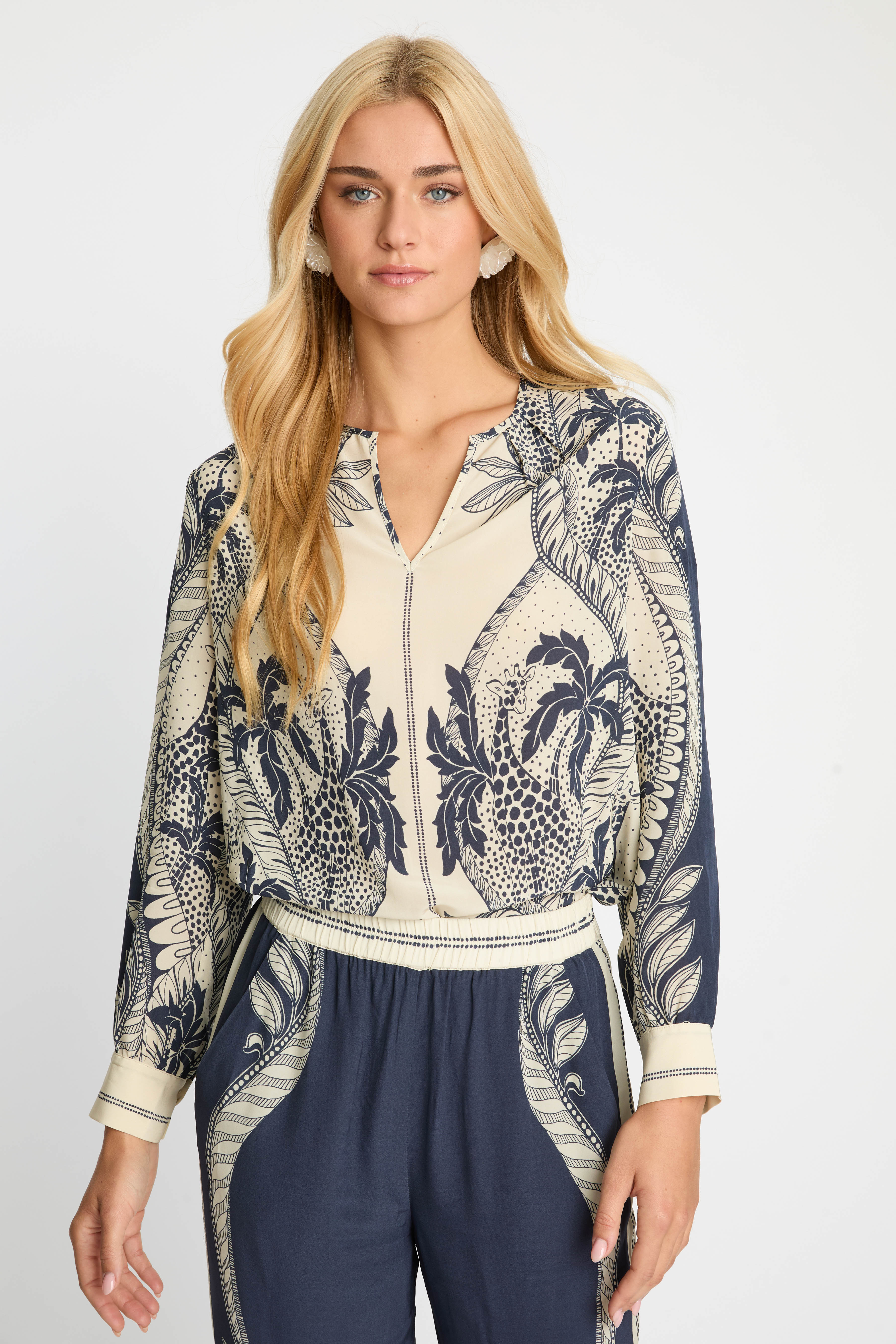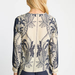Refined details include contrasting cream trim at the cuffs, adding a polished touch while keeping the design clean and elegant. Crafted from a lightweight, flowy fabric, the Fern Top is perfect for warm-weather wear and pairs beautifully with high-waisted trousers, skirts, or shorts. Ideal for daytime outings, brunches, or stylish vacation looks, this top combines the striking Ink Island print with versatile, chic design for a sophisticated, yet playful statement.