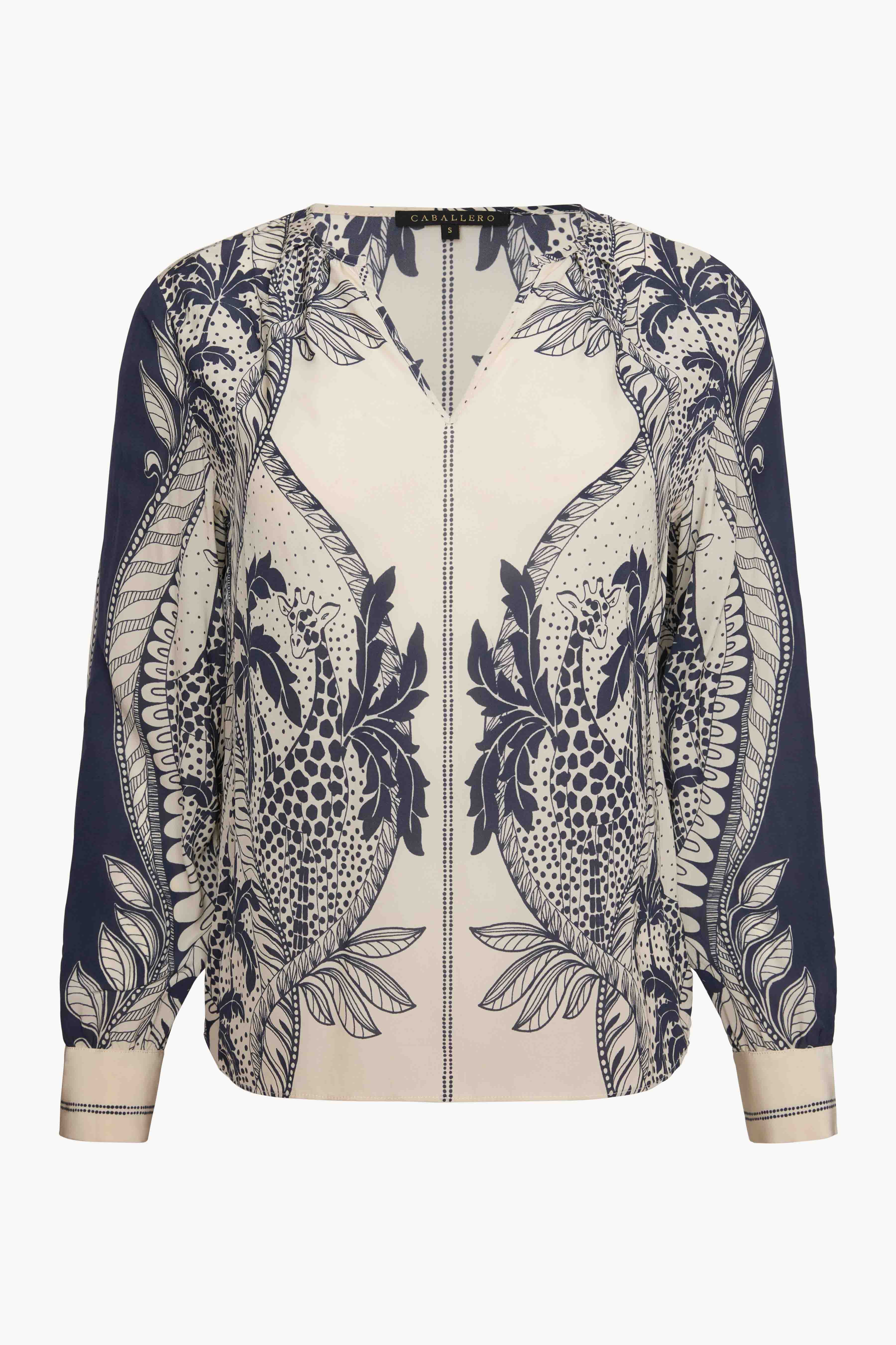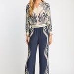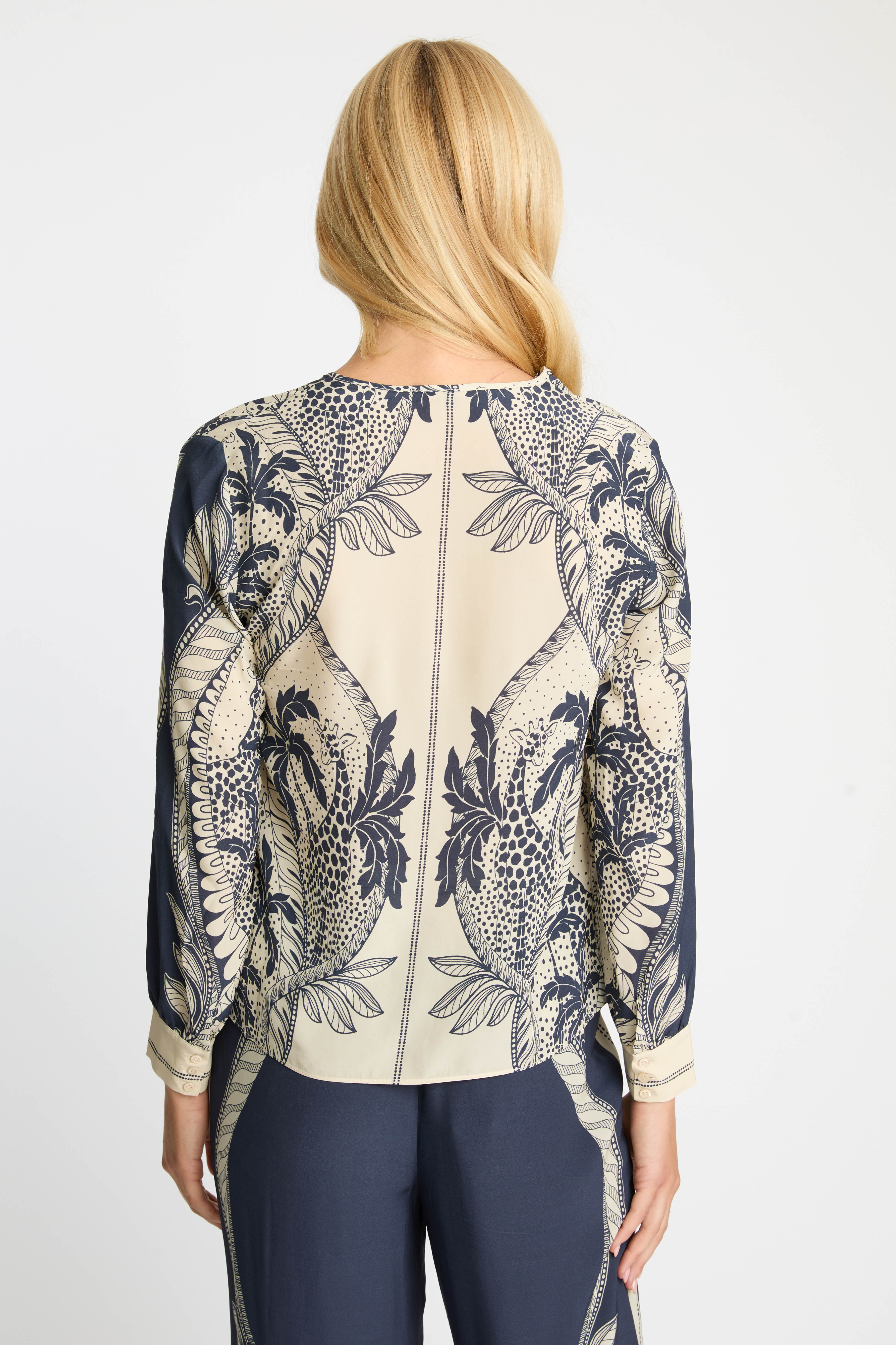 The Fern Top in Ink Island is a relaxed, effortlessly stylish blouse designed for both comfort and visual impact. Featuring a slightly loose fit with a flattering V-neckline, it offers a modern, easy-to-wear silhouette. Full-length, gently flared sleeves add graceful movement and a soft, flowing shape, enhancing the blouse’s airy, lightweight feel.