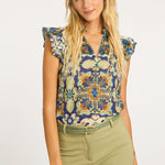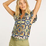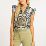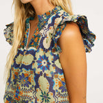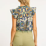 This top is elevated by its contrasting ruffled collar in a rich Pacific blue/green hue, providing an elegant pop of color. Perfect for casual outings or dressing up for a night out, the Filippa Top is a fun and flirty option that combines effortless style with a modern, animal-inspired print.