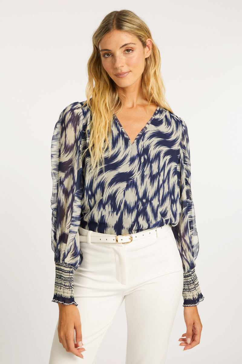 The Blue Katsuri print features a timeless navy blue pattern on an ivory base, adding a refined yet modern touch to your wardrobe. Whether paired with tailored pants for a polished look or denim for casual outings, the Flora Top is versatile, comfortable, and perfect for embracing seasonal style.