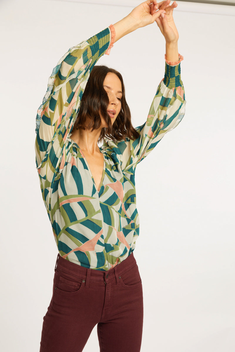 The Flora Top, now available in the elegant desert mosaic print, is a must-have for the season. Designed with long, billowy sleeves and finished with smocked cuffs, this top strikes the perfect balance between sophistication and ease. Its relaxed fit and lightweight viscose chiffon fabric make it an effortlessly chic choice for any occasion.