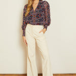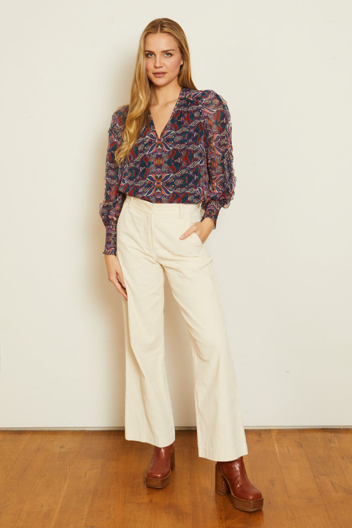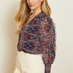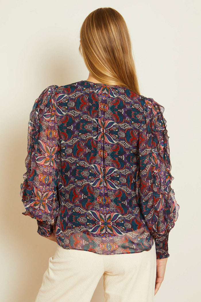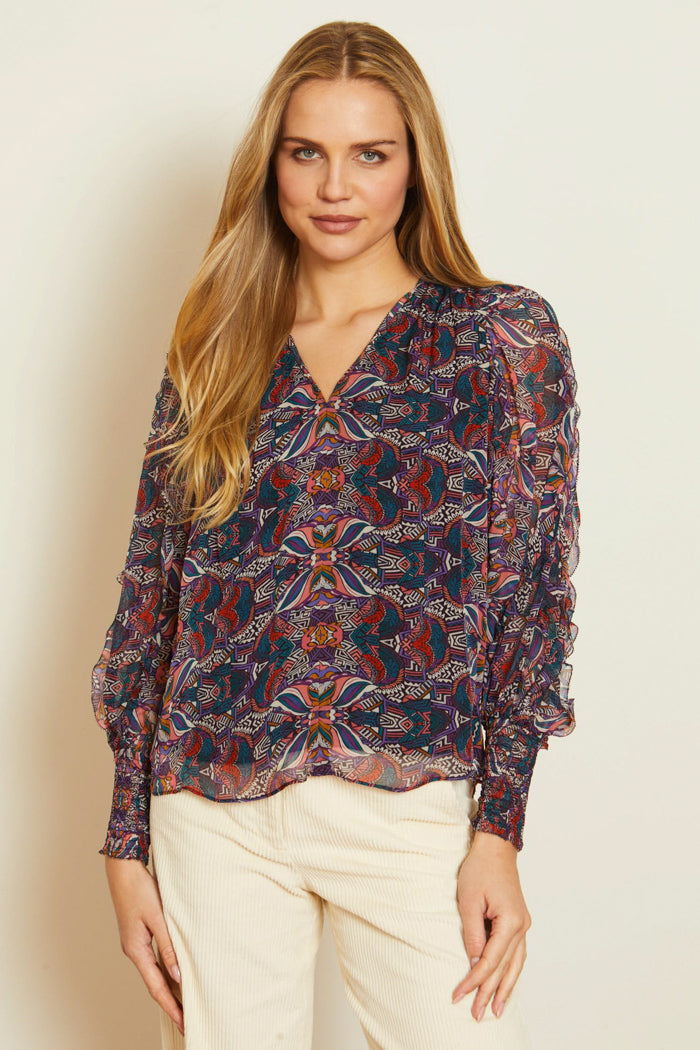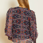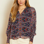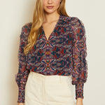 Our gorgeous Flora Top in the Kaleidoscope Leaves print. This long-sleeved blouse offers romantic elegance with soft, billowy sleeves, smocked cuffs, and a deep V-neckline.