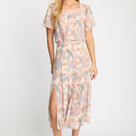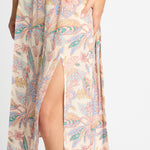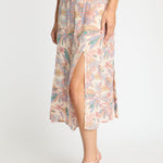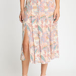 Rendered in a soft palette of blush, muted teal, warm olive, and cream with fine linework, the print feels both delicate and softly graphic. Designed with a flattering high-rise waist and a soft, flowing drape, the Glenda Skirt is finished with two front slits that add movement and subtle allure. Easy to dress up or down, it pairs beautifully with simple knits, tucked-in blouses, or matching Paisley Floral pieces for a coordinated look.