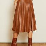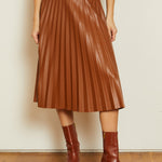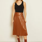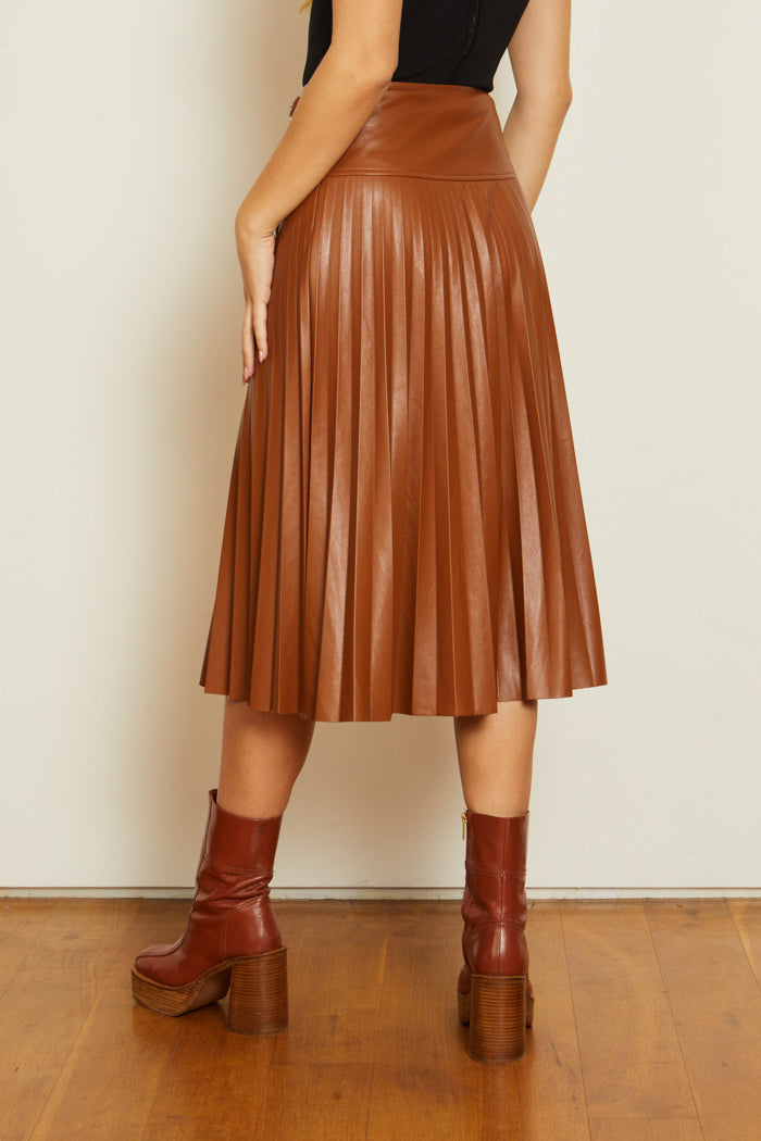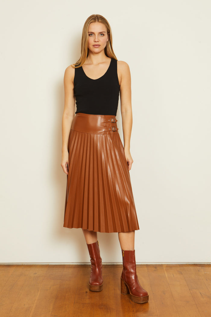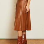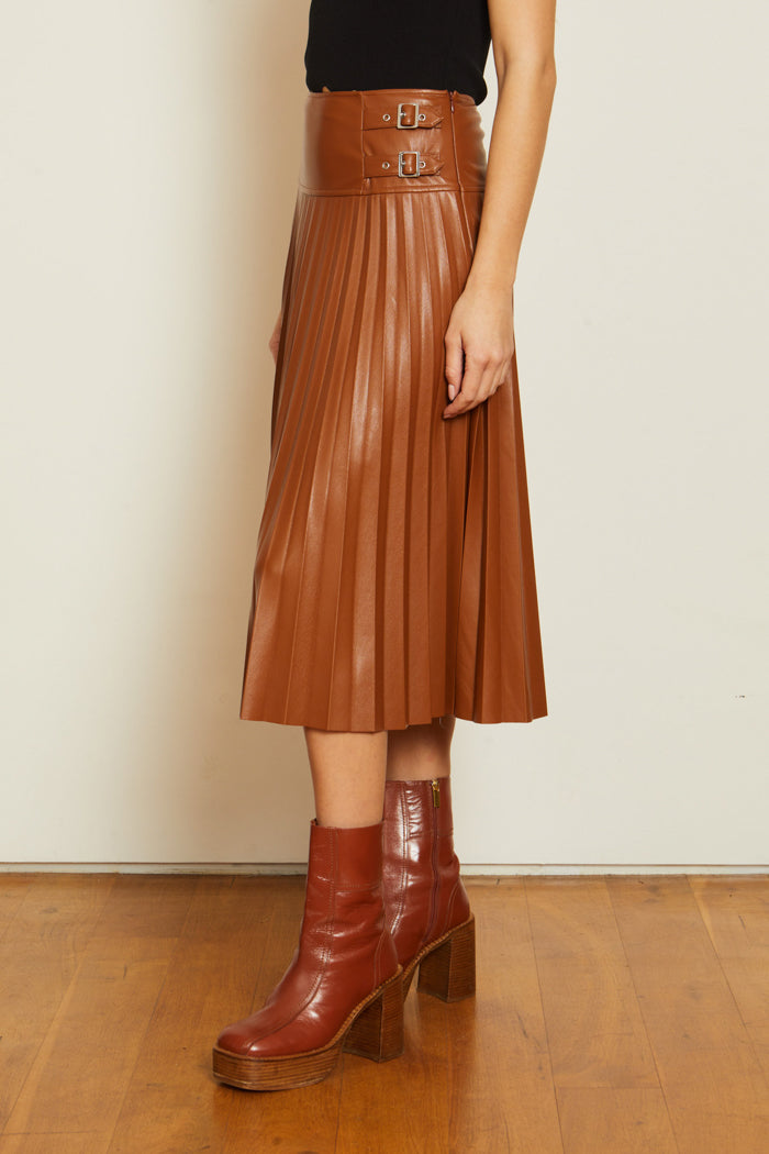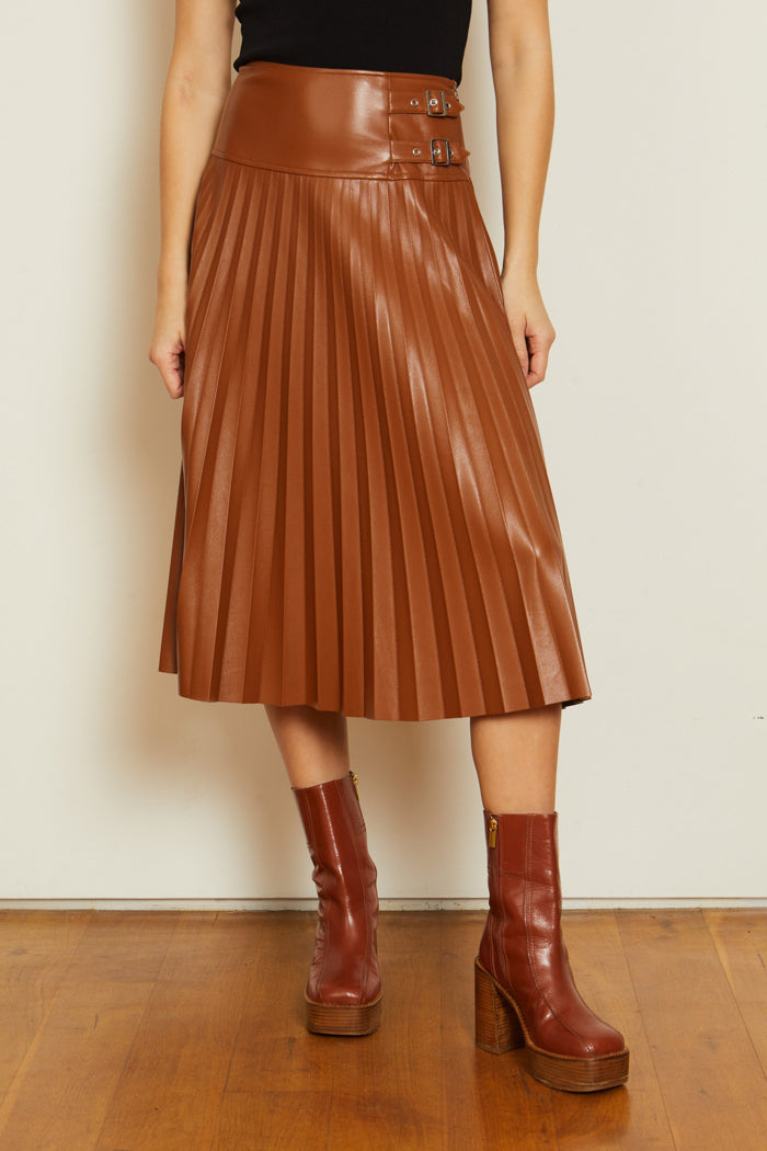The Hendrix Skirt is a bold and beautiful faux leather piece in a rich tobacco shade. Cascading pleats add elegance and movement, while the wide, smooth waistband with two decorative buckles cinches for a flattering silhouette. Dress it up with a silk blouse and heels for a night out, or keep it casually chic with a graphic tee and sneakers.