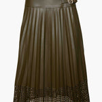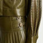 The Hensley Skirt in Loden Green Vegan Leather is a modern statement piece that blends structure with fluid movement. Crafted from smooth, supple vegan leather in a rich loden green hue, it features a flattering high-rise waist accented with sleek buckle detailing for a subtle utilitarian edge.