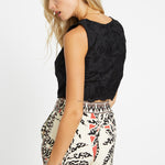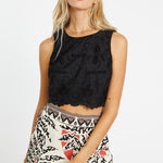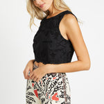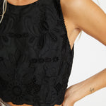 Our beloved Isabelle Top is back—now in elegant black poly lace. This cropped, sleeveless silhouette is perfect for warm weather, offering a breezy yet refined look. Intricate lace detailing adds texture and a touch of romance, making it a versatile piece for both casual and dressy occasions.