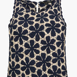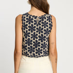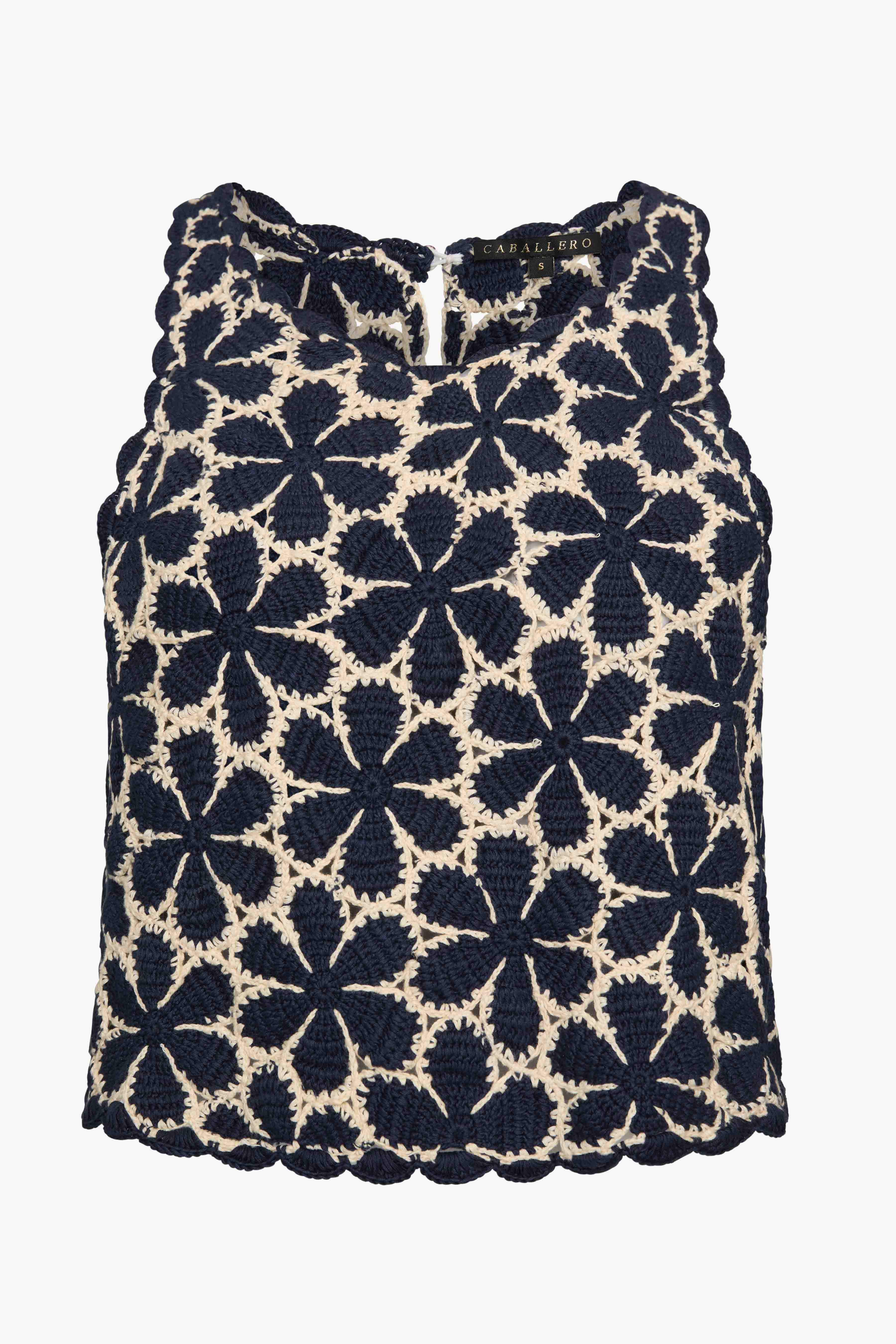 The Isabelle Top is a sleeveless, handmade statement tank crafted from intricate crochet-style lace in a striking navy-and-cream palette. Featuring an allover floral motif, this piece blends artisanal detail with a clean, modern silhouette. Softly scalloped edges along the neckline, straps, and hem add a refined, feminine finish.