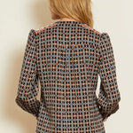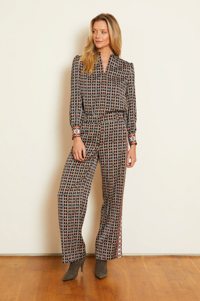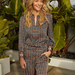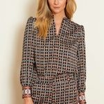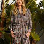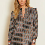 Crafted from luxurious poly crepe that drapes beautifully, and featuring our Moderne Geo print takes center stage which features a chic interplay of geometric shapes in a striking palette with pops of orange.