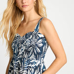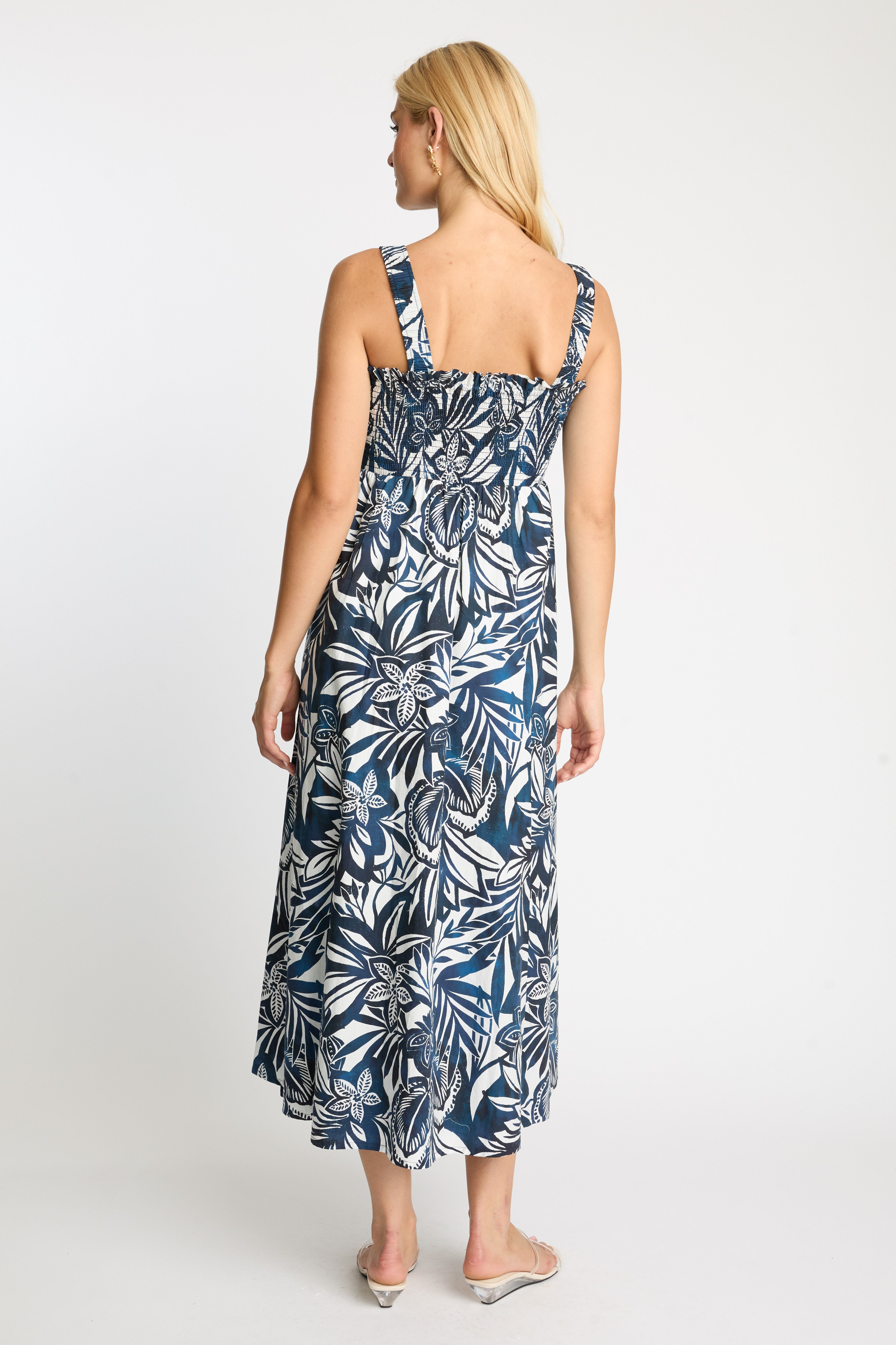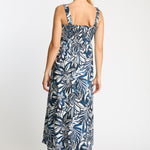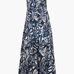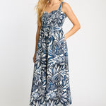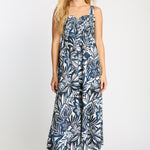 The Josephine Dress in Woodblock Palm is a flowing maxi silhouette designed for effortless comfort and statement style. Featuring a bold navy and white tropical leaf print, the design evokes the relaxed beauty of island breezes and sun-drenched days. The softly gathered bodice is enhanced with smocking that creates a flattering, comfortable fit, while delicate elasticized straps allow for a customizable feel.