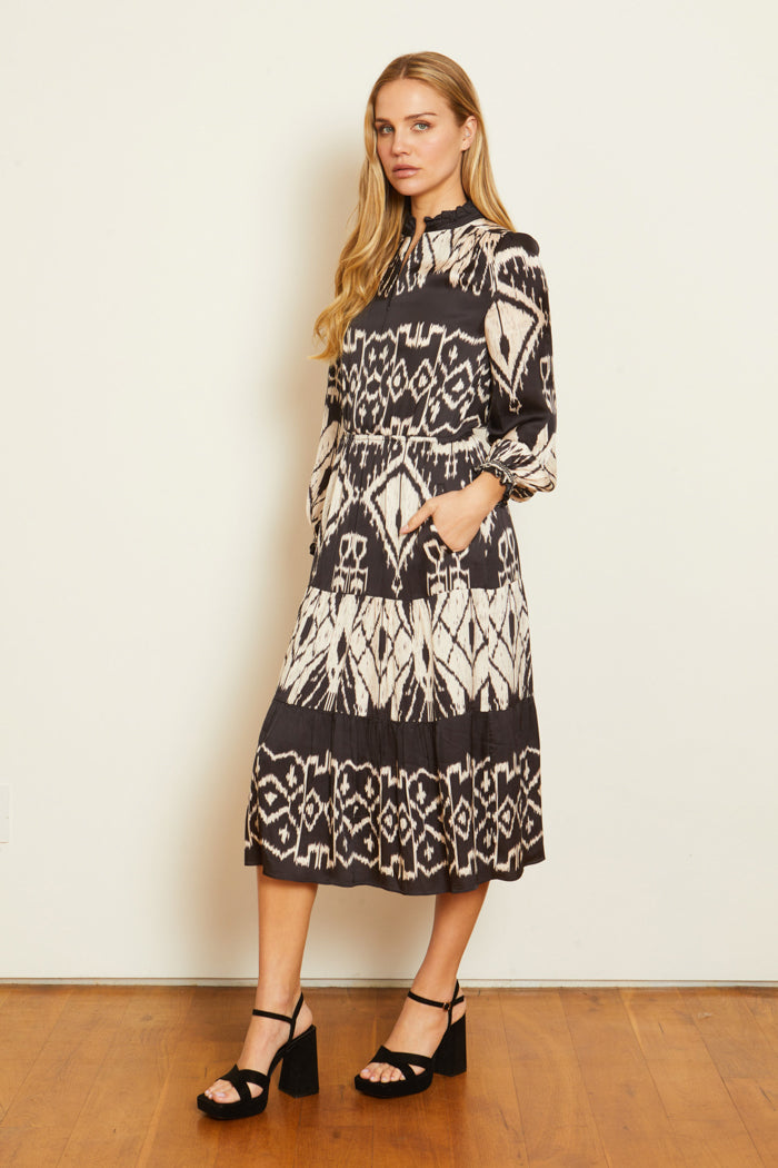 This long-sleeved maxi dress, crafted from a luxurious blend of viscose and rayon, drapes beautifully against the body for a flattering silhouette. Our captivating ikat tapestry print, a mesmerizing black and white design, adds a touch of artistic flair to our Julie Dress.