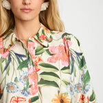 The Buttercream Floral print showcases softly rendered blooms in shades of pink, coral, yellow, and blue layered over a creamy buttercream backdrop. Lush green foliage adds depth and balance, creating a timeless yet fresh palette that feels warm, flattering, and easy to style. Pair it with tailored trousers or denim for an elevated yet effortless look.
