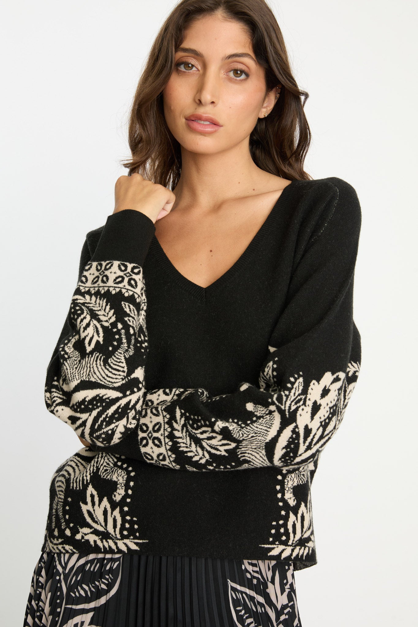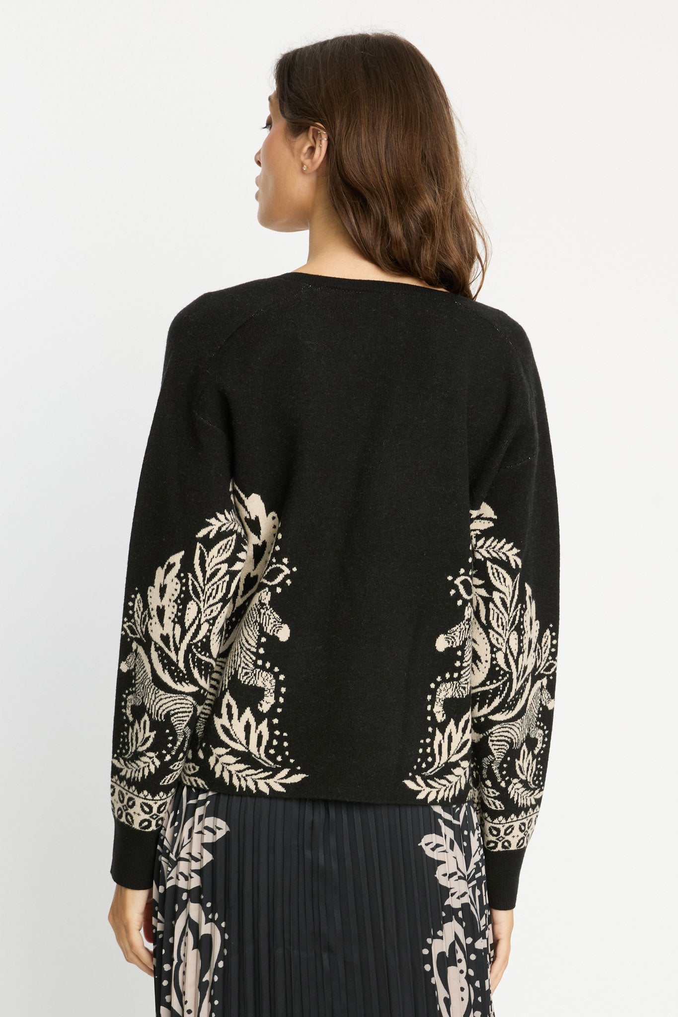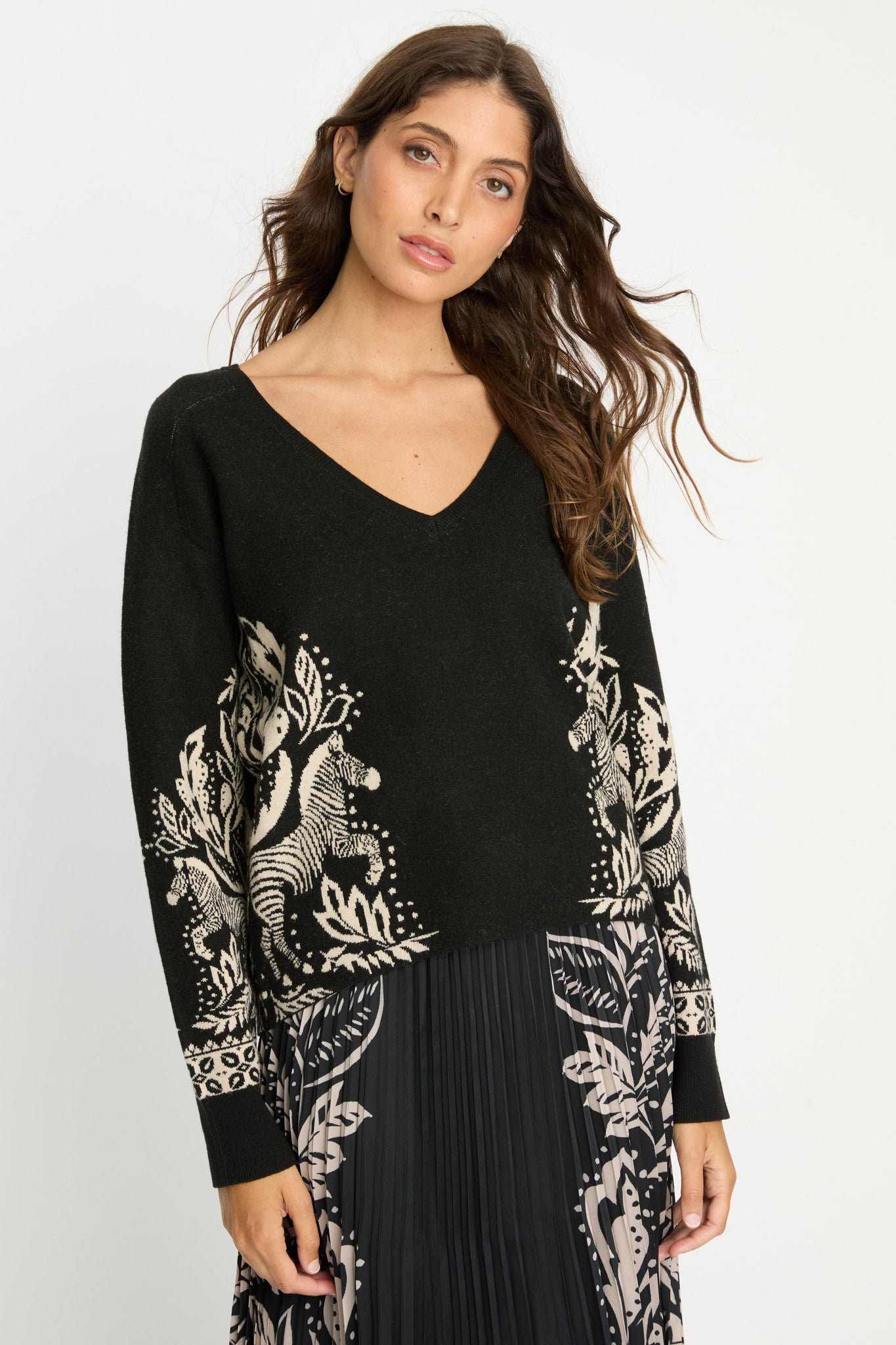 The Krista Sweater brings cozy sophistication with a bold twist. Featuring a relaxed fit and flattering v-neckline, this style is elevated with our striking Zebra Fern motif, where playful zebras peek through stylized leaves and ferns.