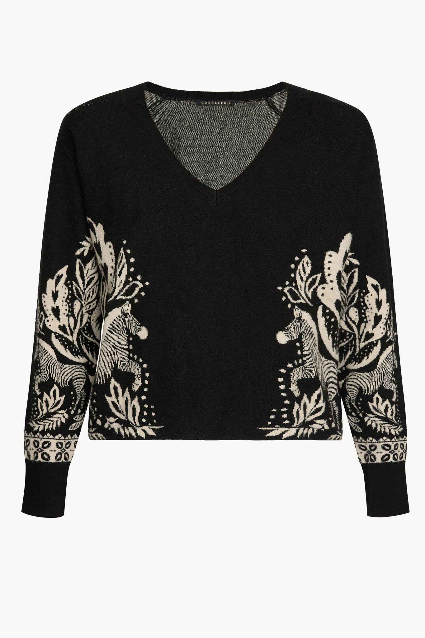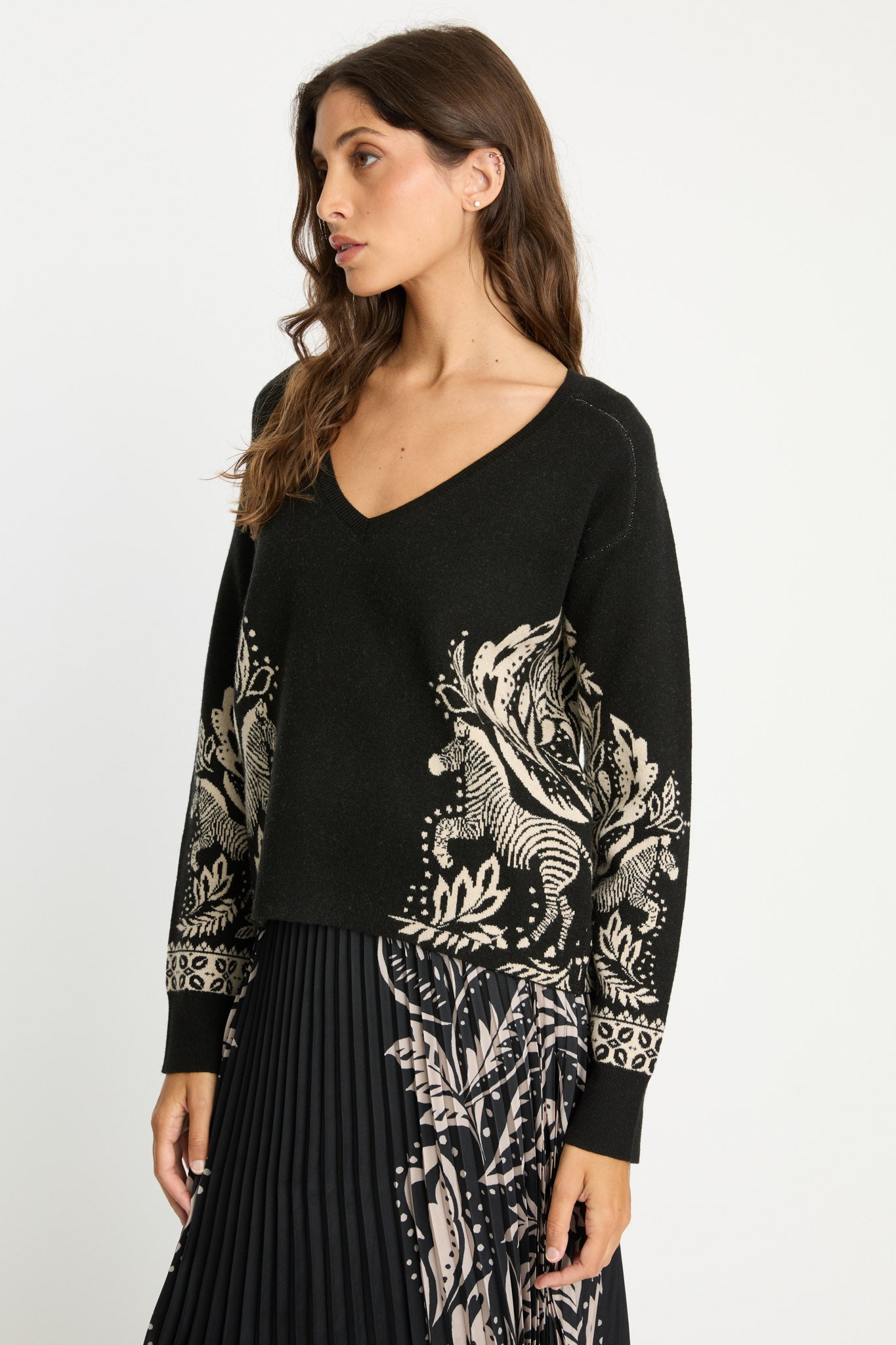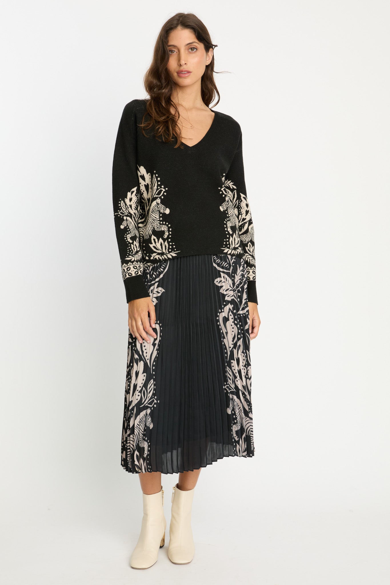 The Krista Sweater brings cozy sophistication with a bold twist. Featuring a relaxed fit and flattering v-neckline, this style is elevated with our striking Zebra Fern motif, where playful zebras peek through stylized leaves and ferns.