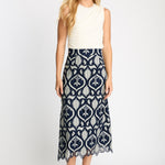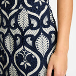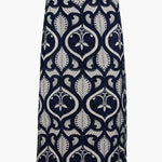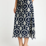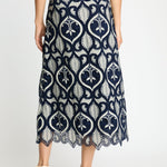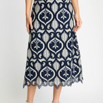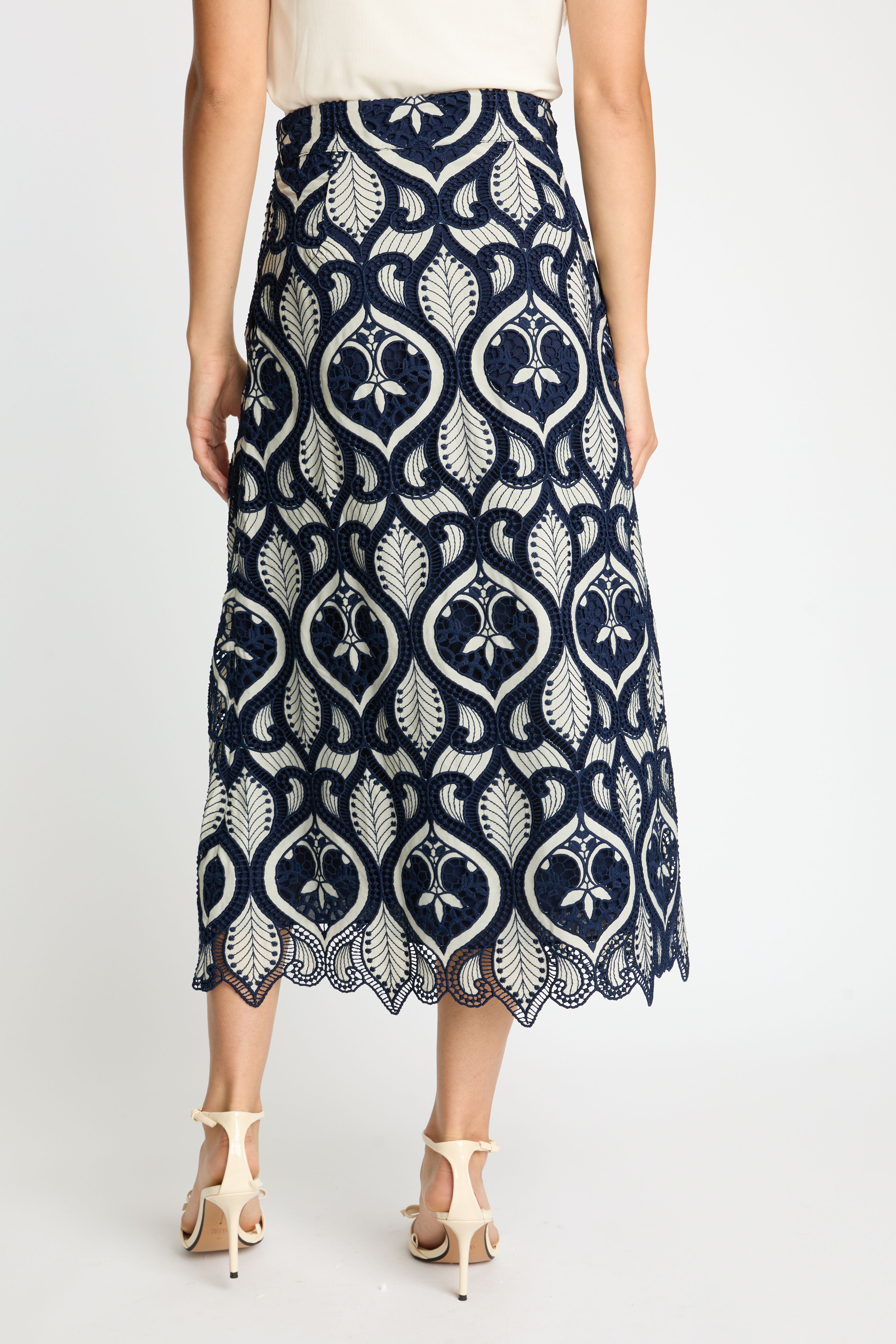 The Laney Skirt brings timeless elegance to life with its intricate navy and cream lace design. Delicate floral and paisley motifs create a striking pattern, layered over a soft cream base that highlights the richness and detail of the lace. The result is a look that feels both classic and contemporary, offering refined texture and visual depth.