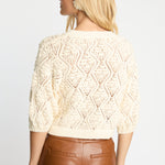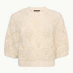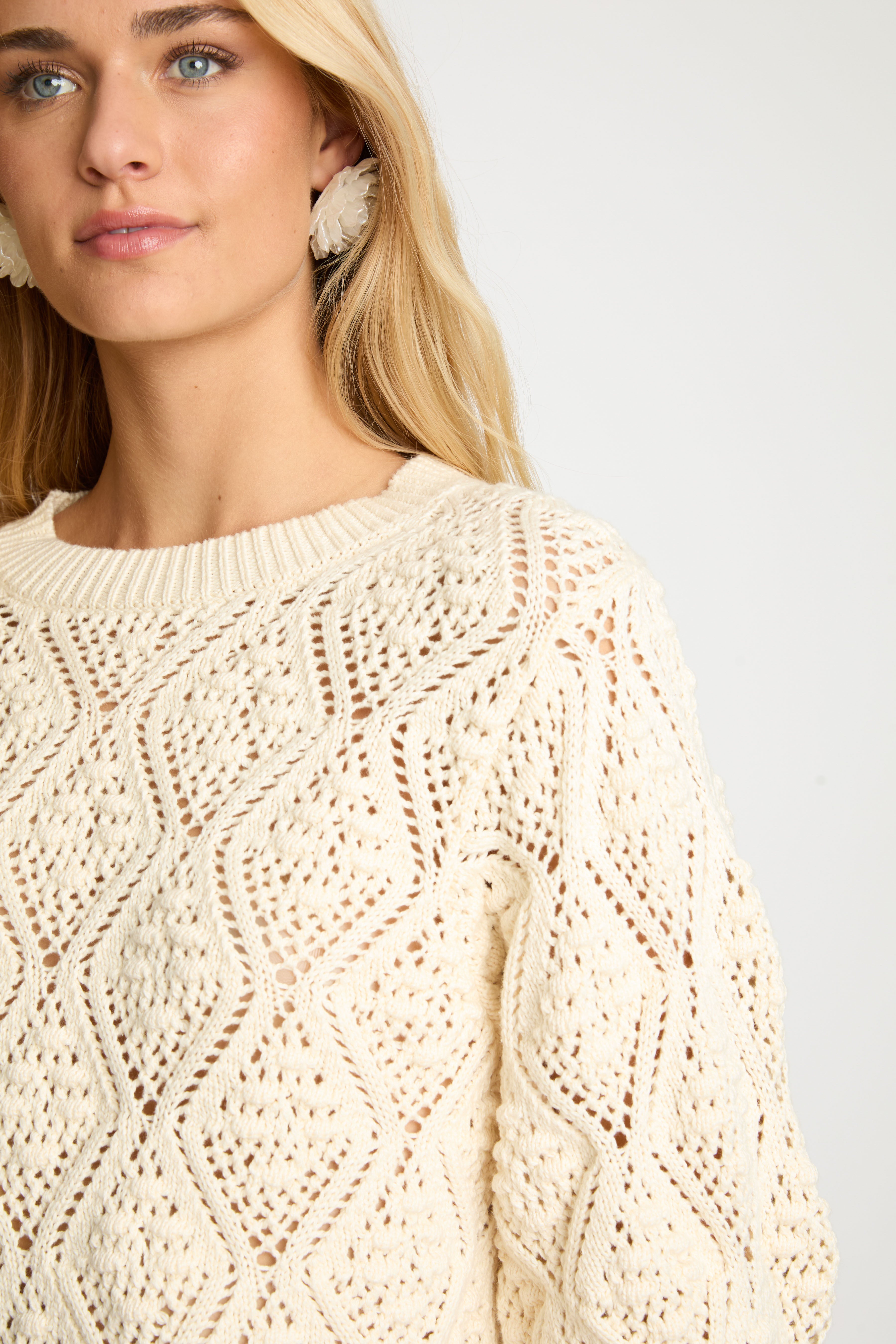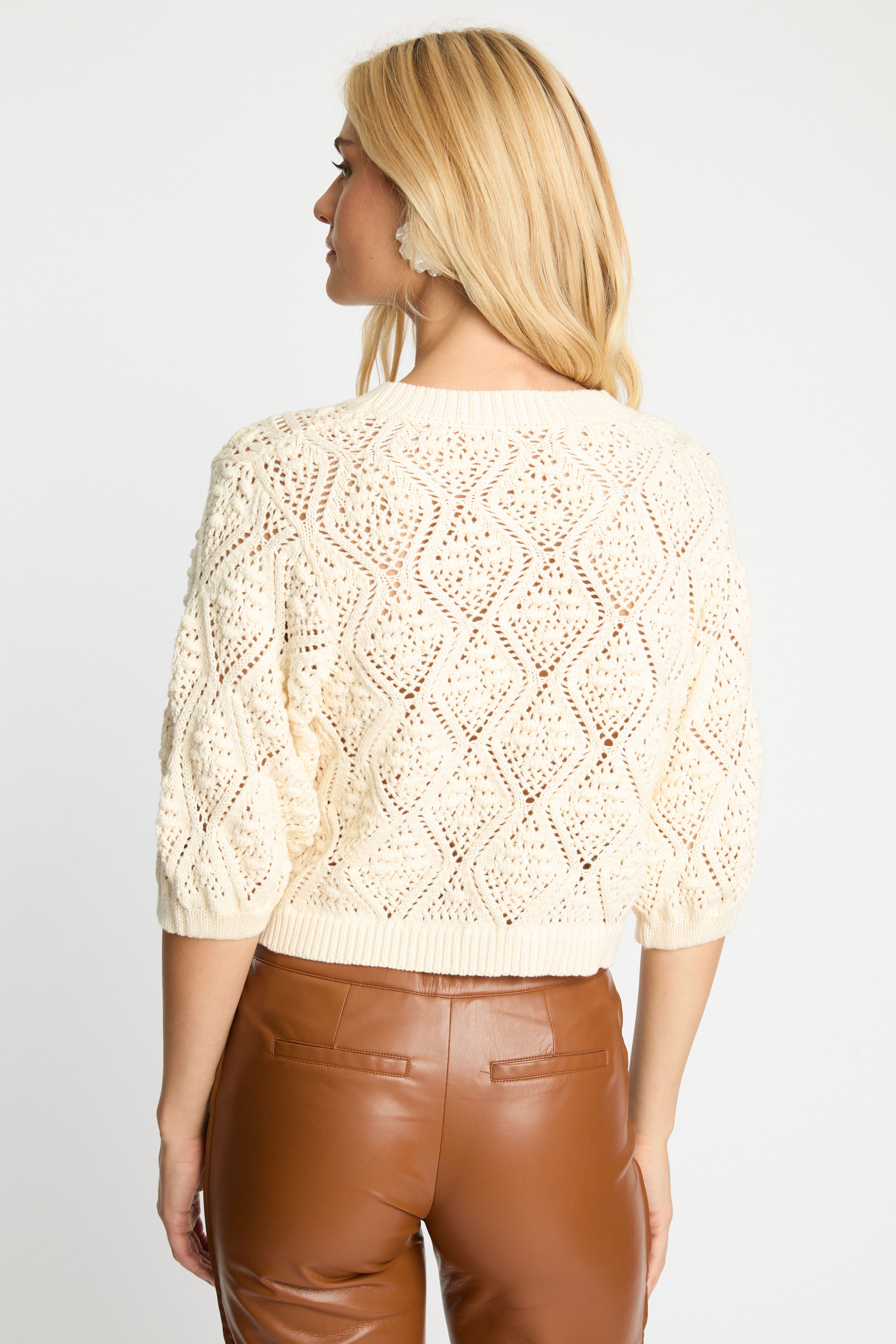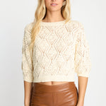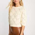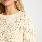 The Layla Sweater in cream is a beautifully textured knit designed to elevate everyday layering. Crafted with an intricate openwork pattern, it features diamond-shaped details interwoven with raised stitches that create depth and visual interest throughout. A classic crew neckline and three-quarter sleeves give the silhouette a timeless, effortless feel.