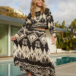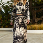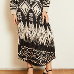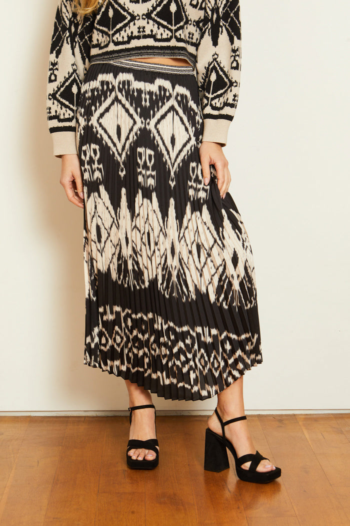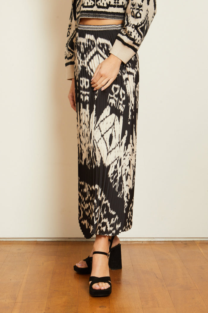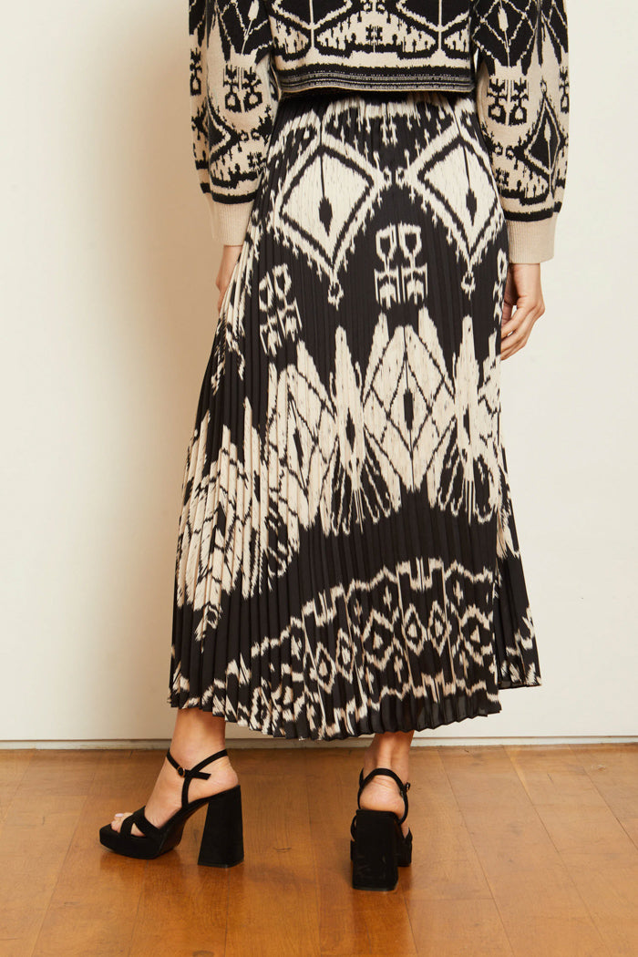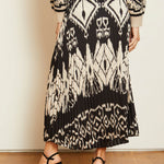 The Lucille skirt offers a fresh twist on a beloved classic. Our Lucille Skirt features a plush elastic waistband that ensures all-day comfort, while the captivating ikat tapestry design, a stunning black and white masterpiece, adds a touch of artistic flair. Effortlessly chic, the Lucille skirt pairs perfectly with an elegant blouse or our cozy Maeva sweater for a timeless look that will take you from day to night.