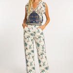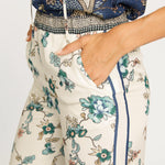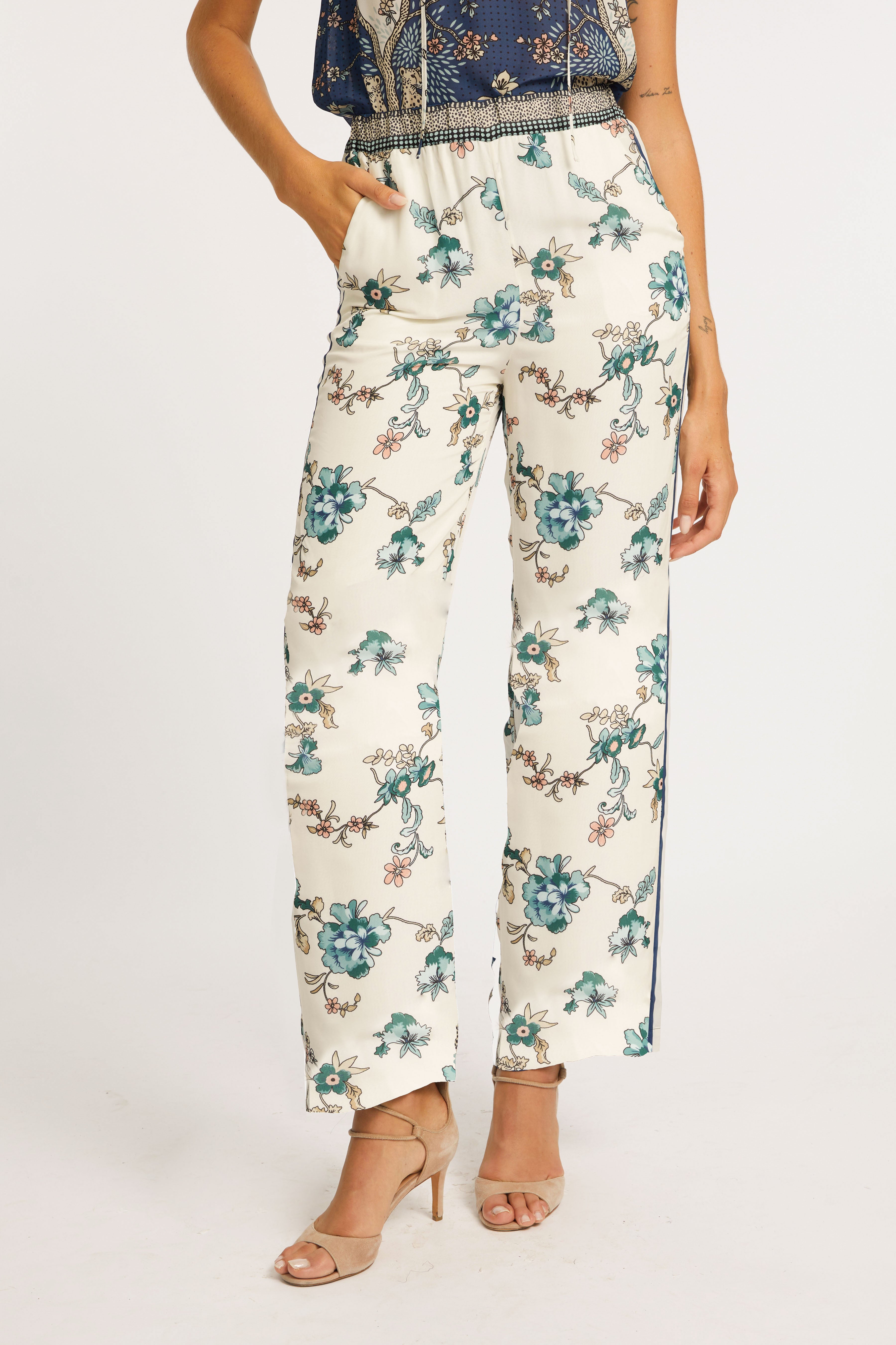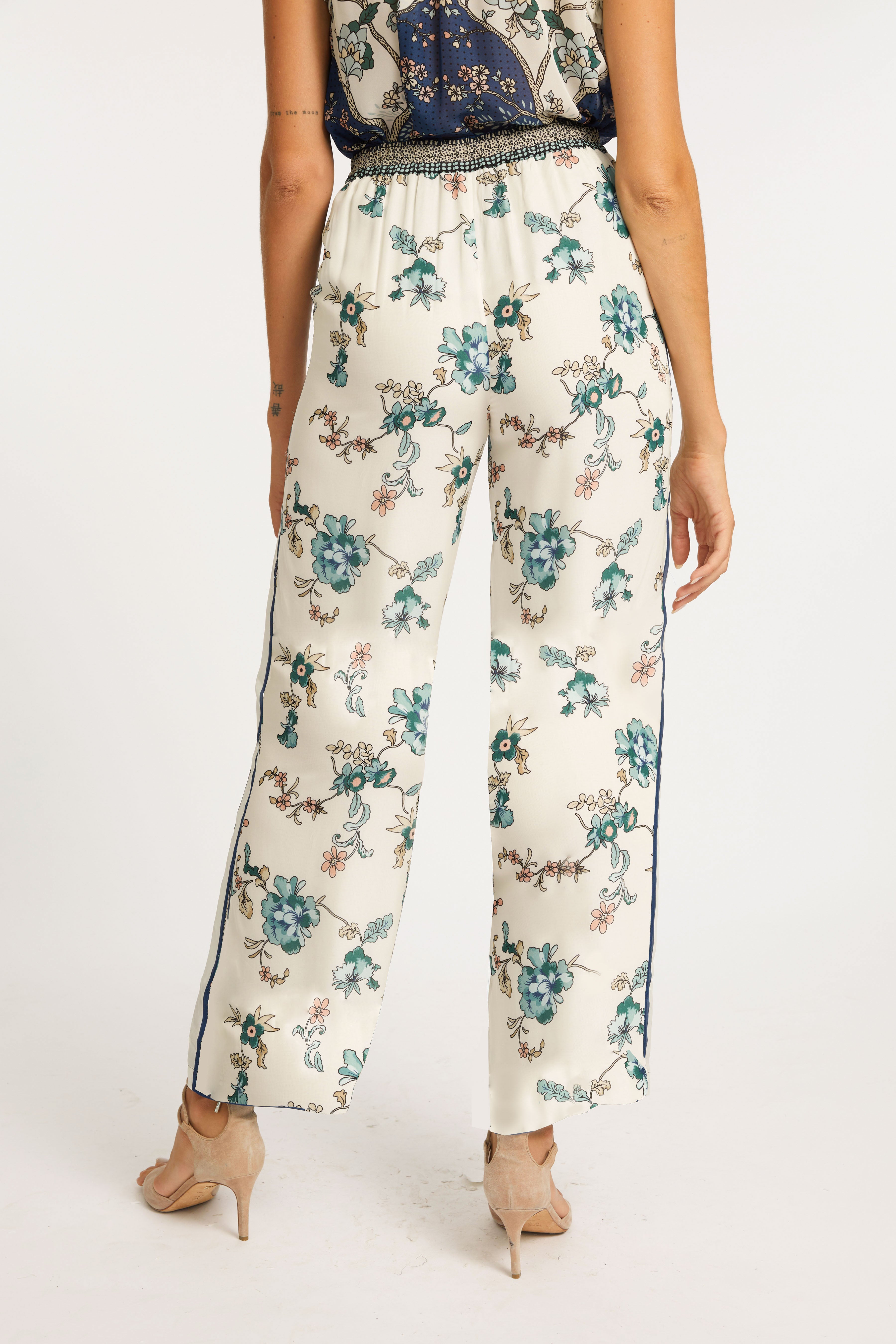 Crafted from 100% viscose fabric, the Cheetah Reflections print features a floral pattern accentuated by a white background. The trim of this pant mimics the spots on a cheetah adding a touch of the wild to a classic elegant pant. Soft, breathable, and lightweight, it’s perfect for creating standout designs with a touch of wild charm.