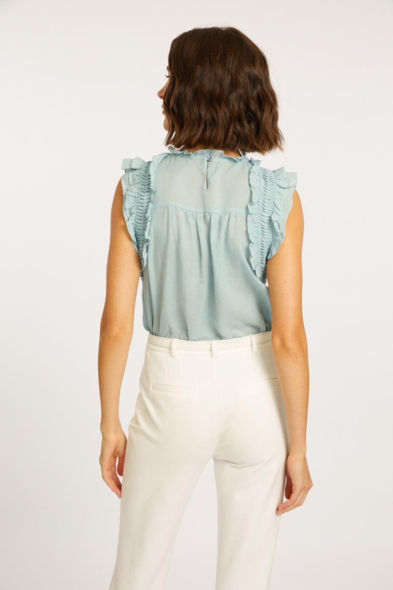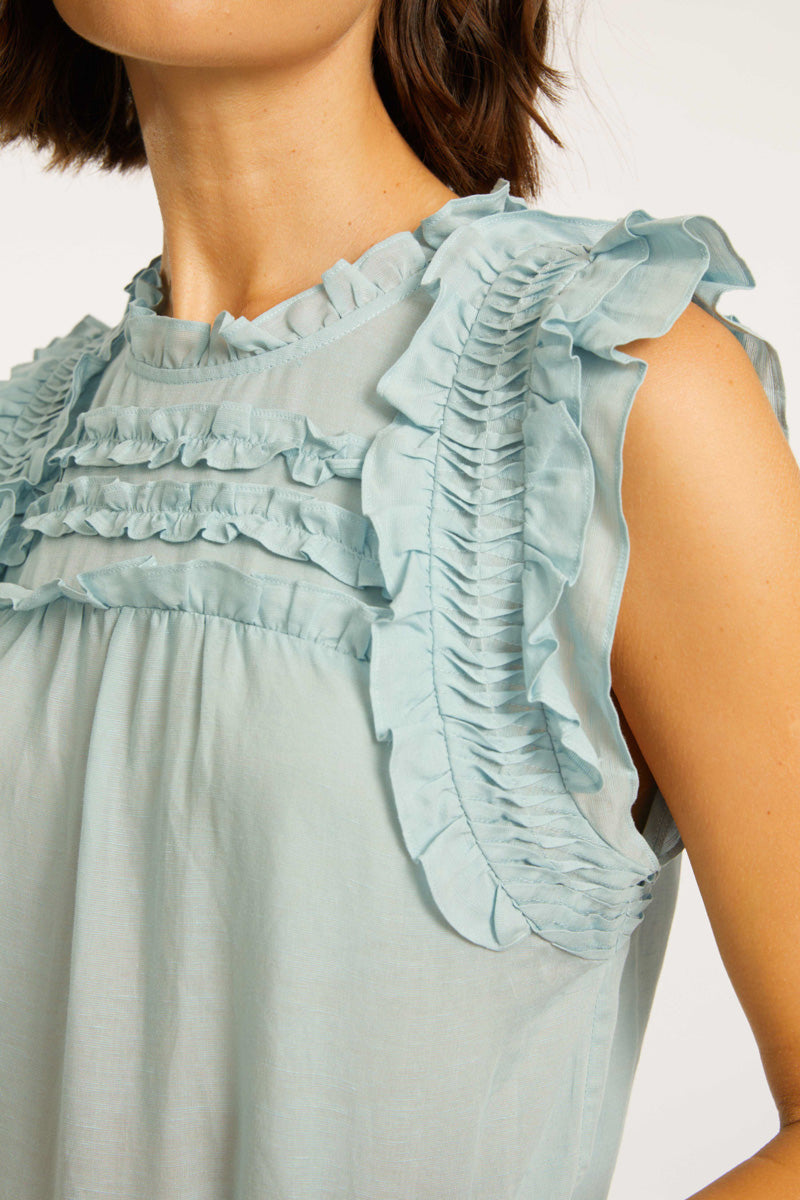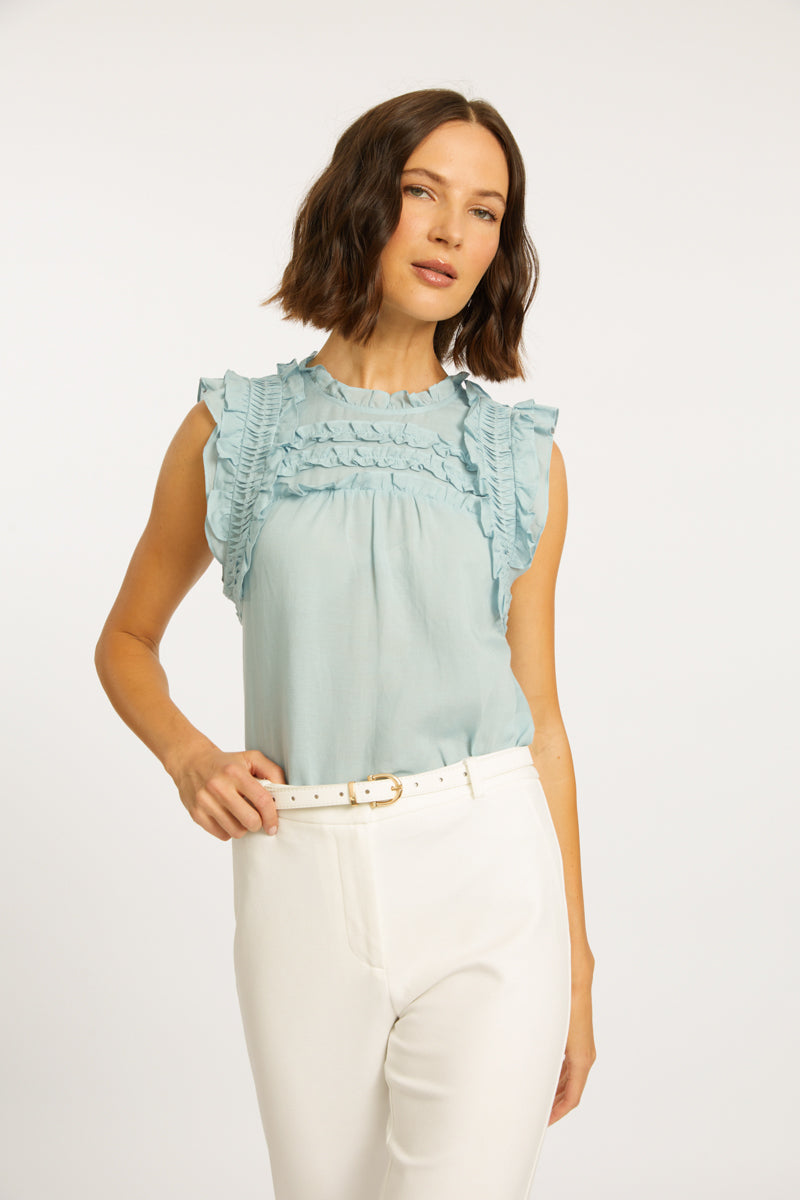 The sterling blue hue brings a subtle sophistication, while the ruffles add a playful, elegant flair. Whether paired with jeans, skirts, or shorts, the Micheline Top is a versatile piece that will keep you looking chic and feeling comfortable all day long.