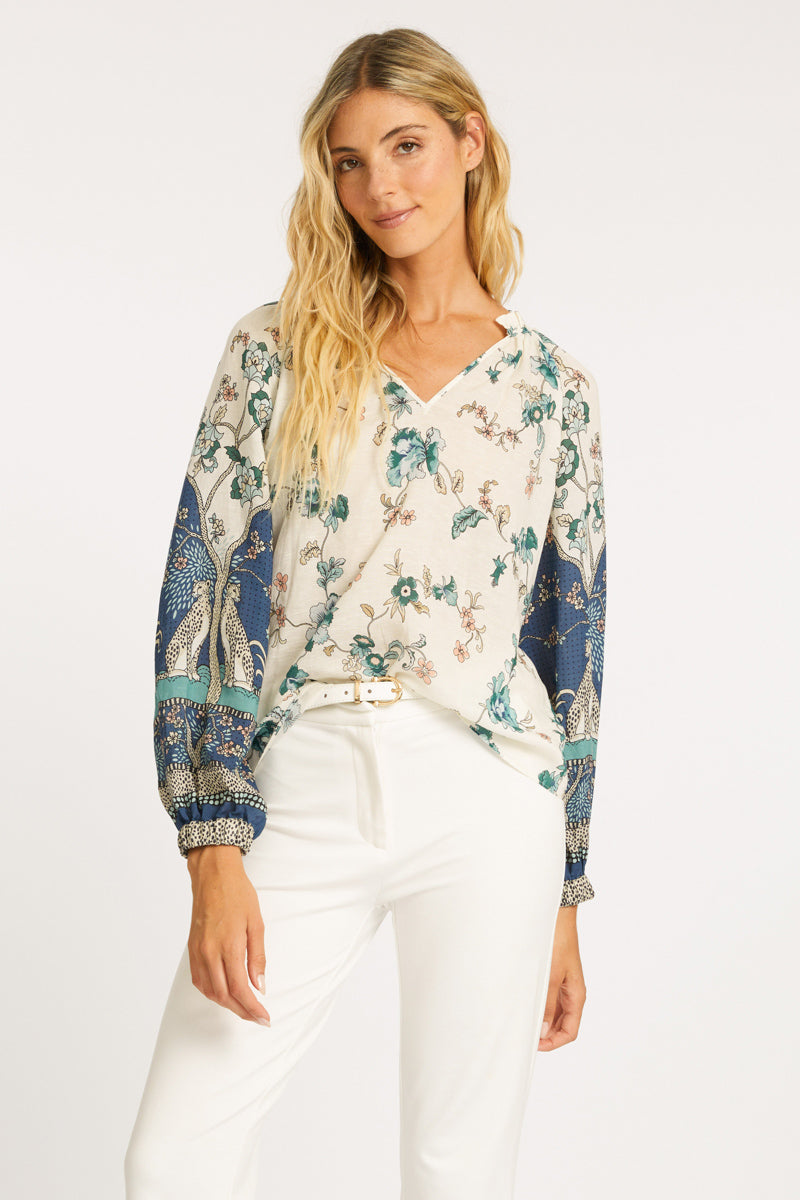 Best-selling Miki Top in Cheetah Reflections, a timeless essential for every season. Effortlessly complementing high-waisted jeans, it features a V-neck with binding, shirring at shoulder, raglan sleeves, and plush elastic smocked cuffs for elegant detailing. The versatile fit makes it a wardrobe staple.