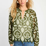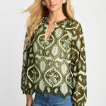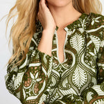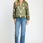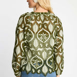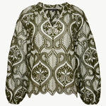 The Miki Top in Loden Green Lace is a striking blend of bold pattern and feminine craftsmanship. Designed with a softly notched neckline and long sleeves, this silhouette feels refined yet statement-making. The intricate lace overlay features ornate, scrolling motifs in rich loden green layered over a cream base, creating beautiful contrast and depth.