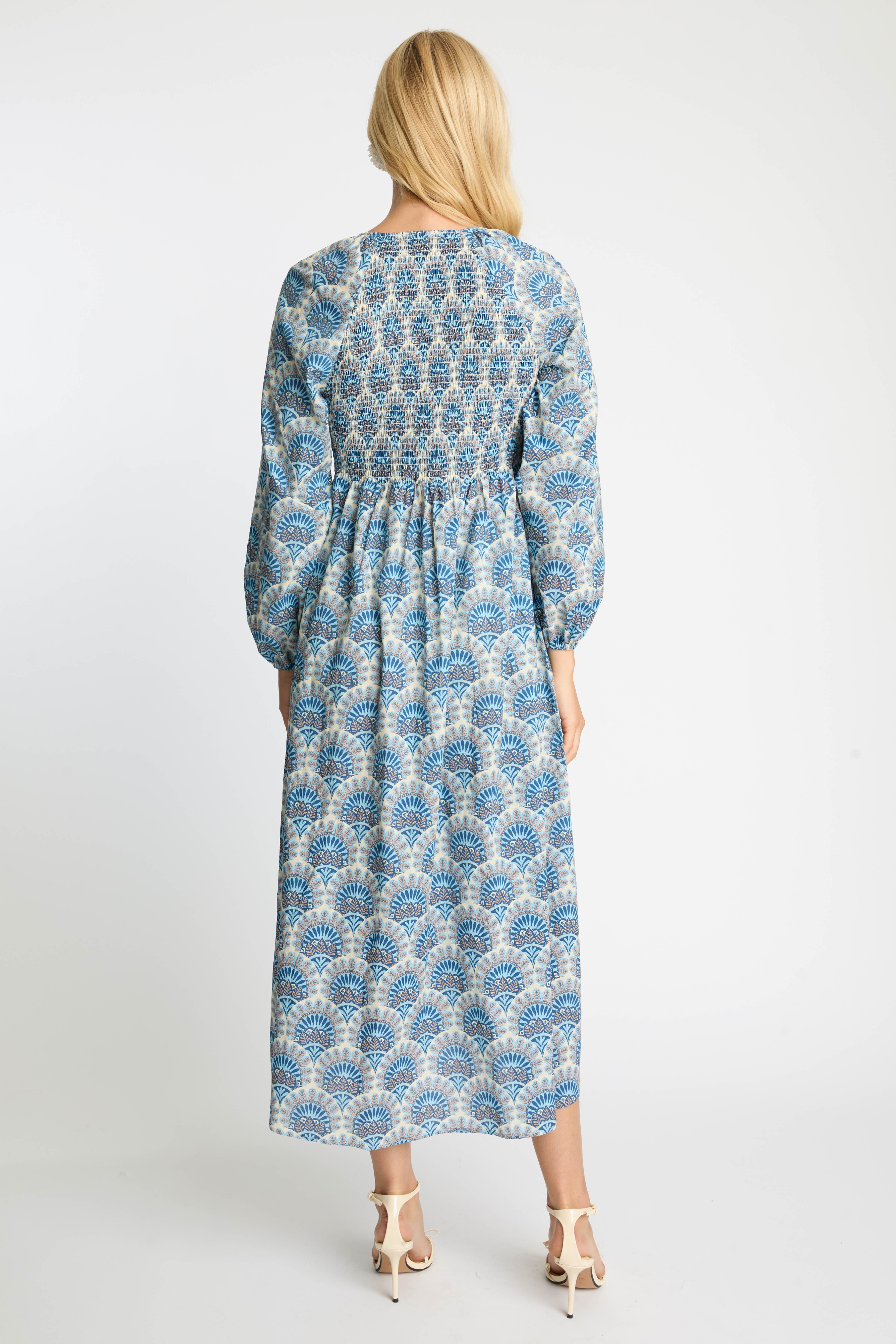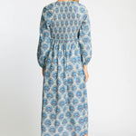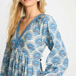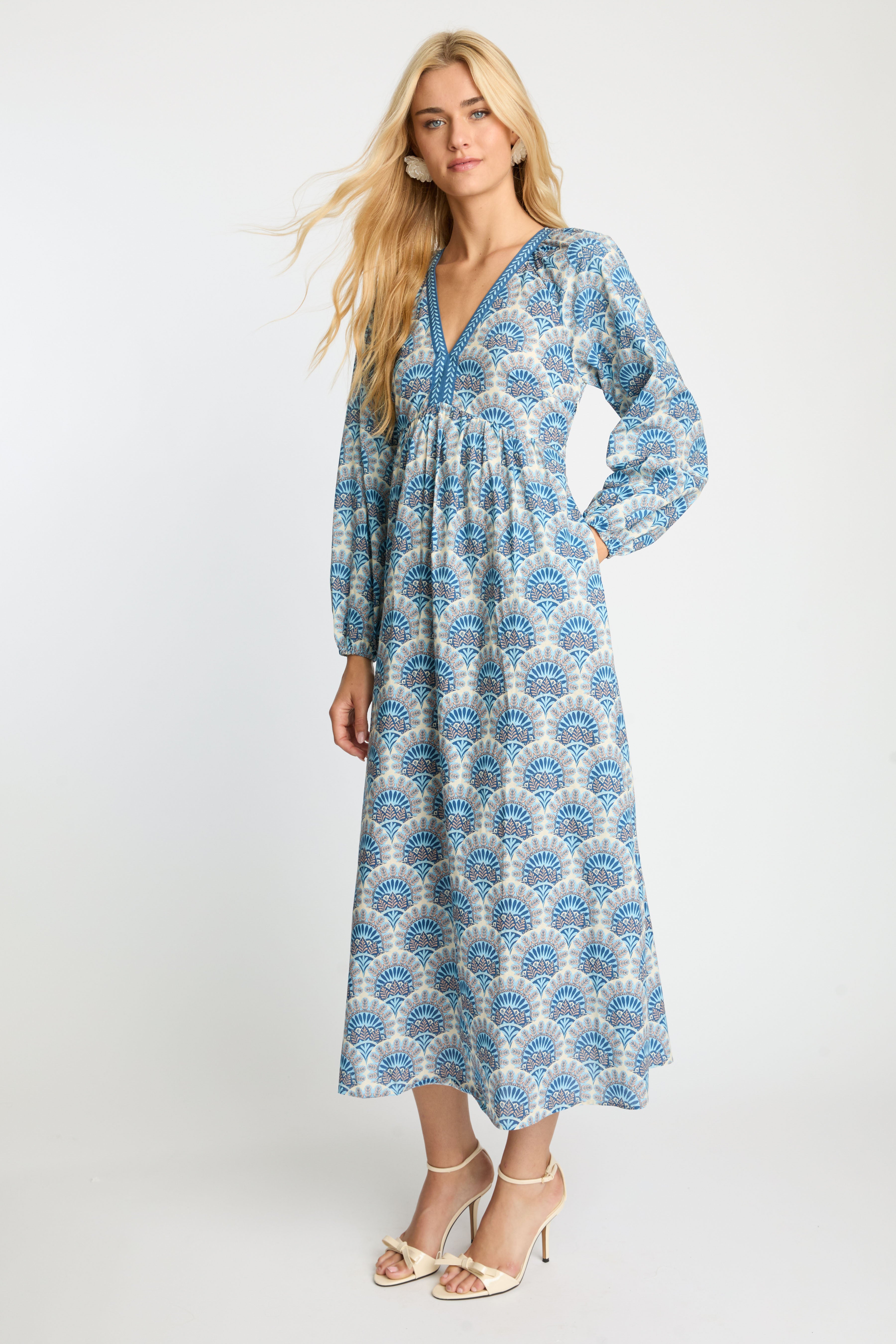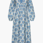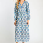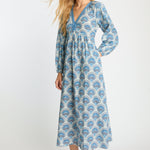 Embrace effortless elegance with the Mindy Dress in our signature Boho Deco print. This midi-length silhouette showcases a cool palette of blue, gray, and ivory, creating a look that feels both fresh and timeless. Billowing long sleeves and a softly defined empire waist offer a relaxed yet refined shape that flatters with ease.