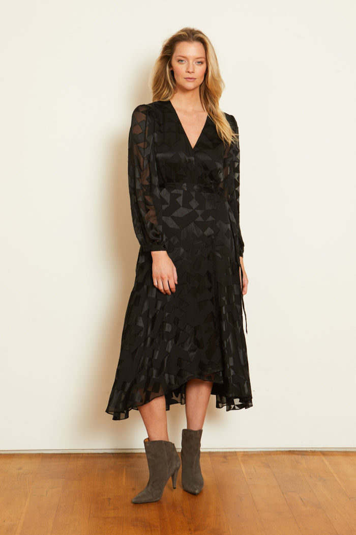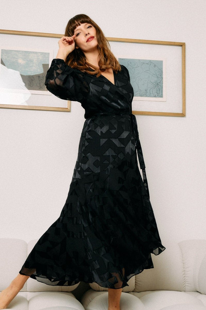 Crafted from black velvet burnout fabric with a subtle sheen and a mesmerizing all-over triangle print, this luxurious maxi dress is a show-stopping piece, perfect for special occasions or nights out.