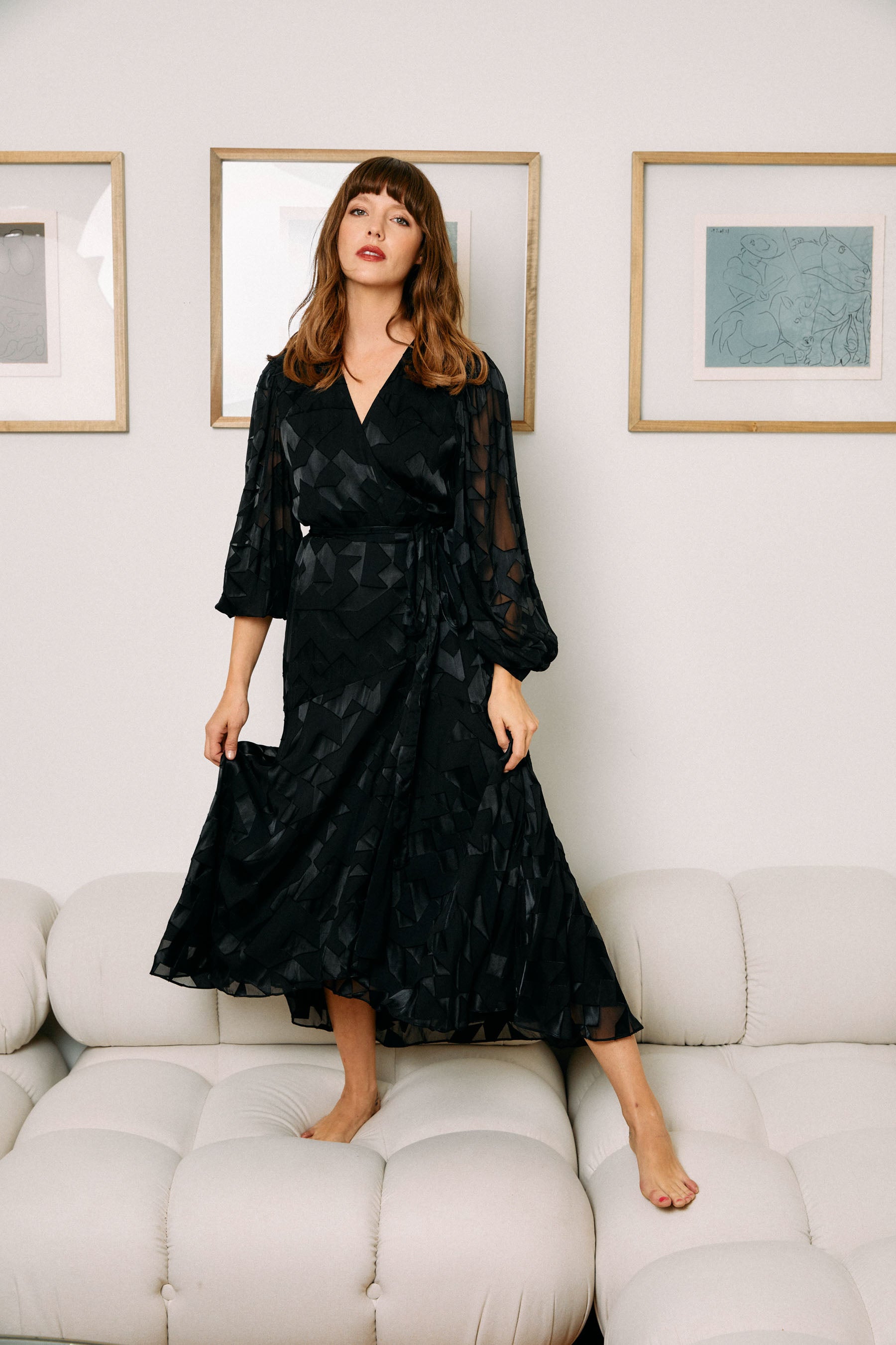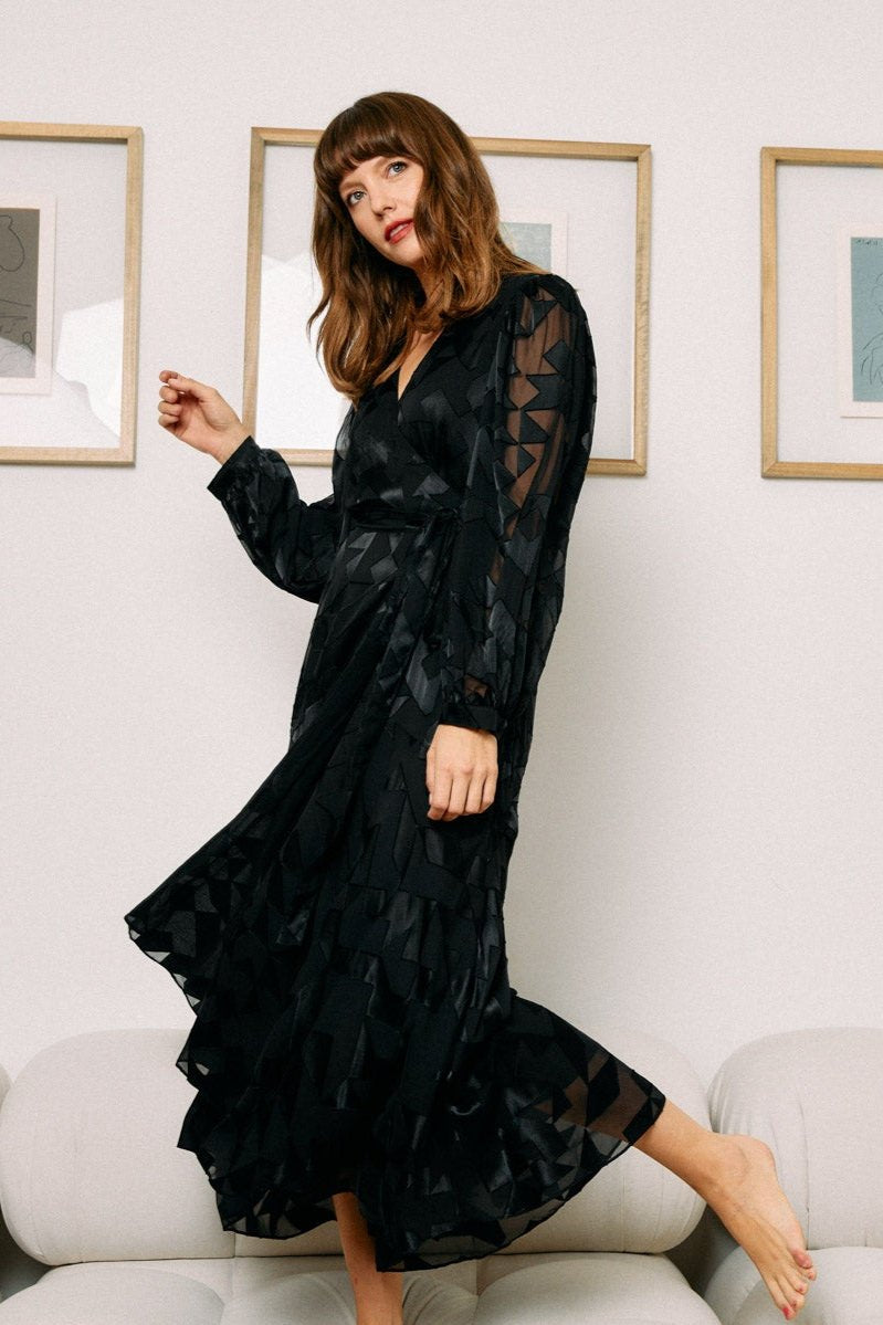 The Moon Maxi Dress exudes elegance and grace with its wrap design, creating an alluring v-neckline and delicate elastic cuffed sleeves. Pair it with strappy heels for added glamour.