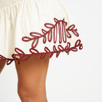 Introducing the Nadine Skirt, a smocked flounce skirt that beautifully blends comfort with style. Crafted from ivory cotton twill, it’s adorned with chocolate-hued leafy embroidery that brings an artisanal touch to its refined silhouette. The smocked waistband offers a flattering, flexible fit, making it an easy, versatile piece for everyday wear.