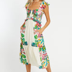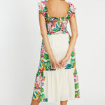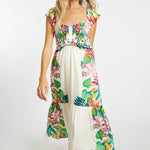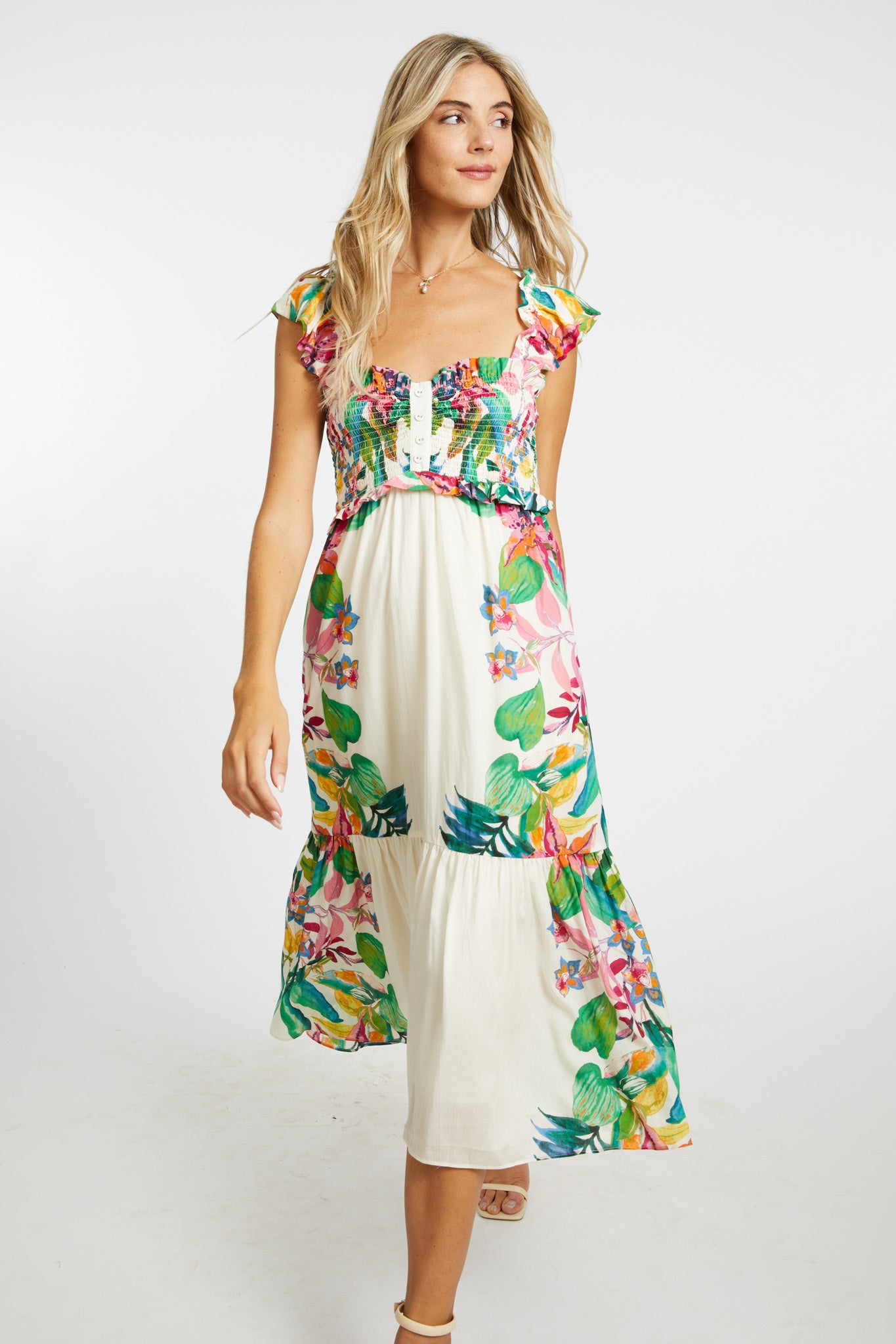 The smocked bodice offers a comfortable, flattering fit, while ruffled straps add a feminine touch. A delicate ruffle trim at the waist enhances the silhouette, and a tiered hem brings graceful movement to the midi-length design. Effortless and enchanting, the Nyx Dress is perfect for warm-weather occasions.