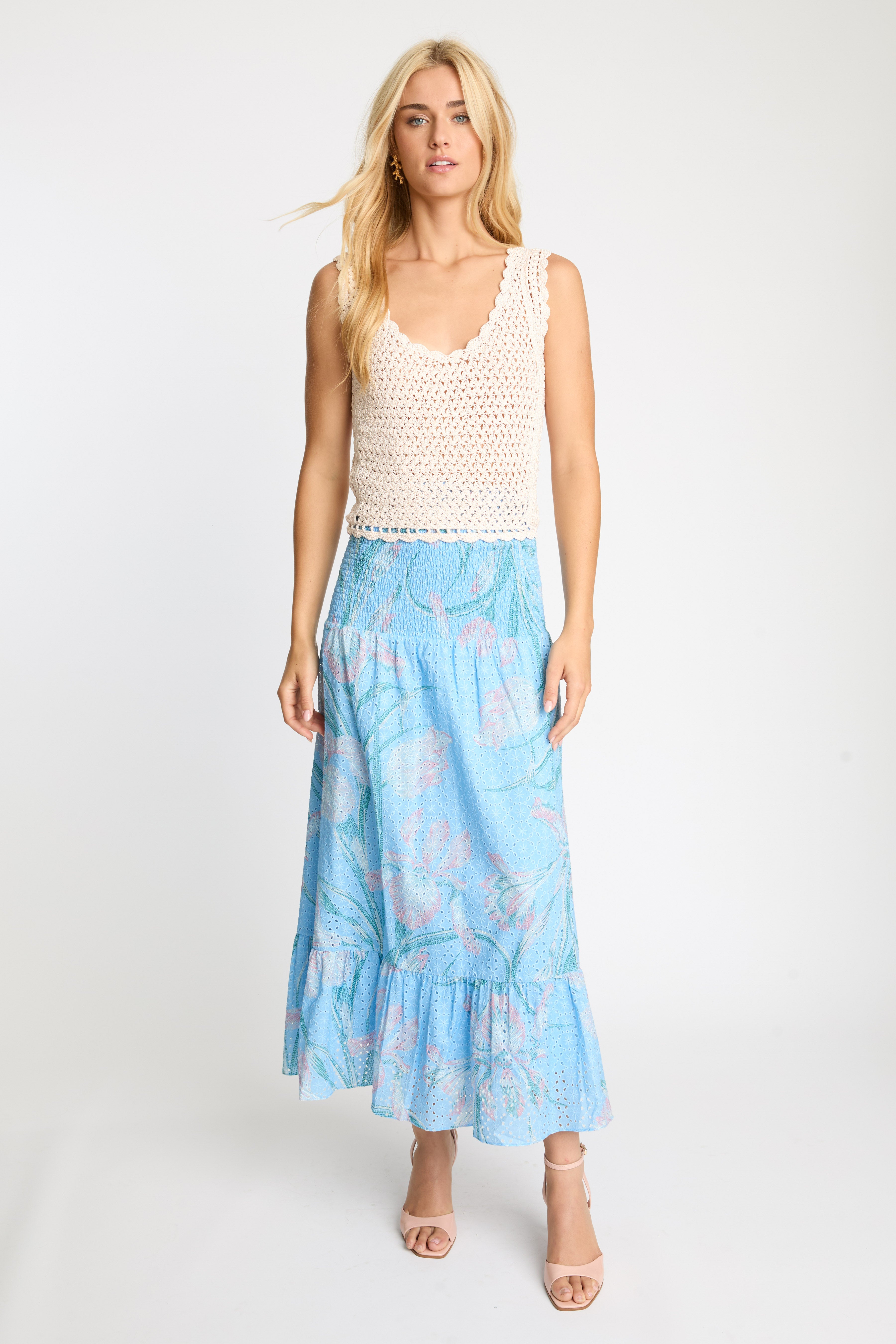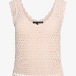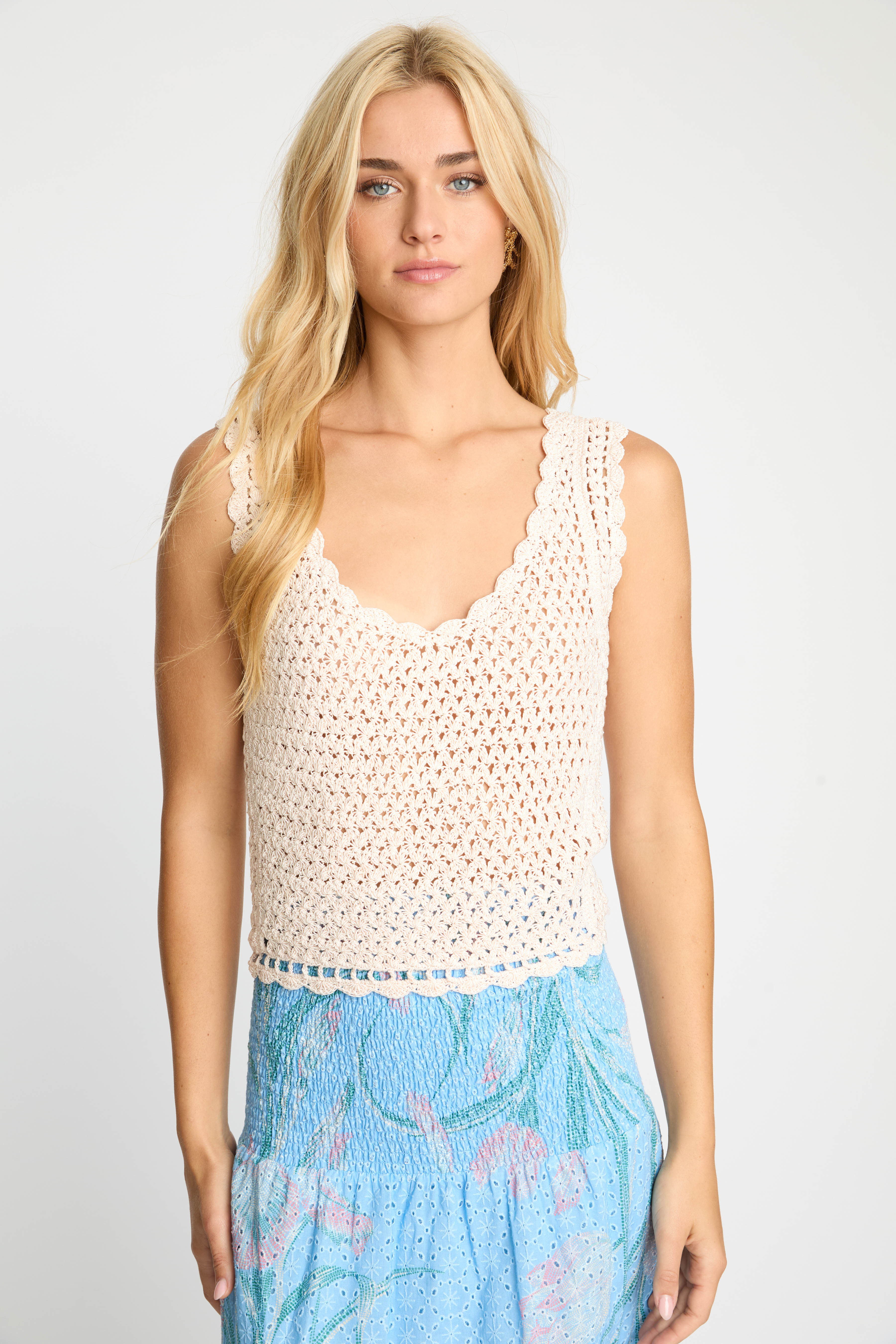 The Nori Top in Peach Dust is a sleeveless crochet tank designed for effortless, warm-weather style. Crafted with an airy open-knit texture, this piece features a soft V-neckline finished with delicate scalloped edges, highlighting its feminine detail and relaxed charm. The peach dust hue adds a subtle warmth that feels both fresh and timeless.